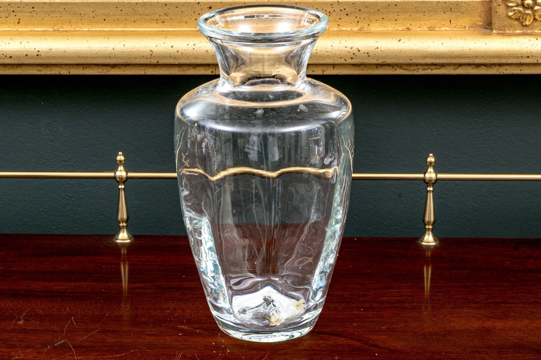 A quality Simon Pearce "Shelburne" crystal vase showcasing a flared rim over a subtly tapered neck leading to an urn form body on a flat foot. Marked near the base.