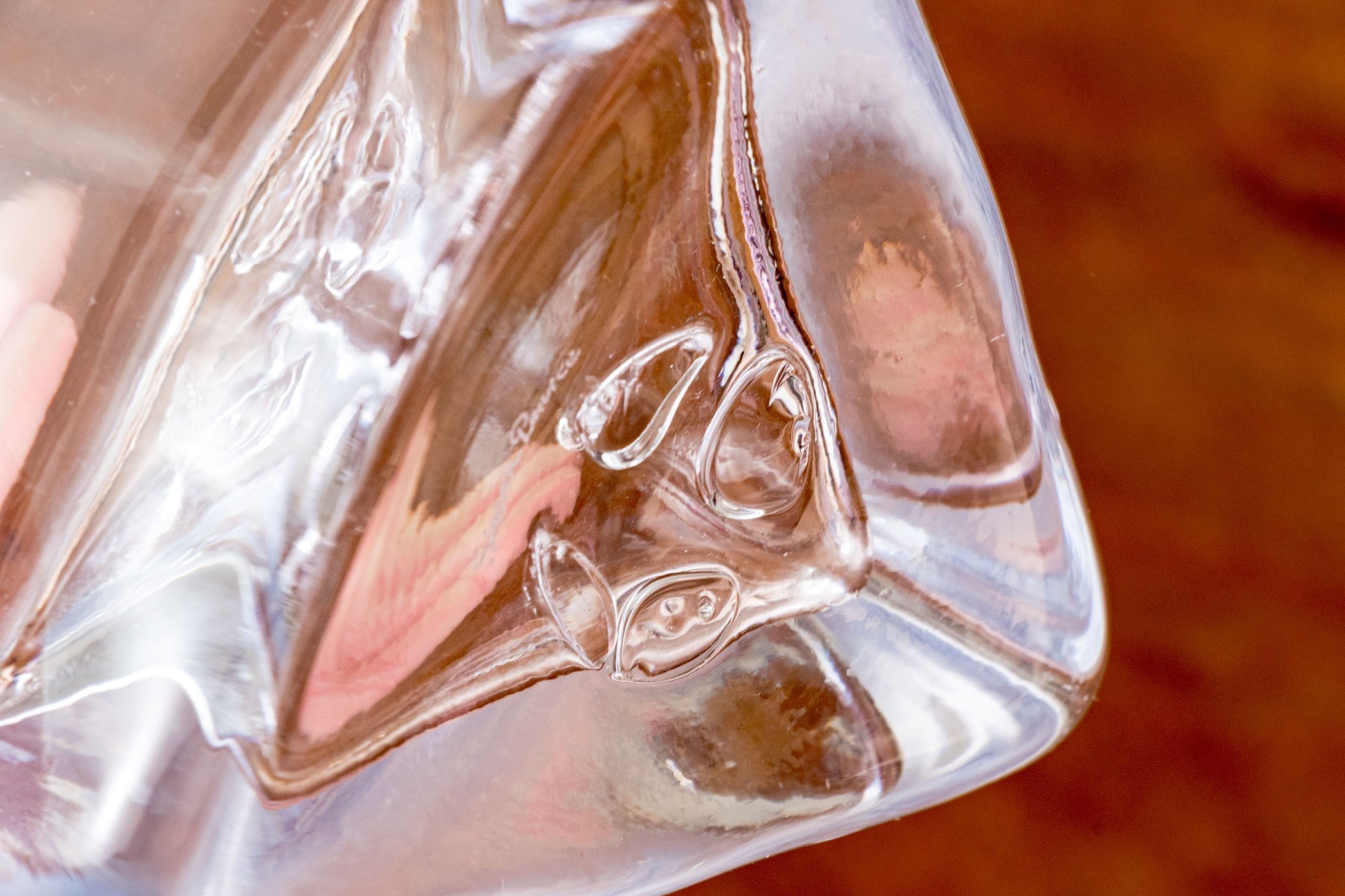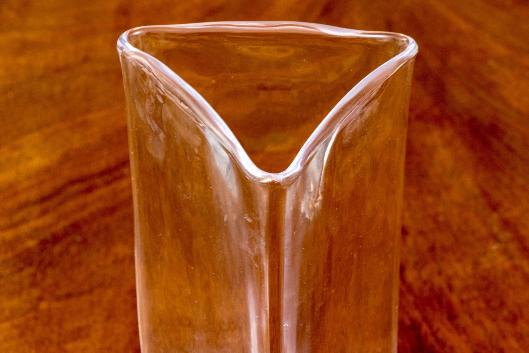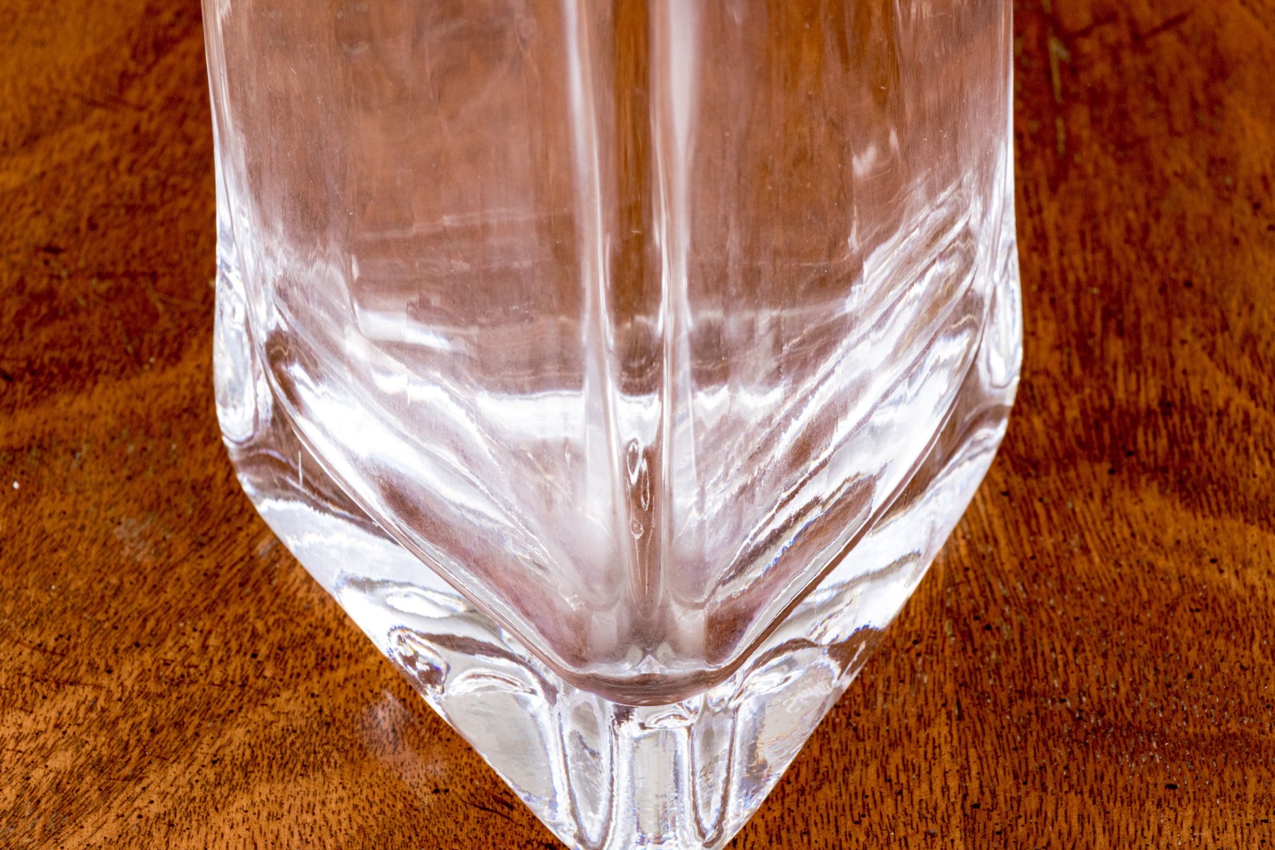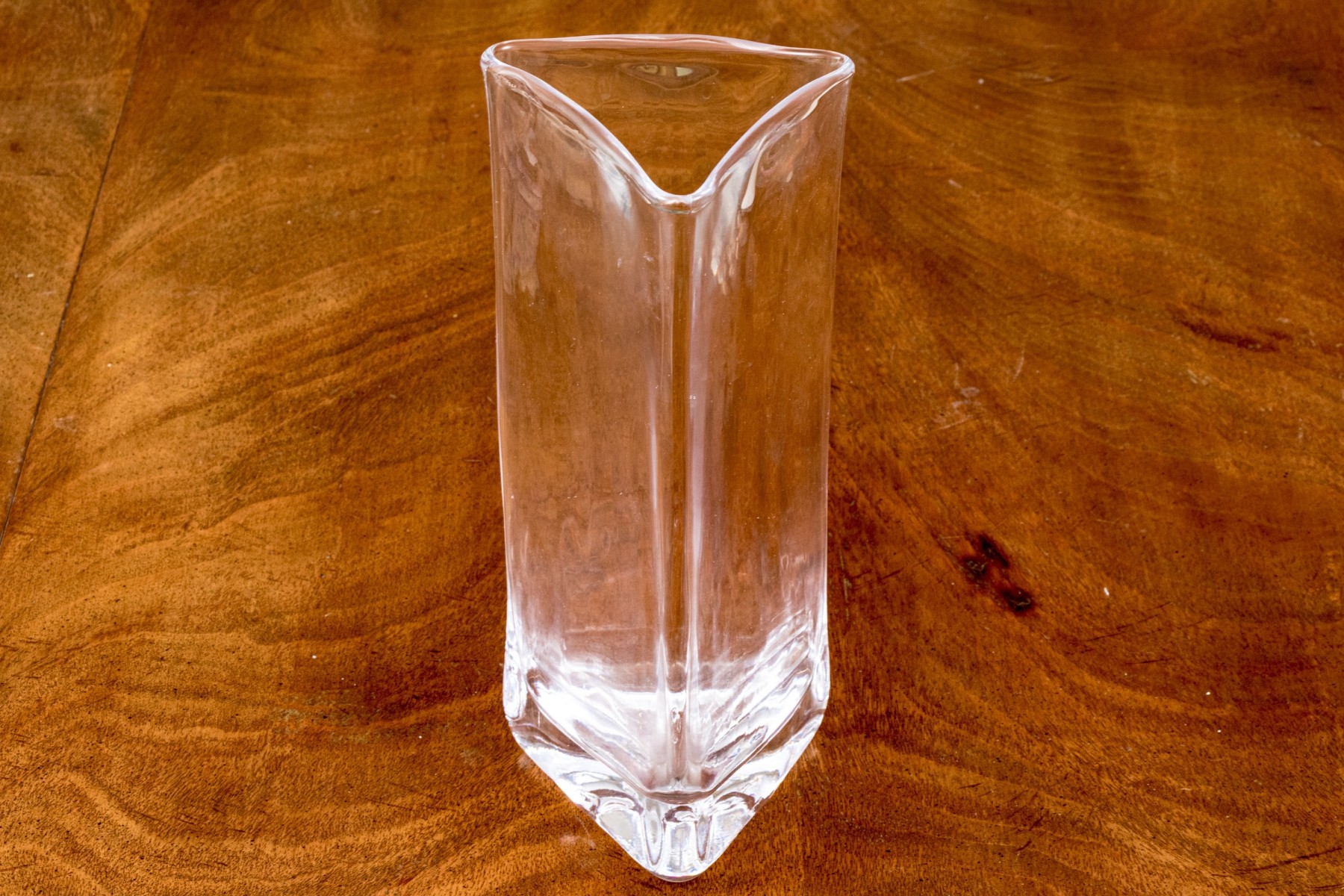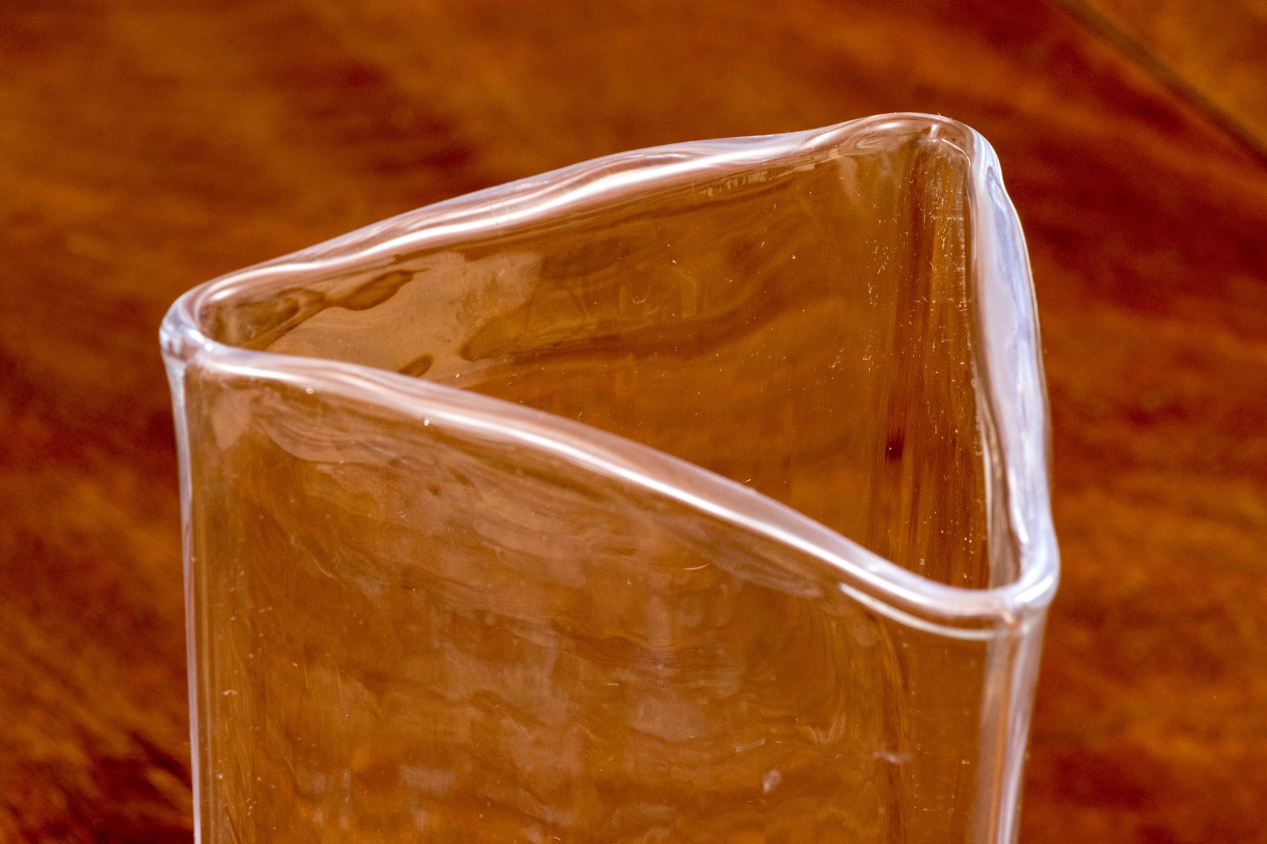 A stylish Simon Pearce crystal vase with a tall, sleek triangular form rounded at the corners. Marked underfoot.