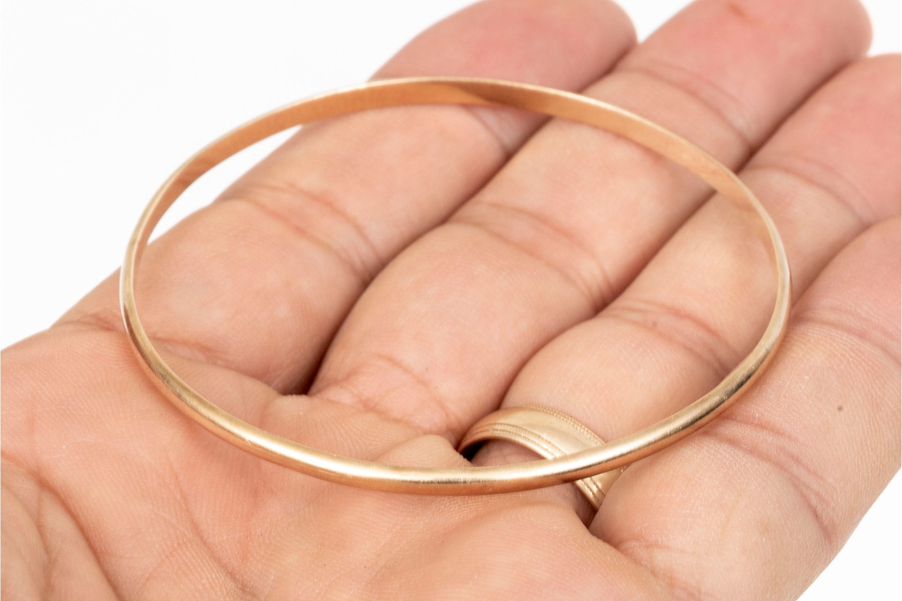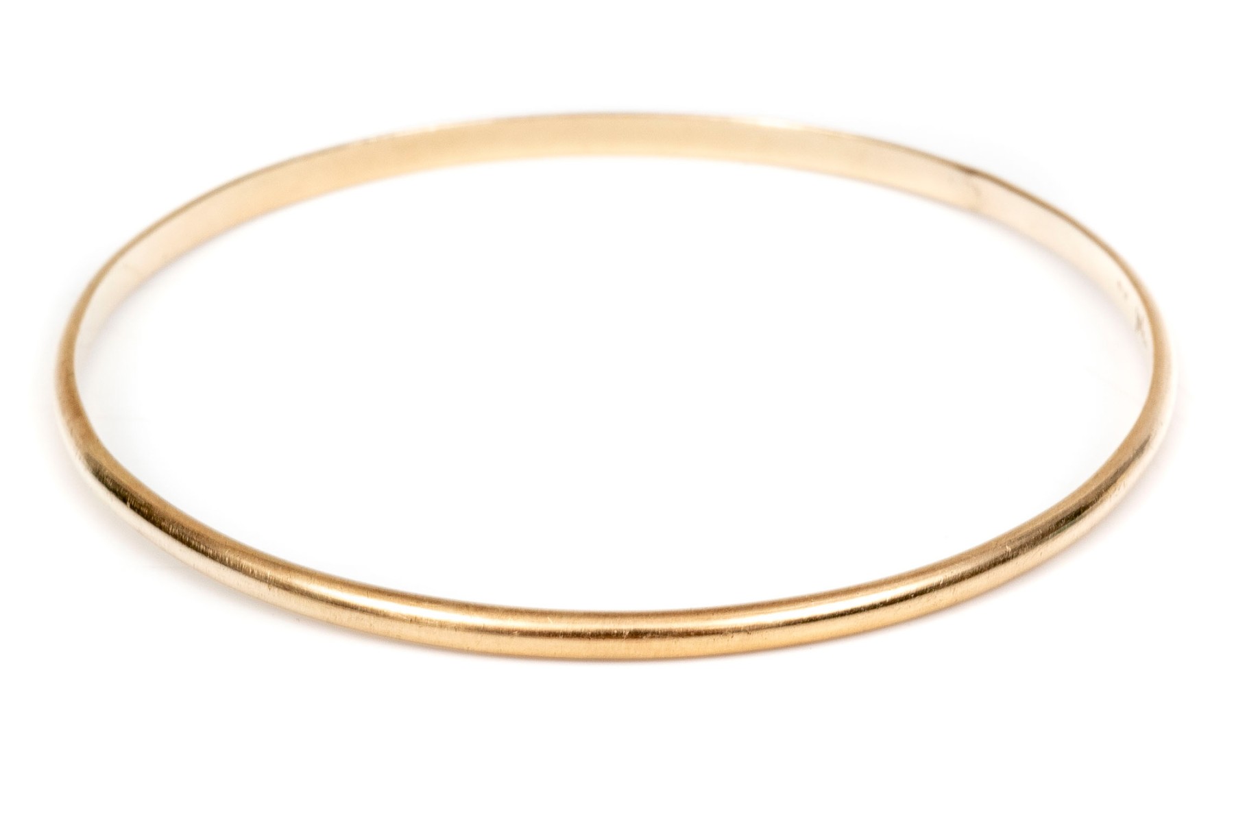 A simple 14K yellow gold bangle bracelet with a smooth polished finish.