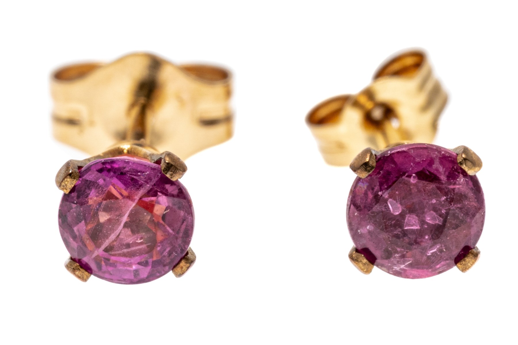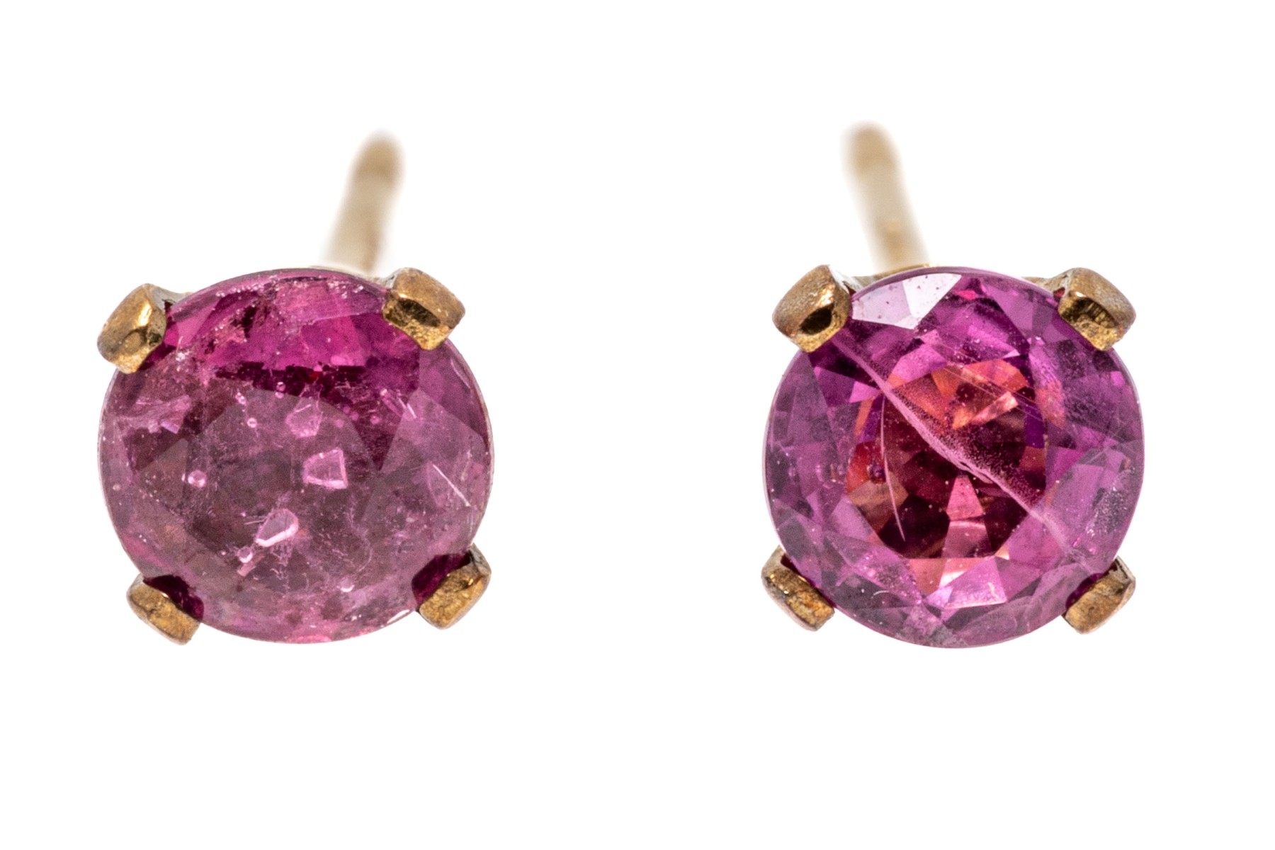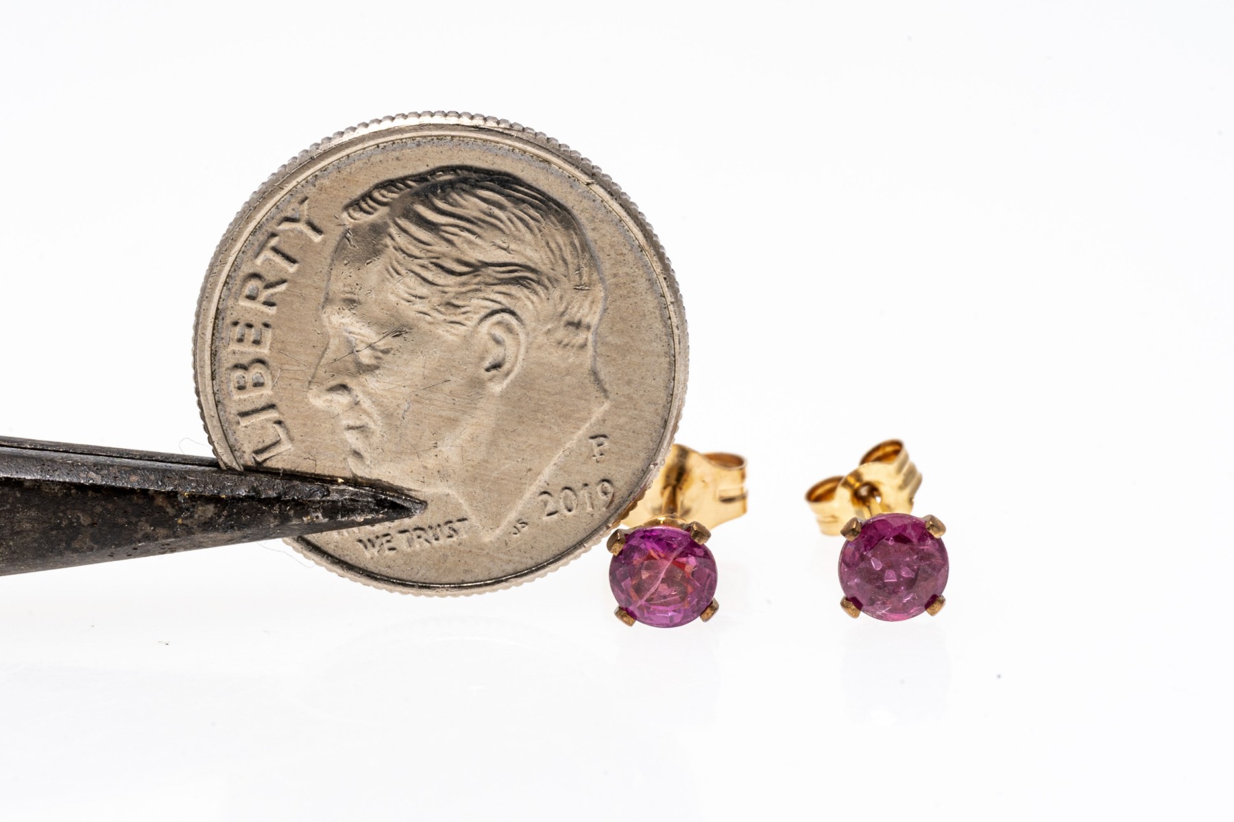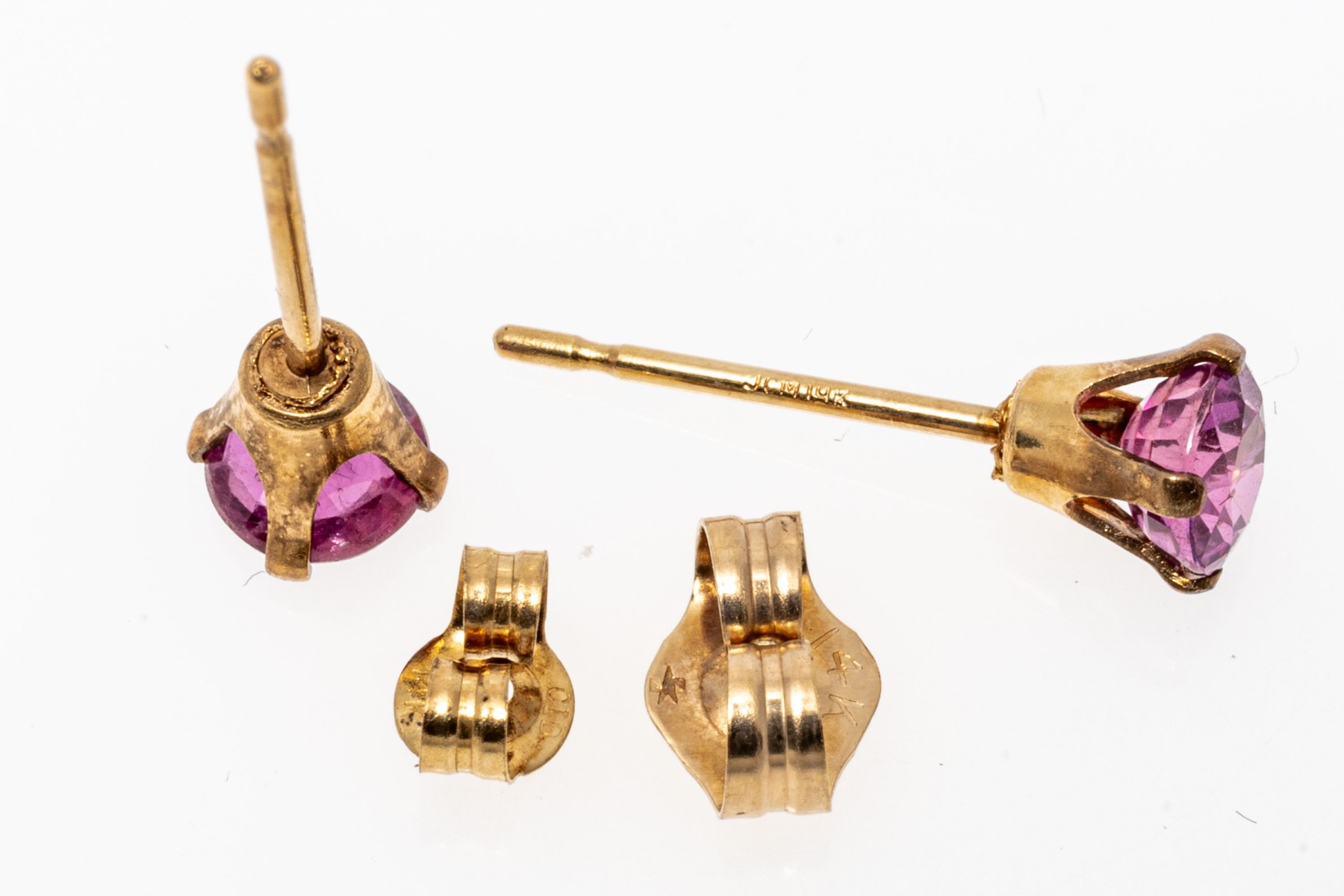 Simple pair of 14K yellow gold earrings. These earrings are prong set with round cut pink sapphires, approximately 0.24 TCW. Post and clutch backings.