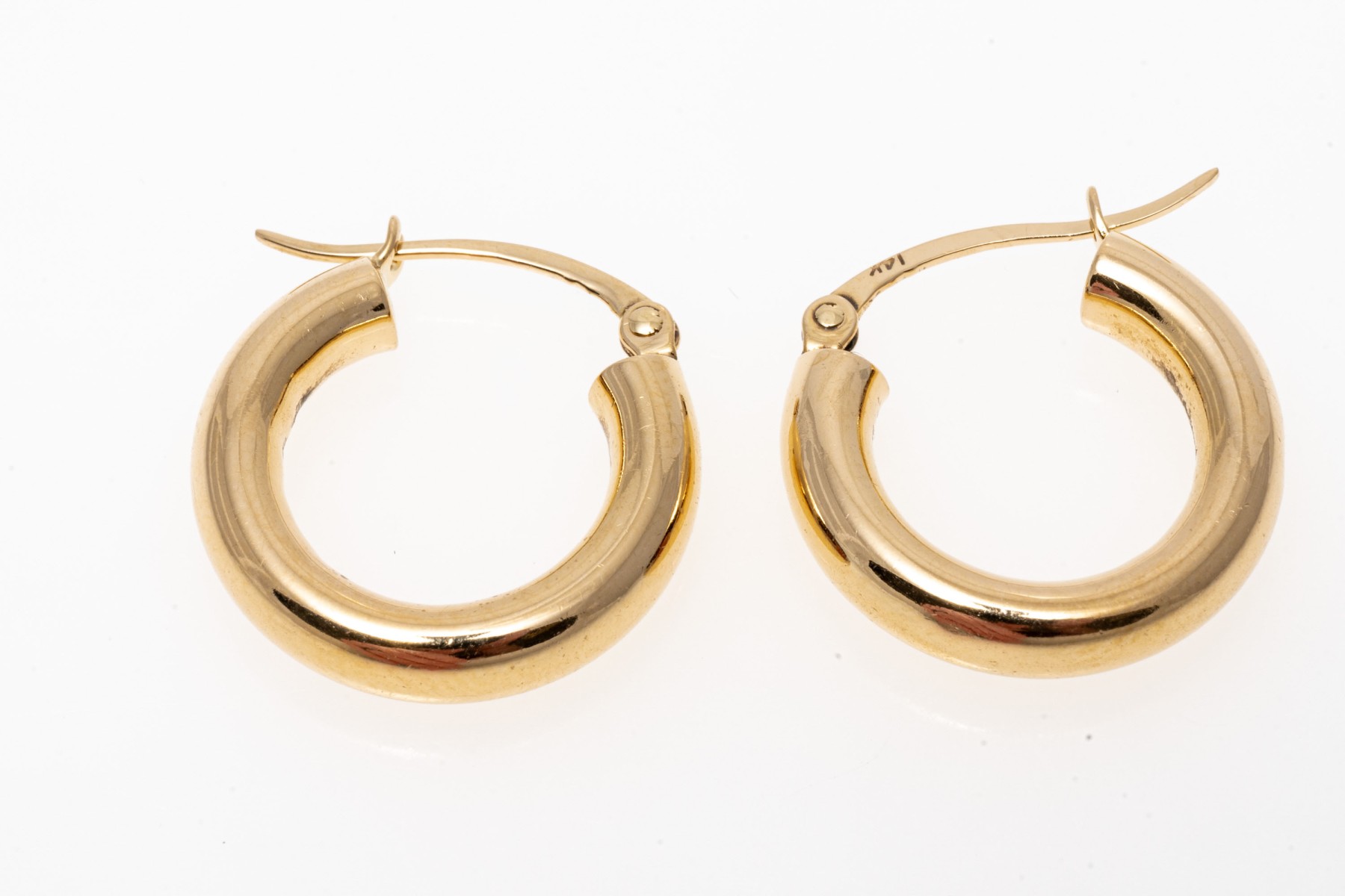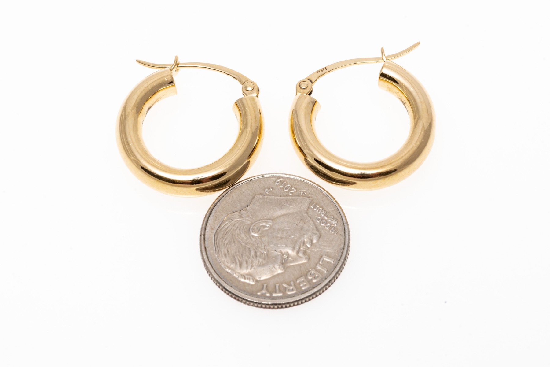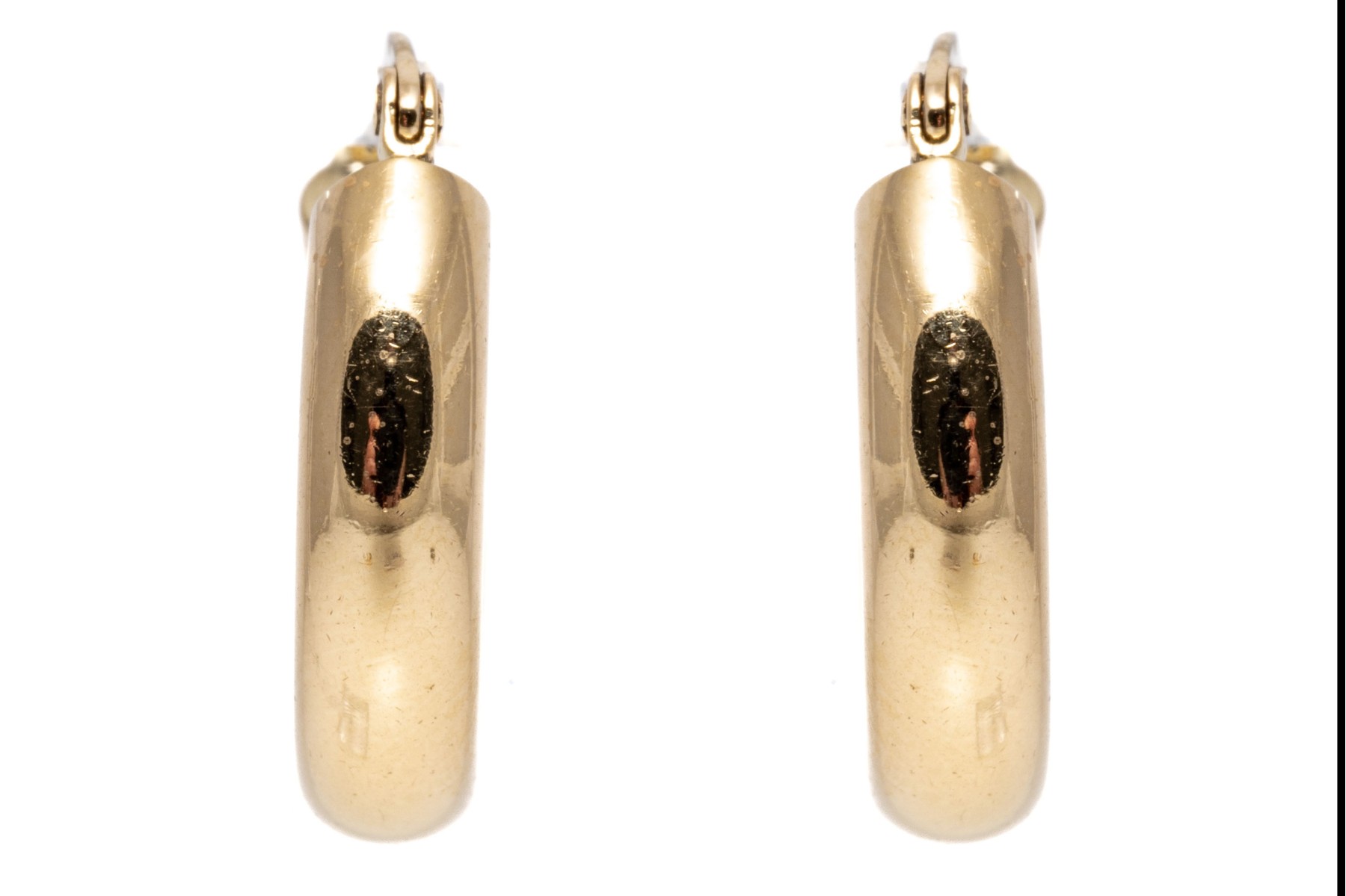 Simple pair of 14K yellow gold hoop earrings with a polished finish. Leaver post backings.
