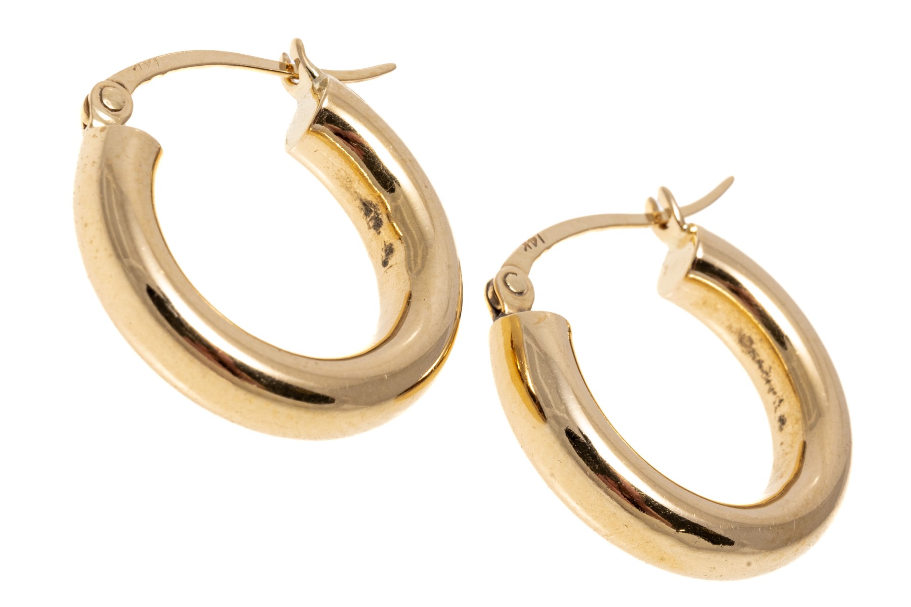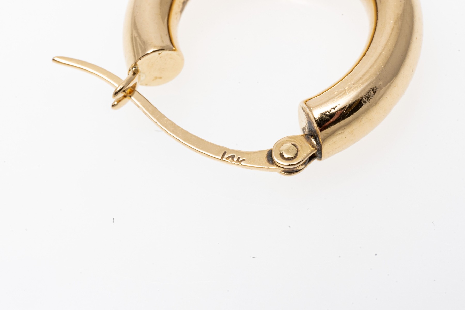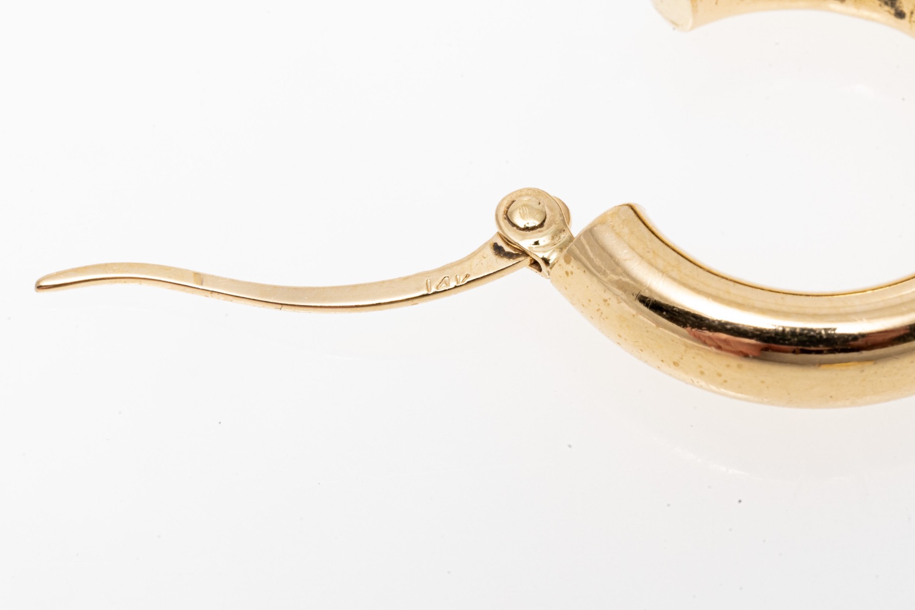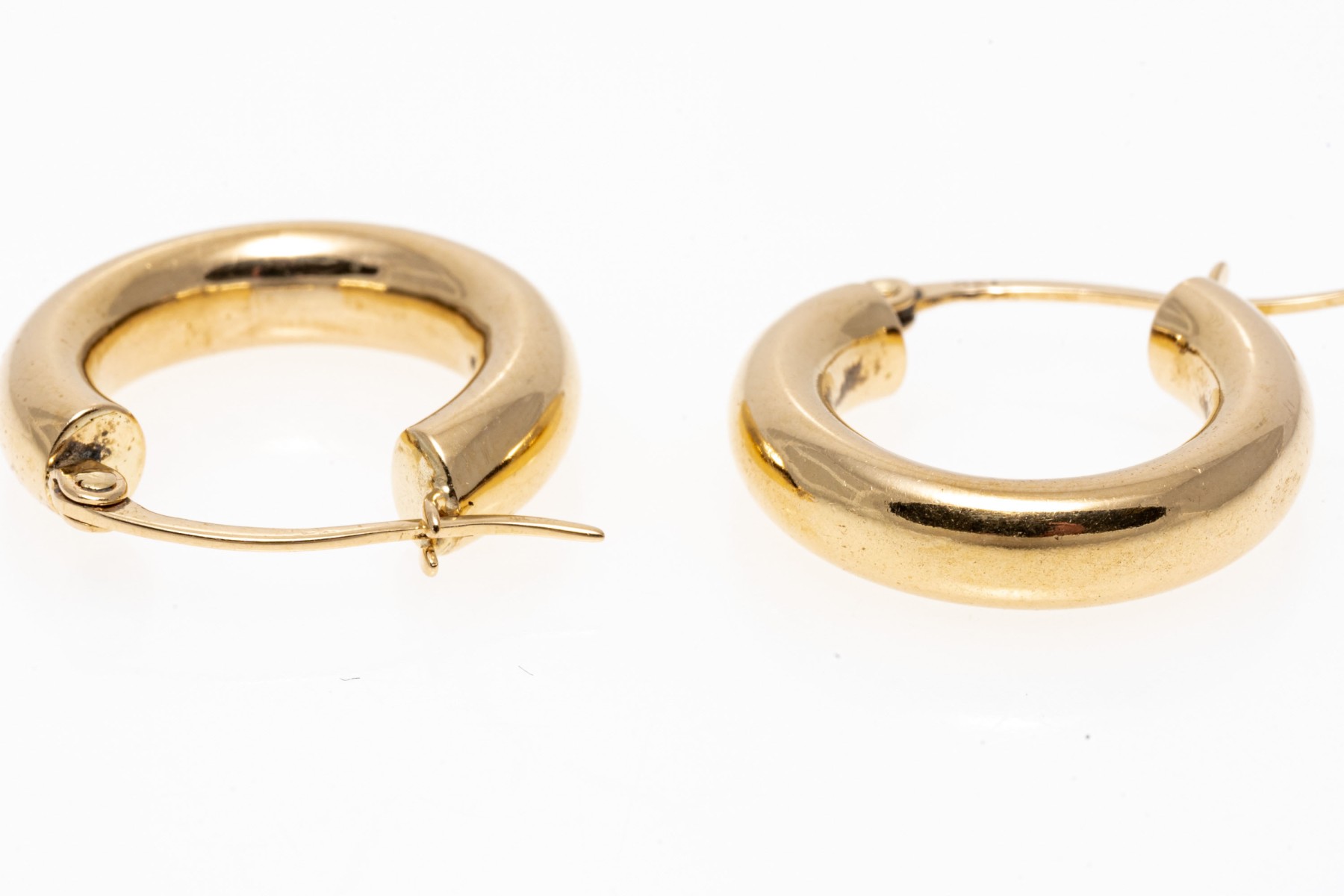 Simple pair of 14K yellow gold hoop earrings with a polished finish. Leaver post backings.
