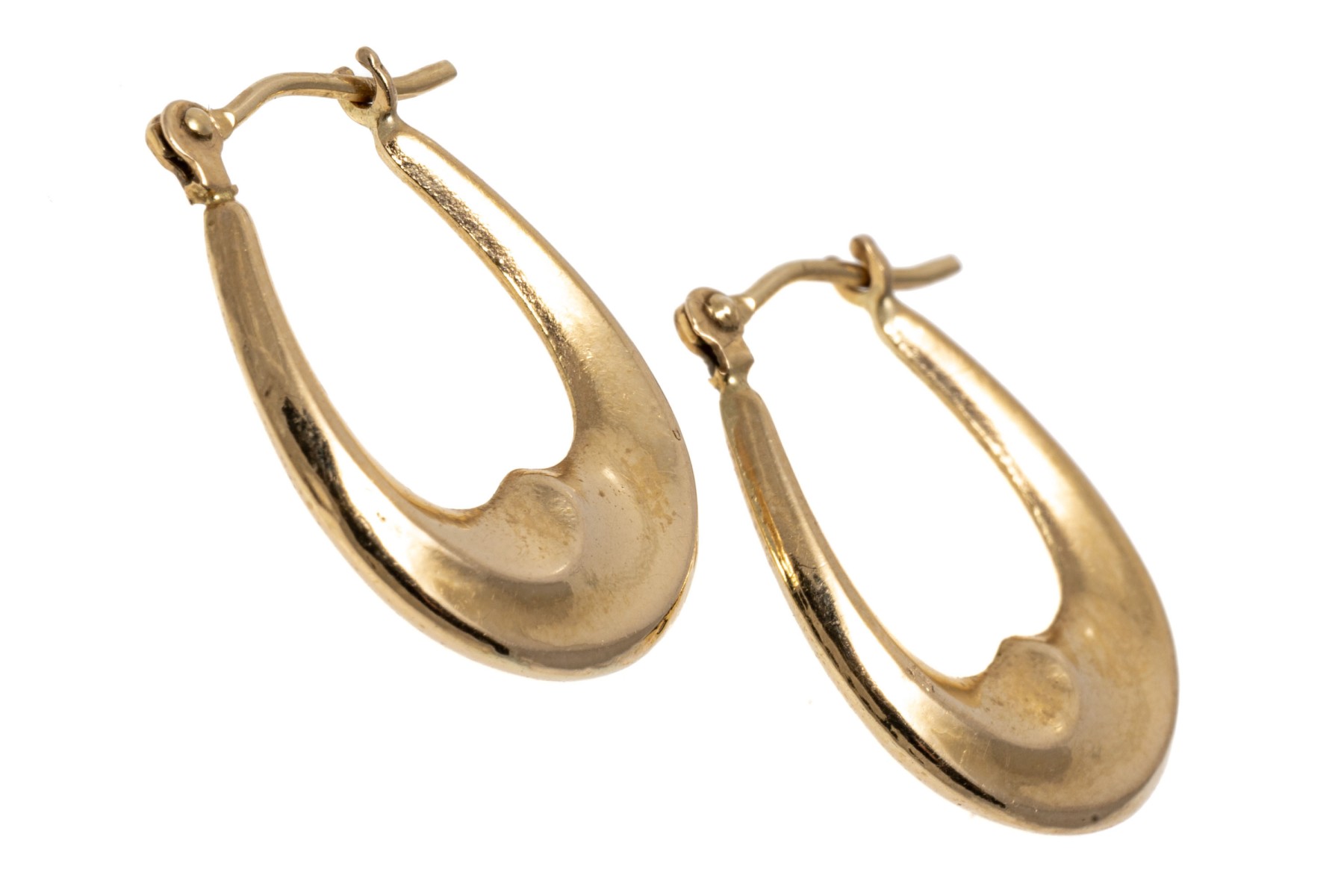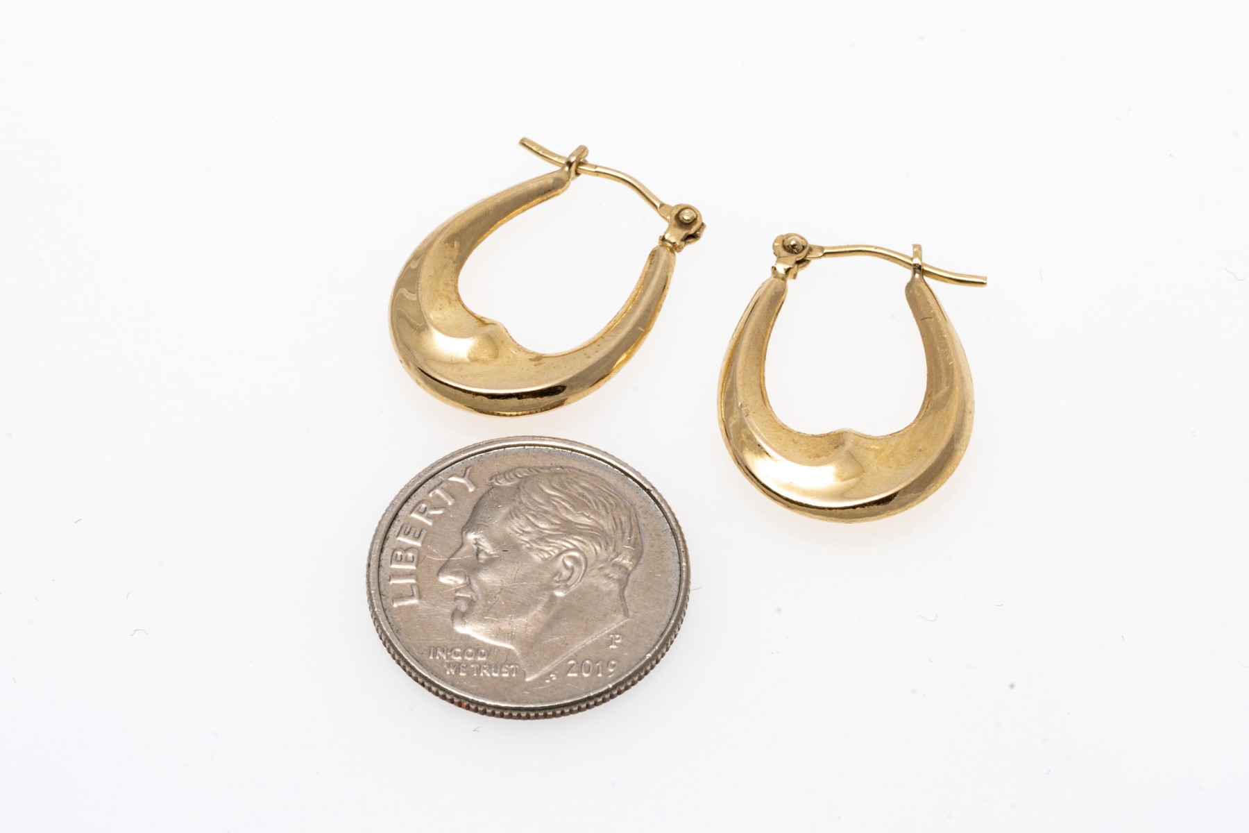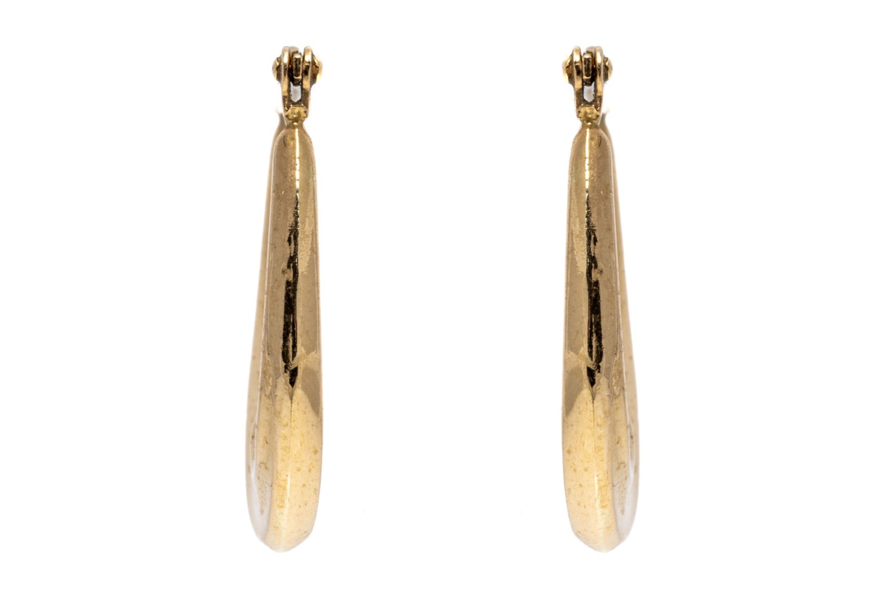 A pair of 14K yellow gold elongated hoop earrings. The earrings have a smooth polished design with leaver post backings.
