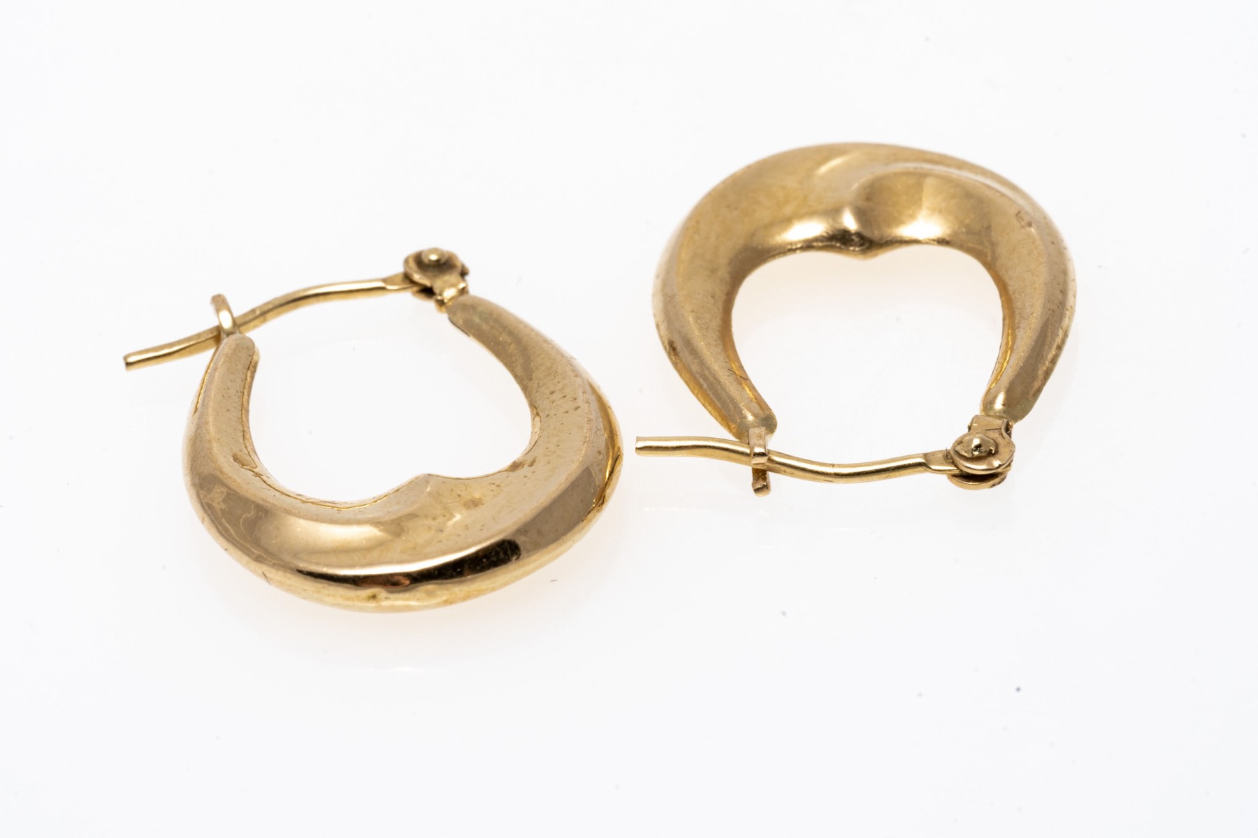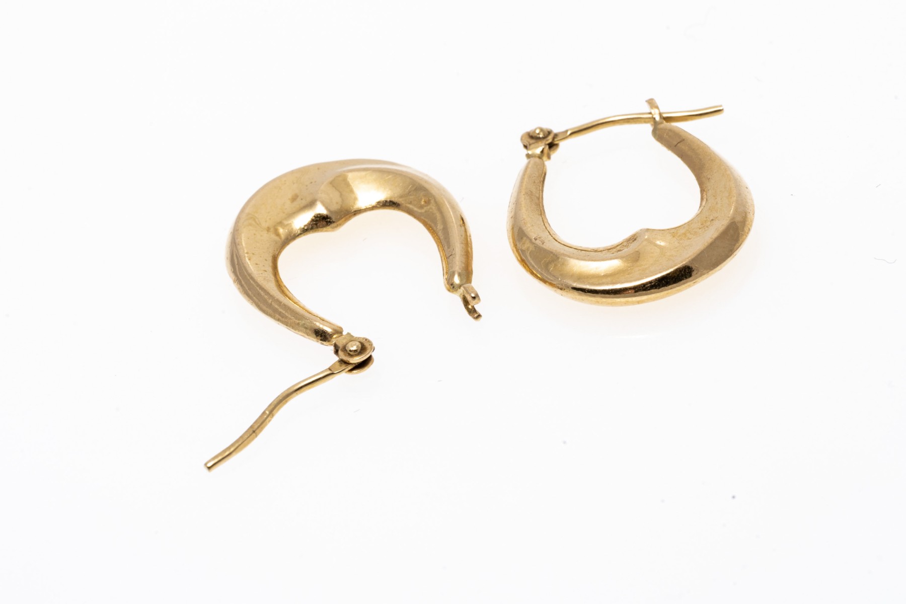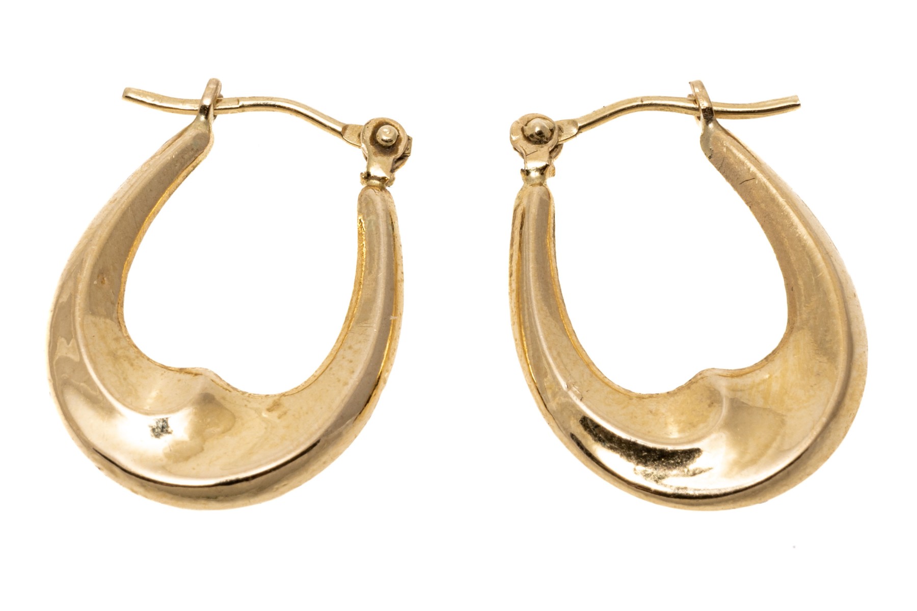 A pair of 14K yellow gold elongated hoop earrings. The earrings have a smooth polished design with leaver post backings.
