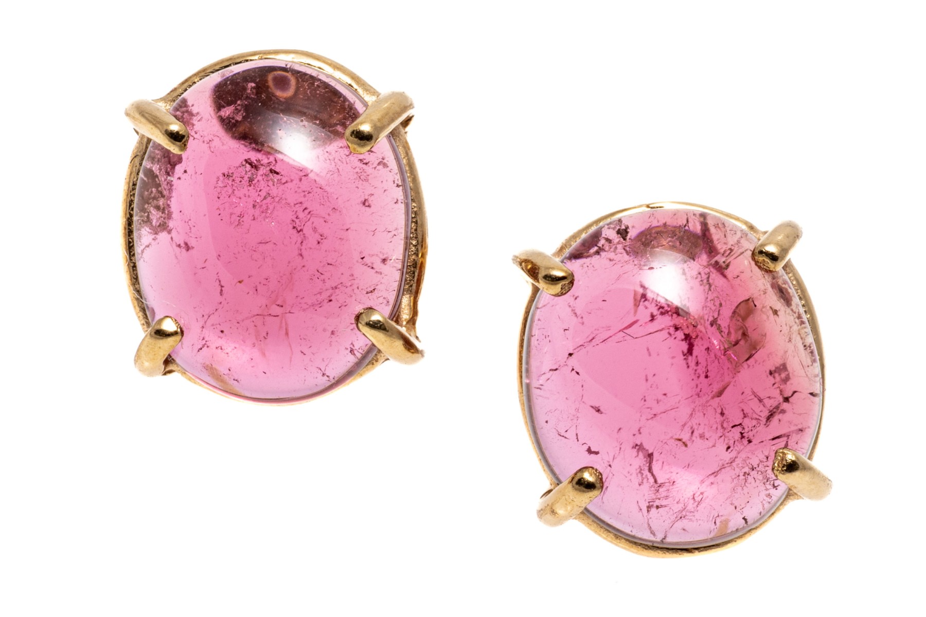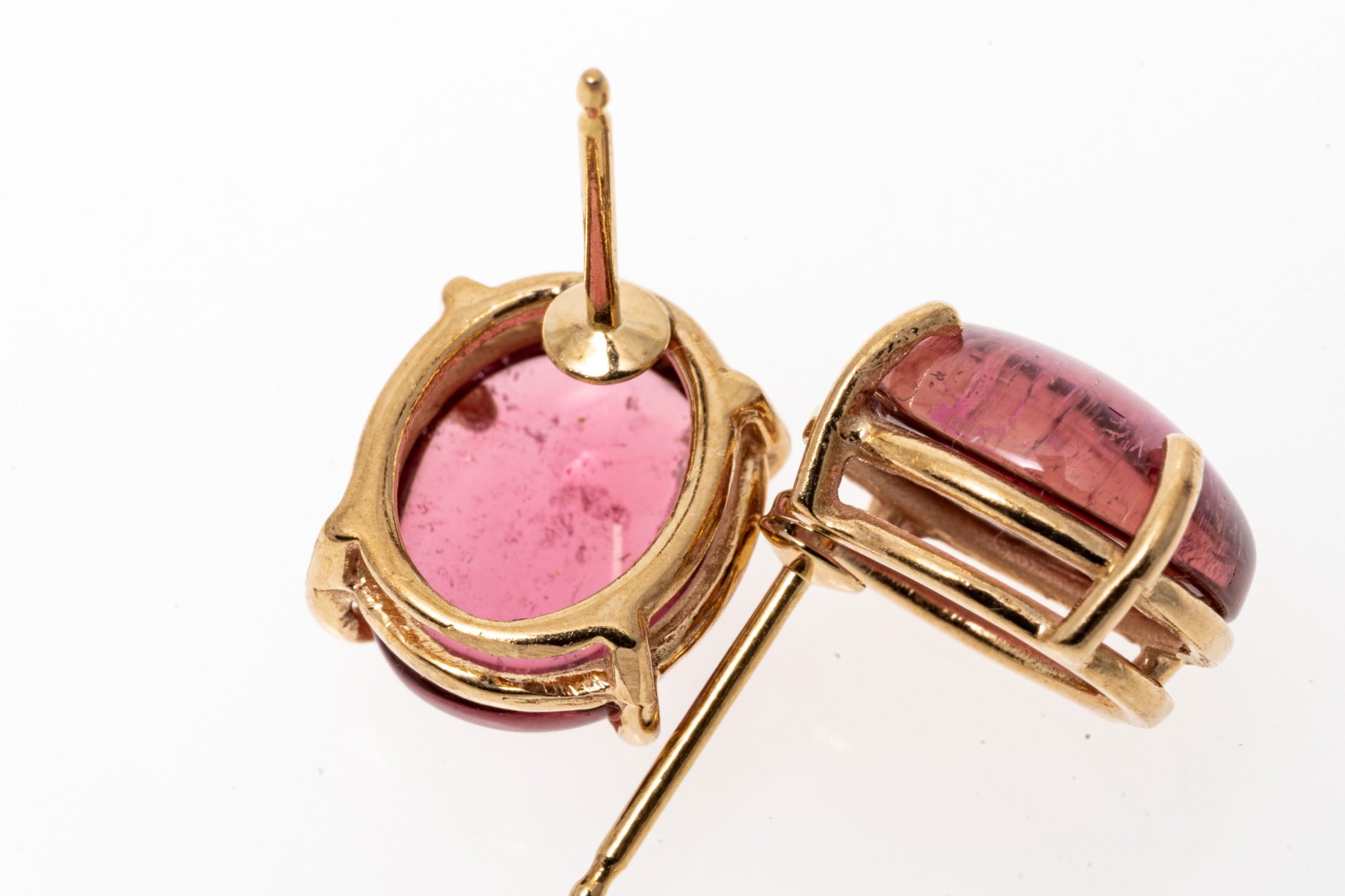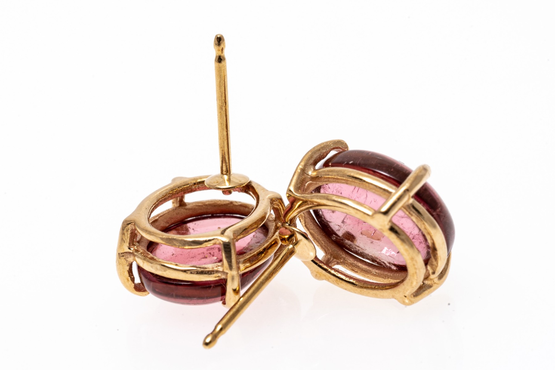 Simple pair of 14K yellow gold earrings. Set into the earrings are soft pink tourmaline stone with an oval cabochon cut. Tourmalines are approximately 4.36 TCW. Post and clutch backings.