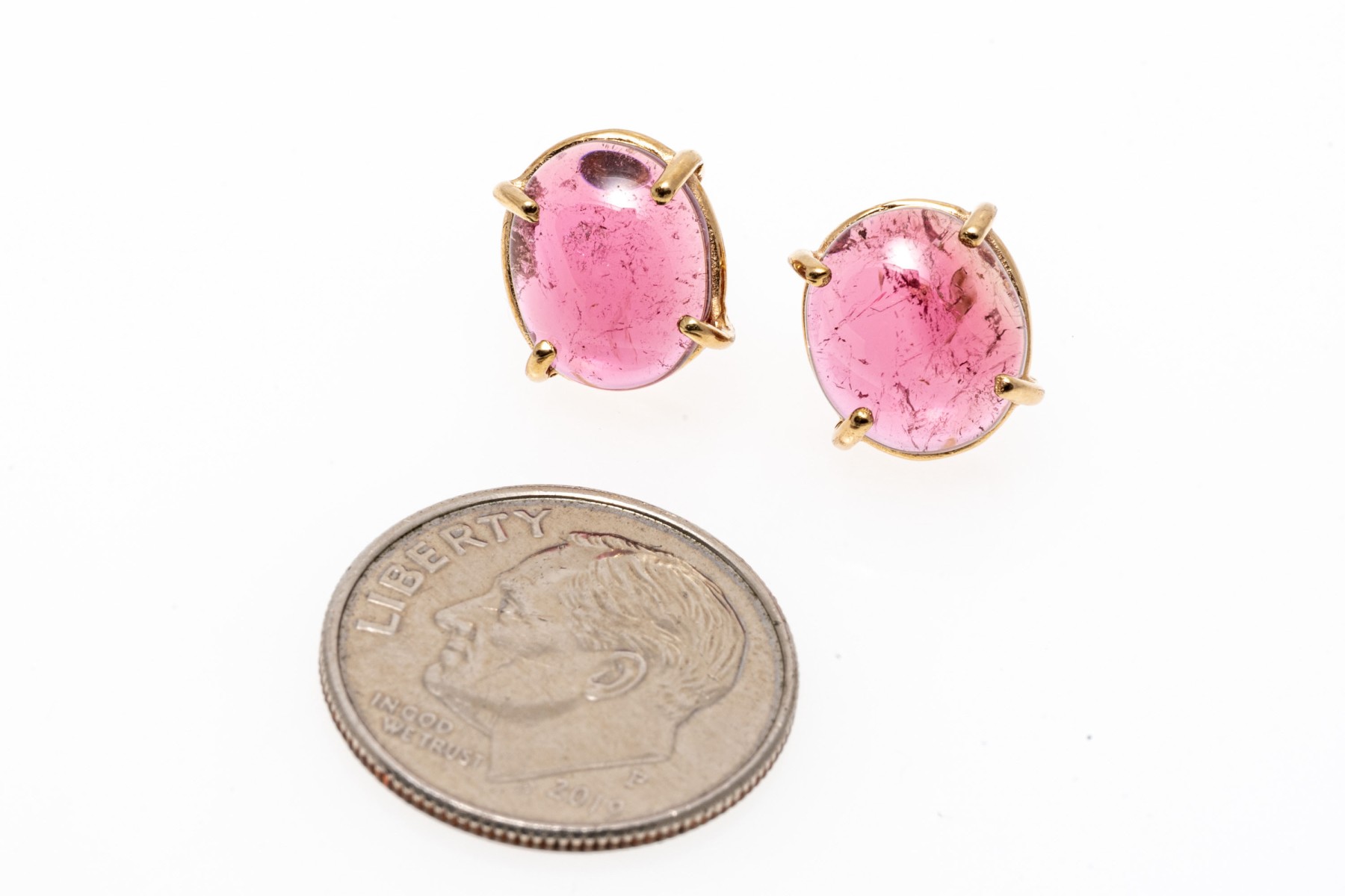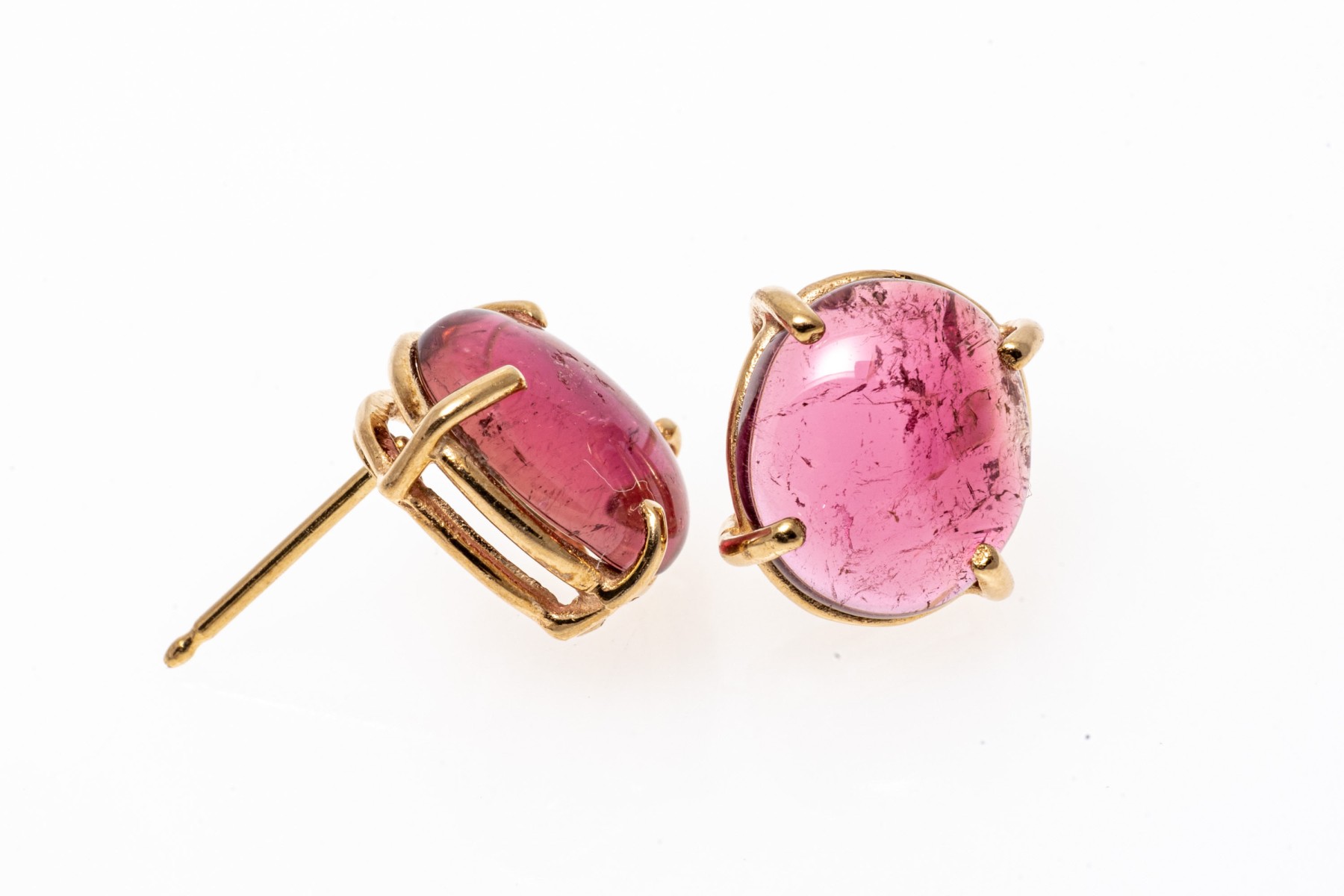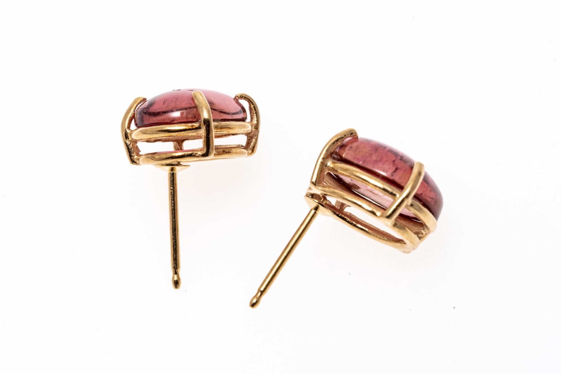 Simple pair of 14K yellow gold earrings. Set into the earrings are soft pink tourmaline stone with an oval cabochon cut. Tourmalines are approximately 4.36 TCW. Post and clutch backings.