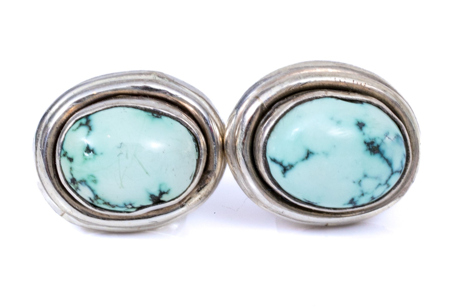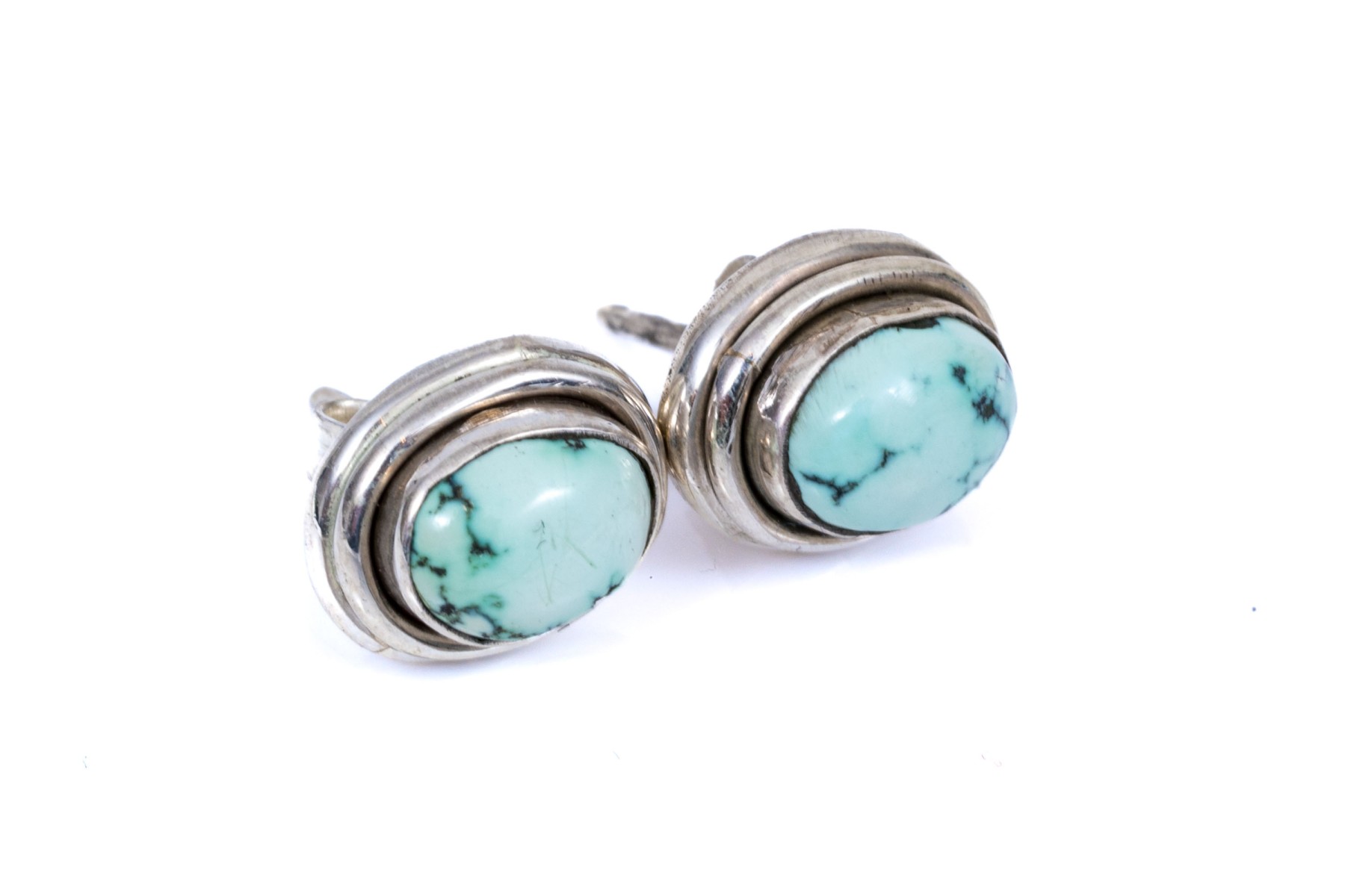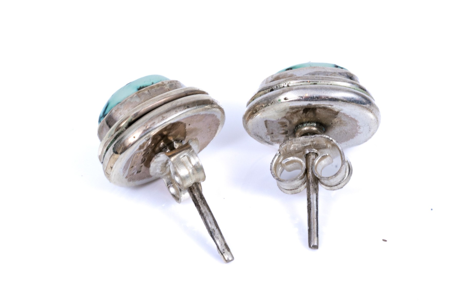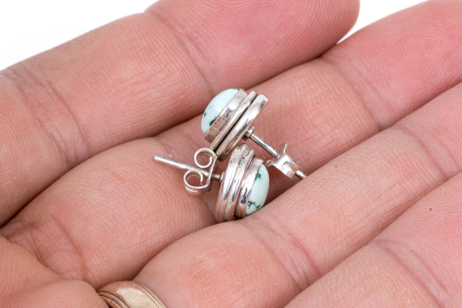 A pair of simple sterling silver studs featuring oval turquoise cabochons in bezel settings over ribbed frames. Finished with post and clutch backings.