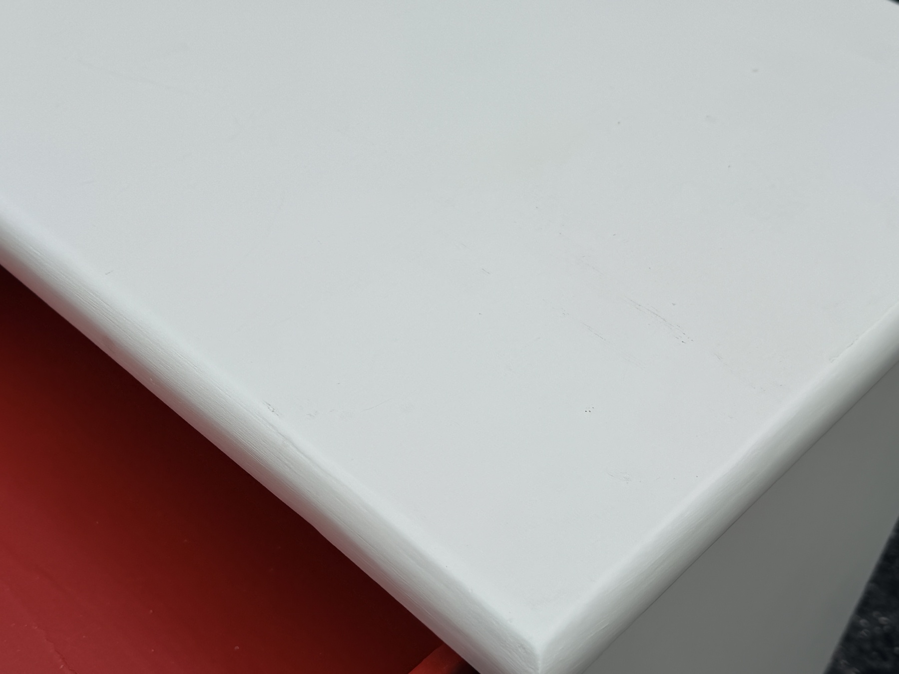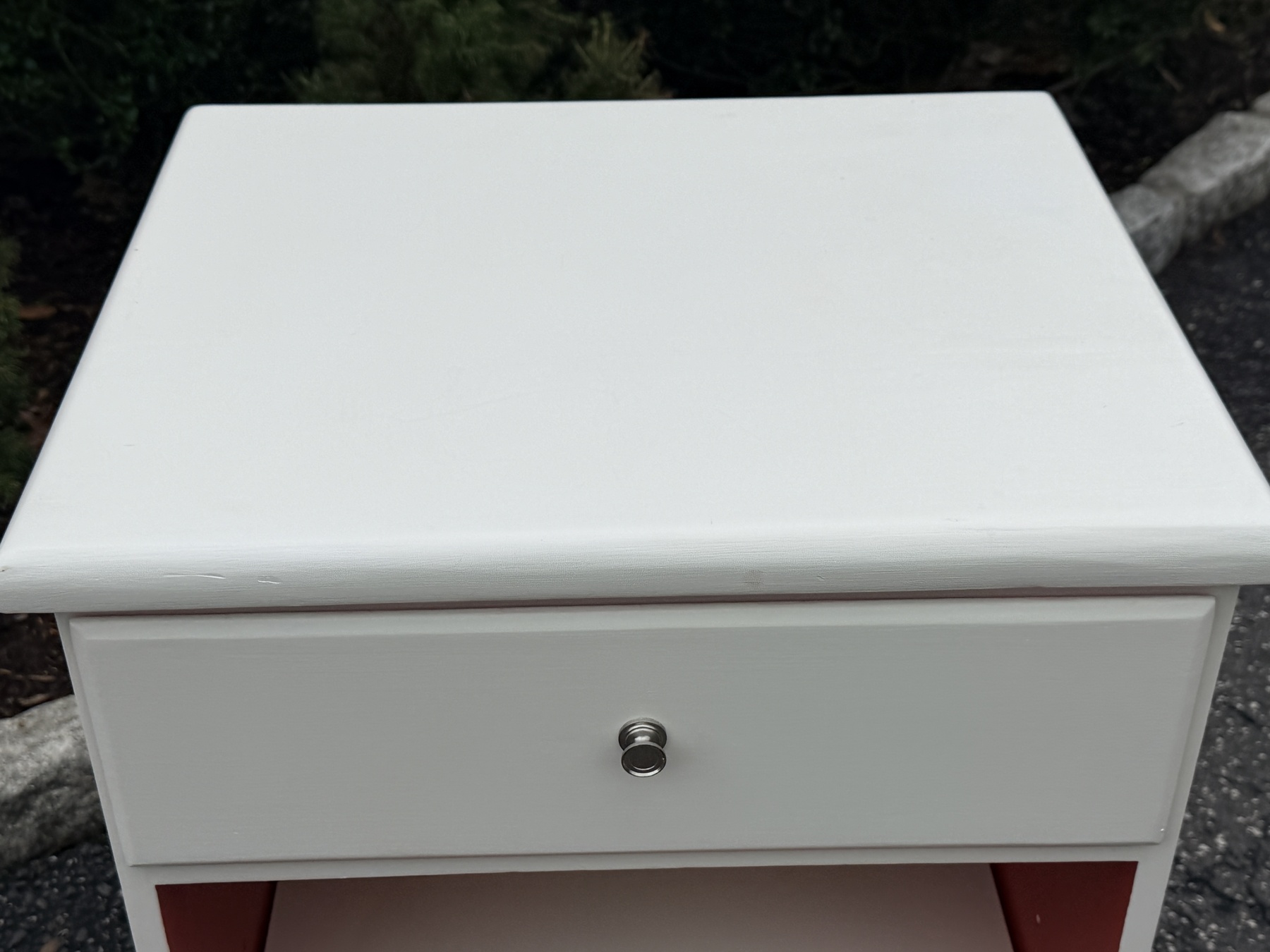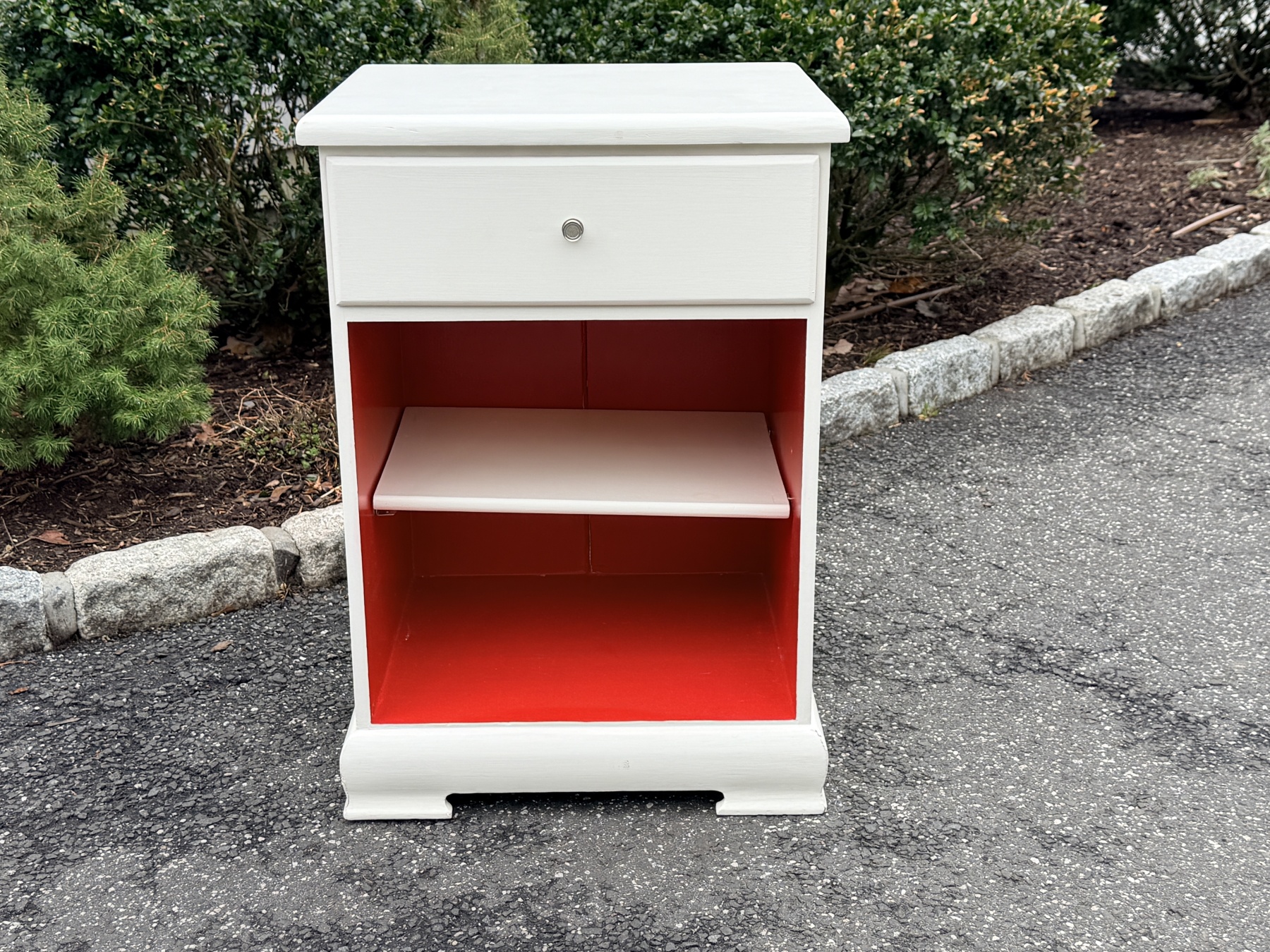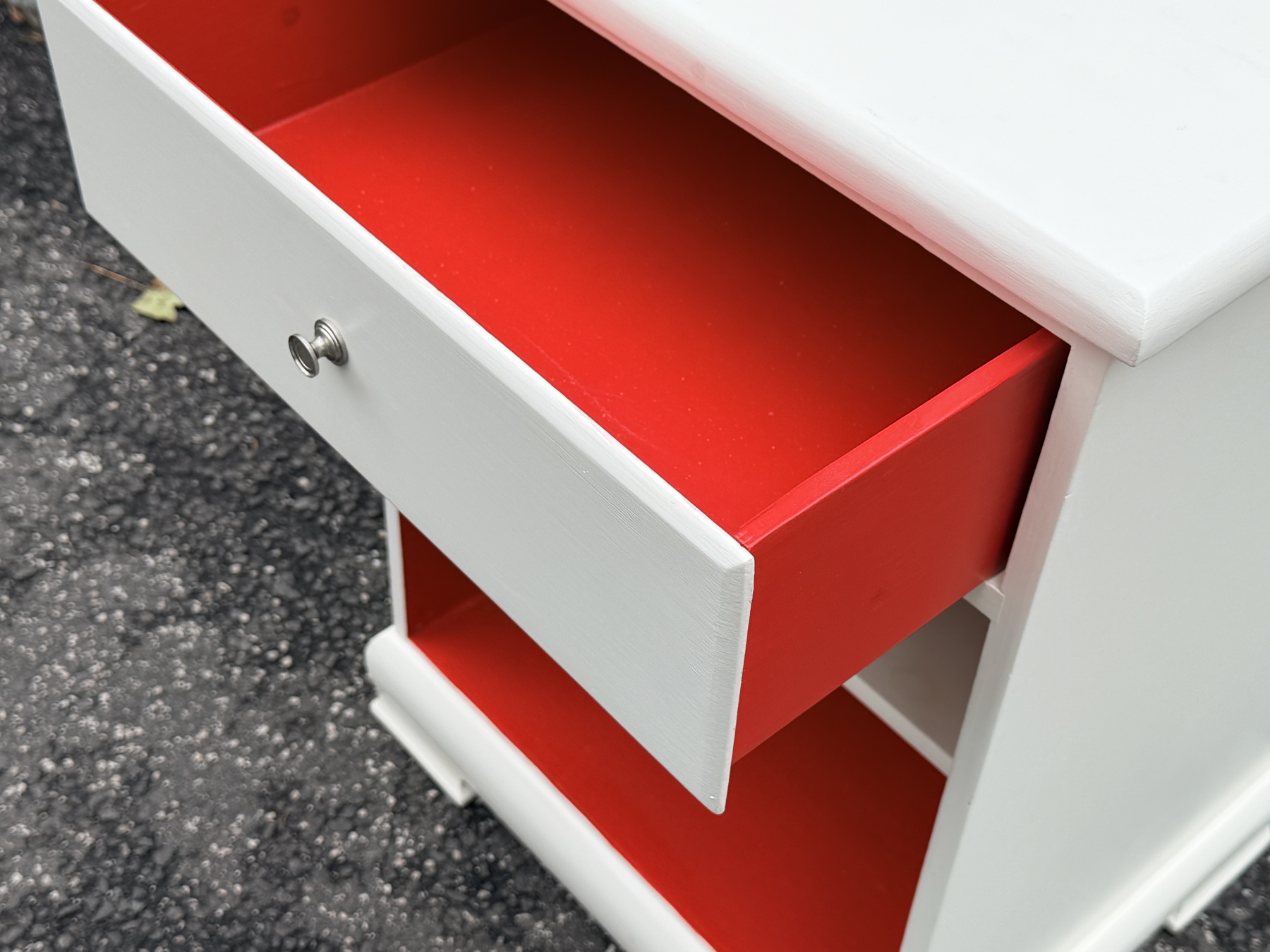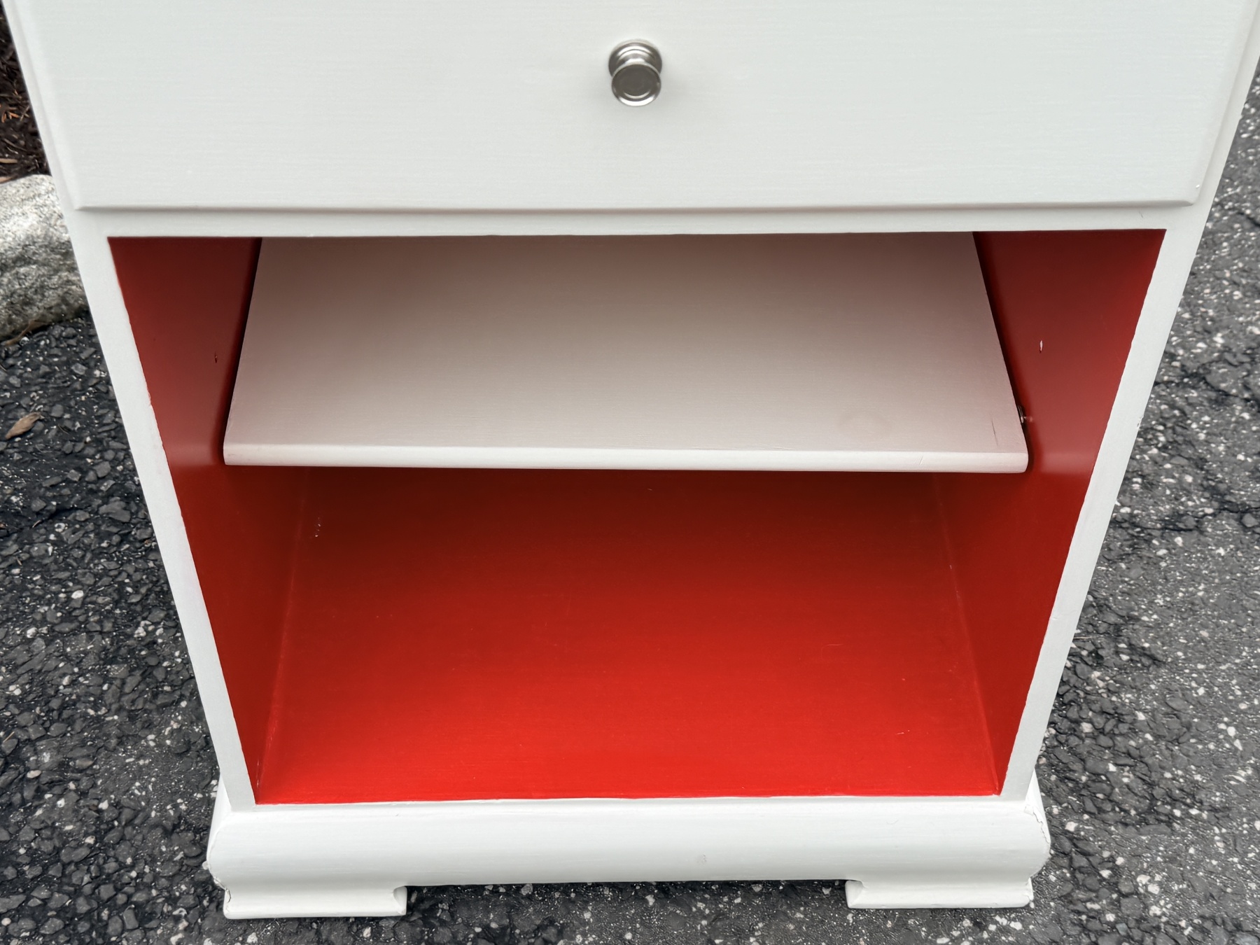 White finished frame with red finished interior open cabinet fitted with single white finished shelf. The case with single drawer with a pull to open and red finished interior.