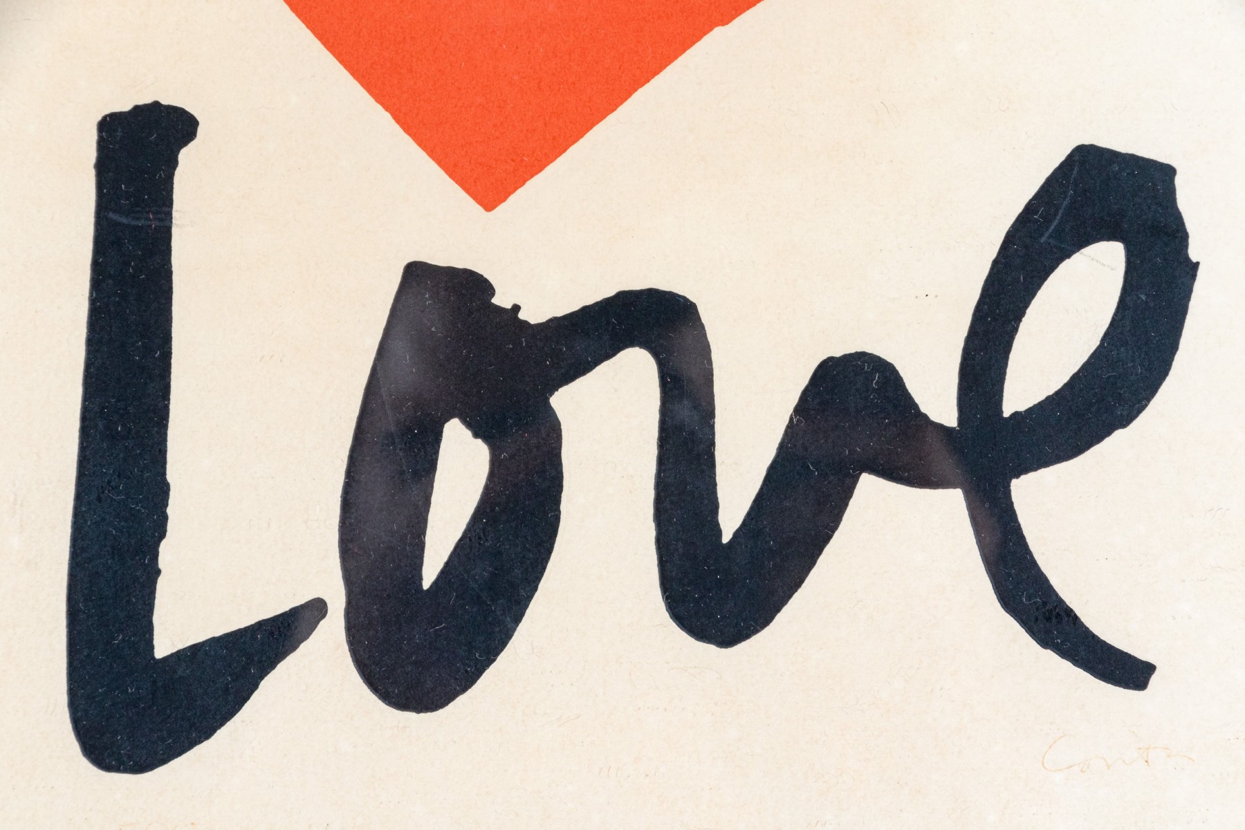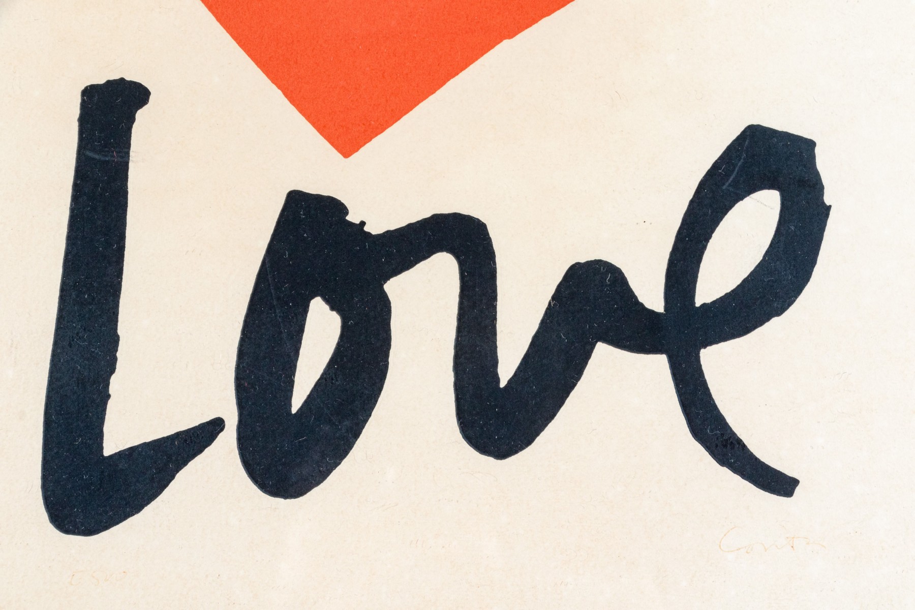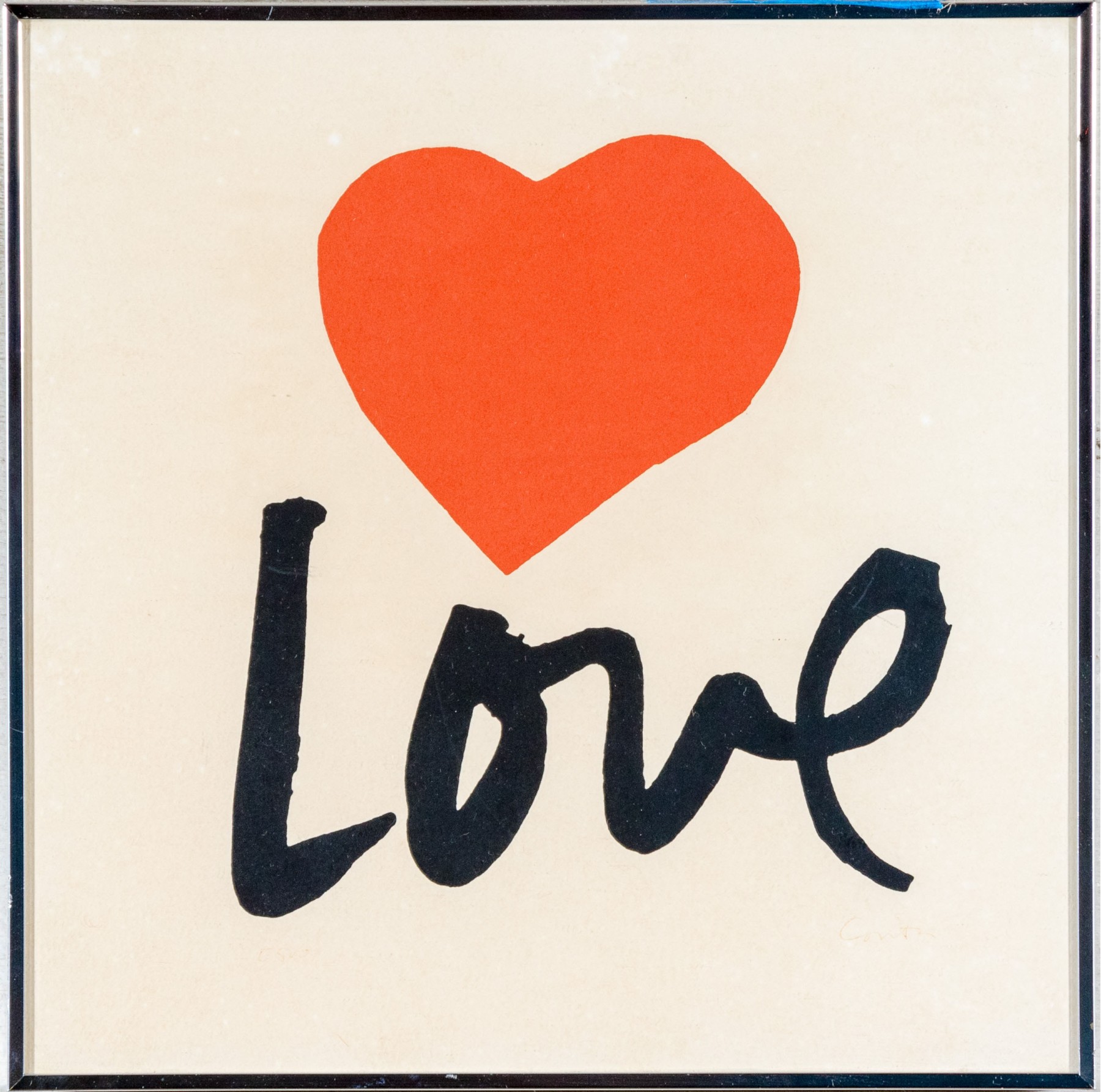 A small scale serigraph with Love in black script below a red heart. Unsigned. The artist is known for social justice artworks and her printmaking. Presented in a metal frame with glass.