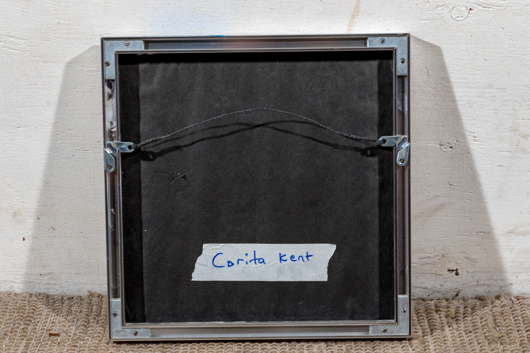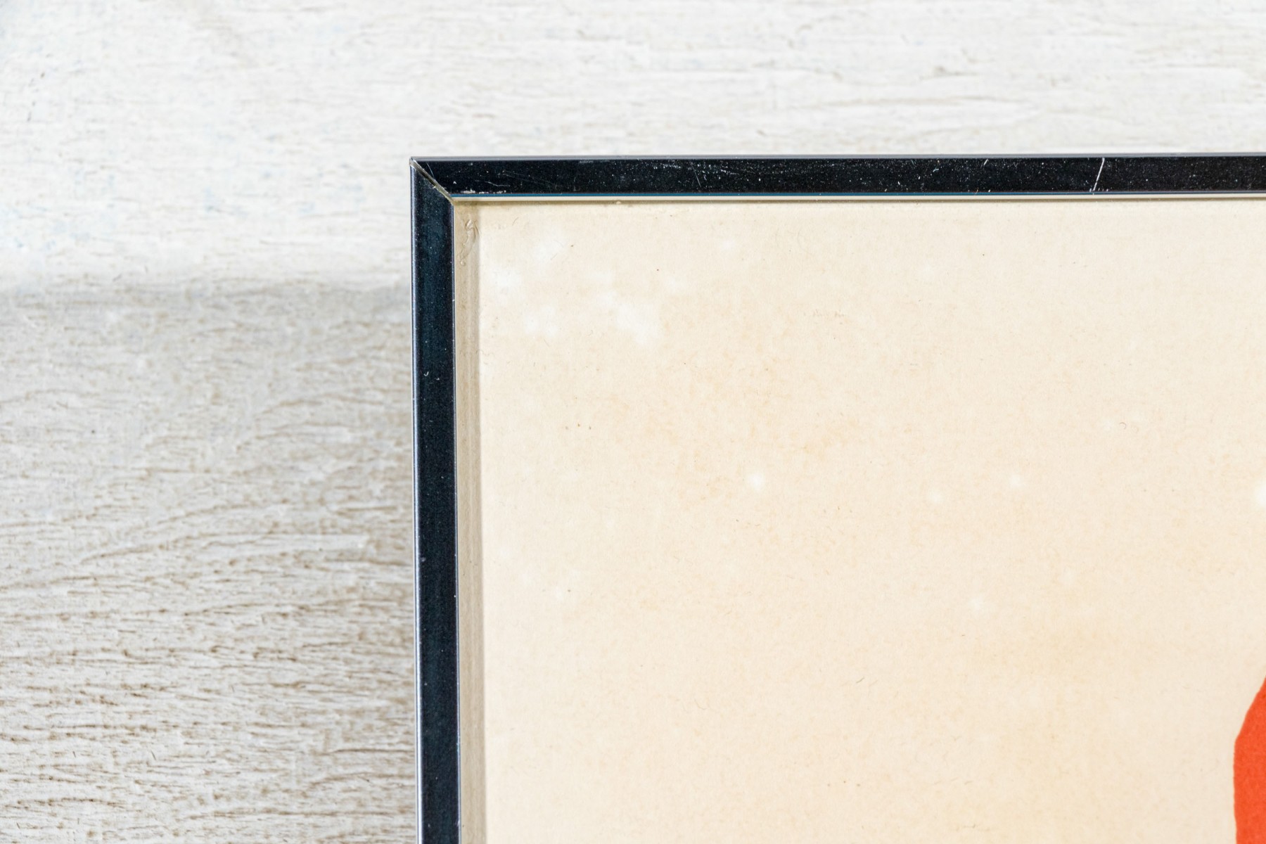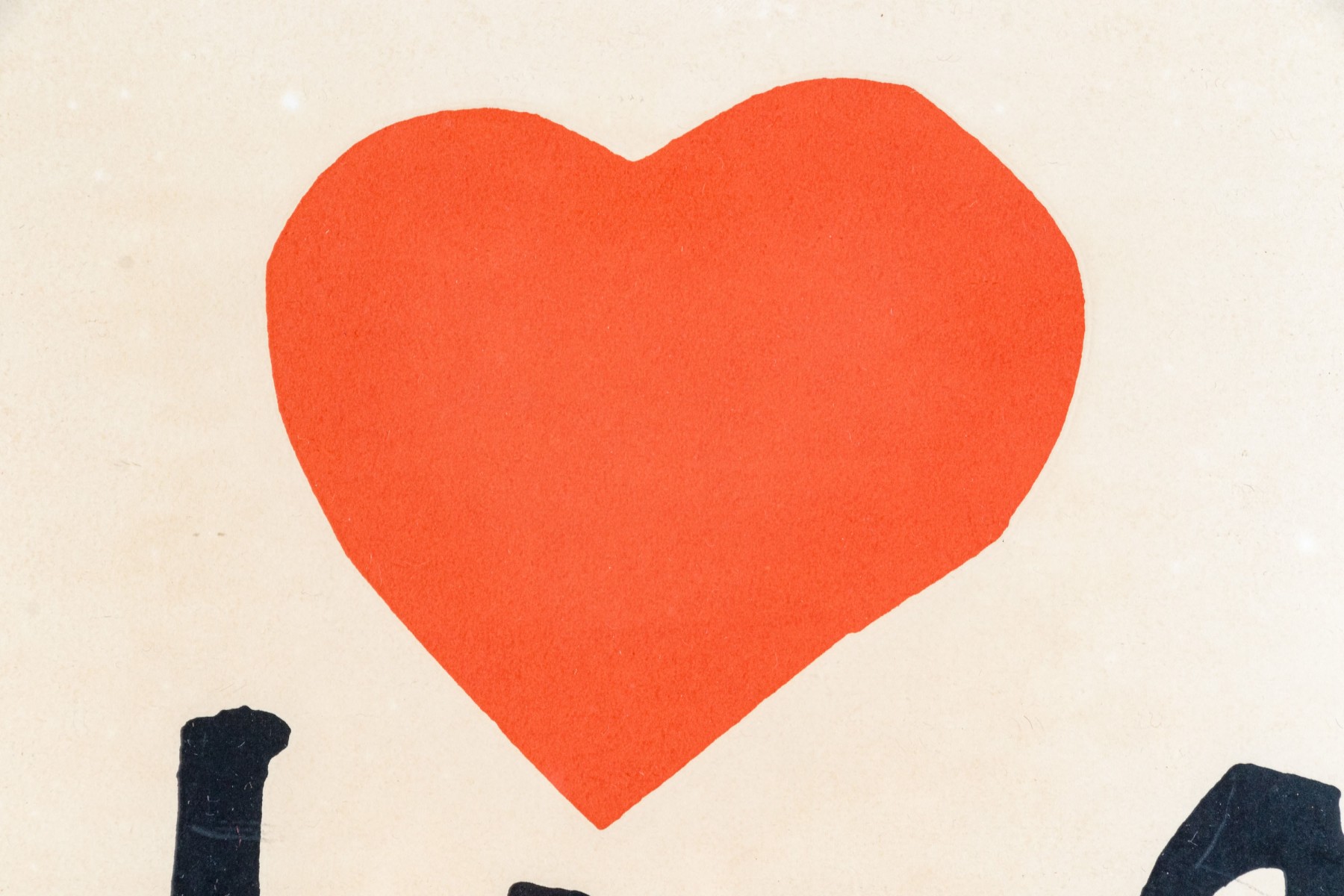 A small scale serigraph with Love in black script below a red heart. Unsigned. The artist is known for social justice artworks and her printmaking. Presented in a metal frame with glass.