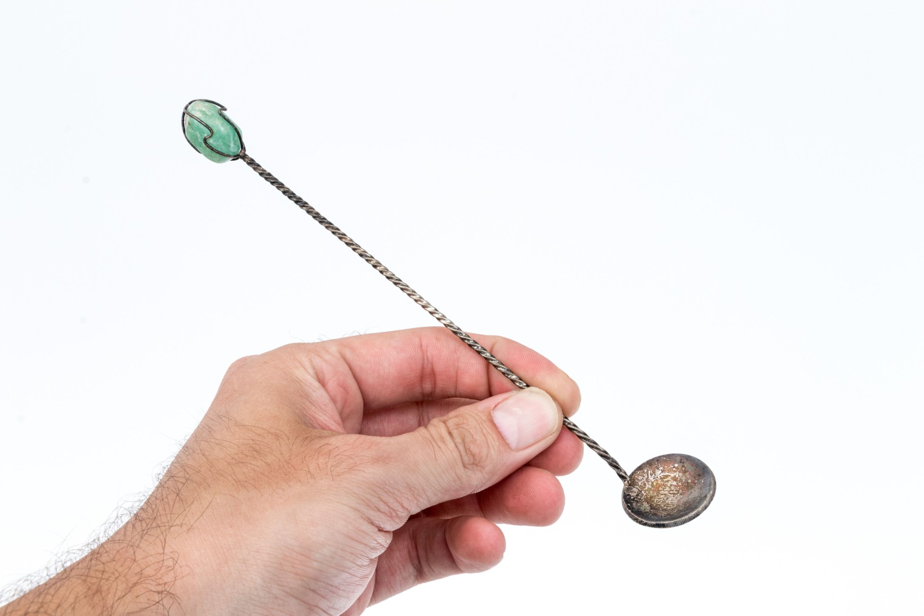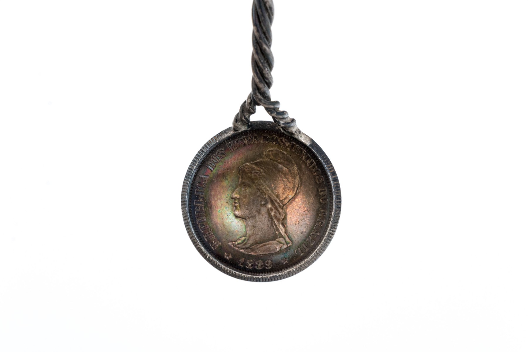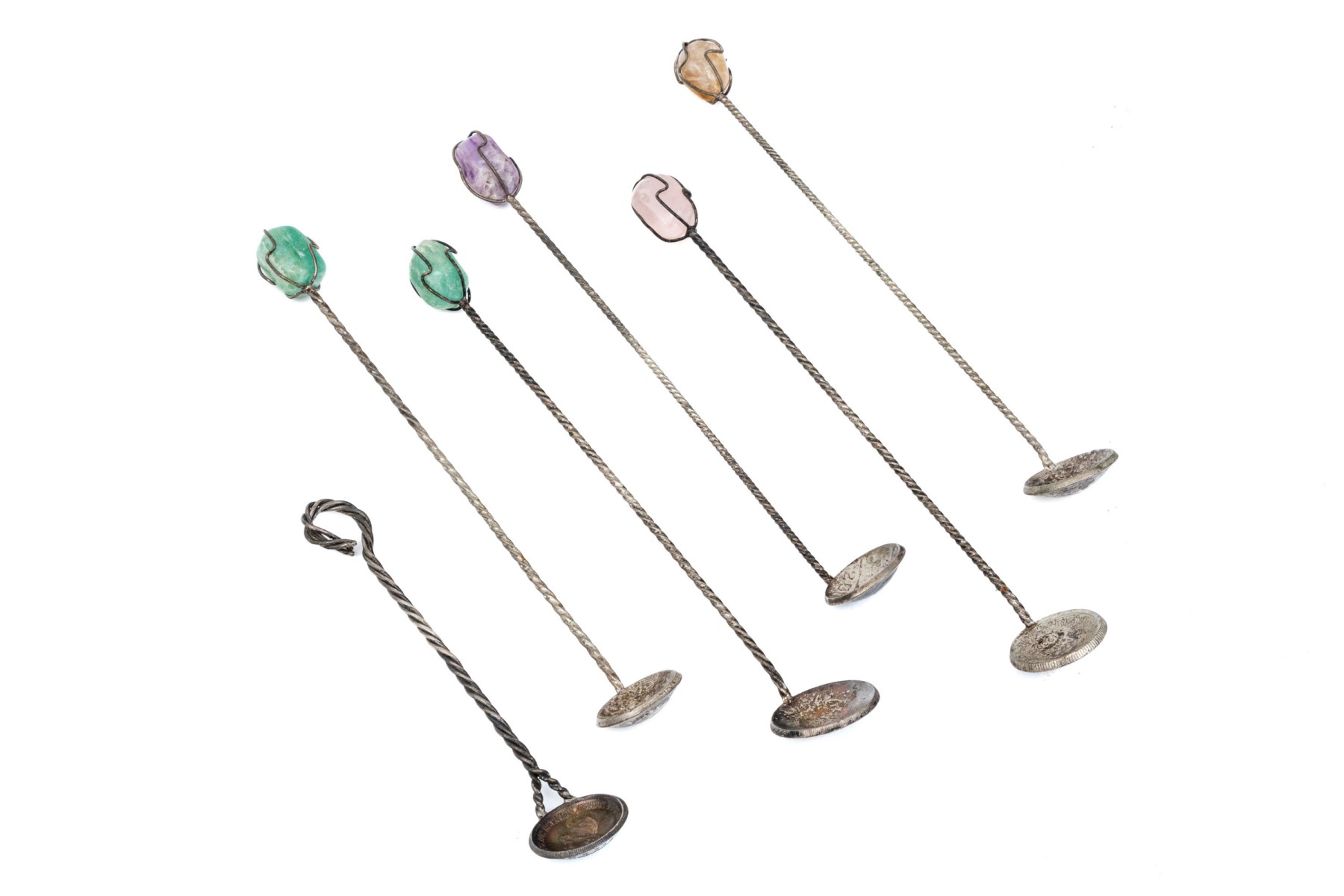 Marked 1000 reis and other coins made into spoons with colored stone ends.