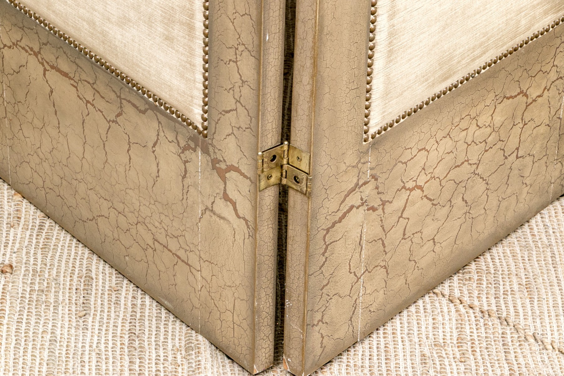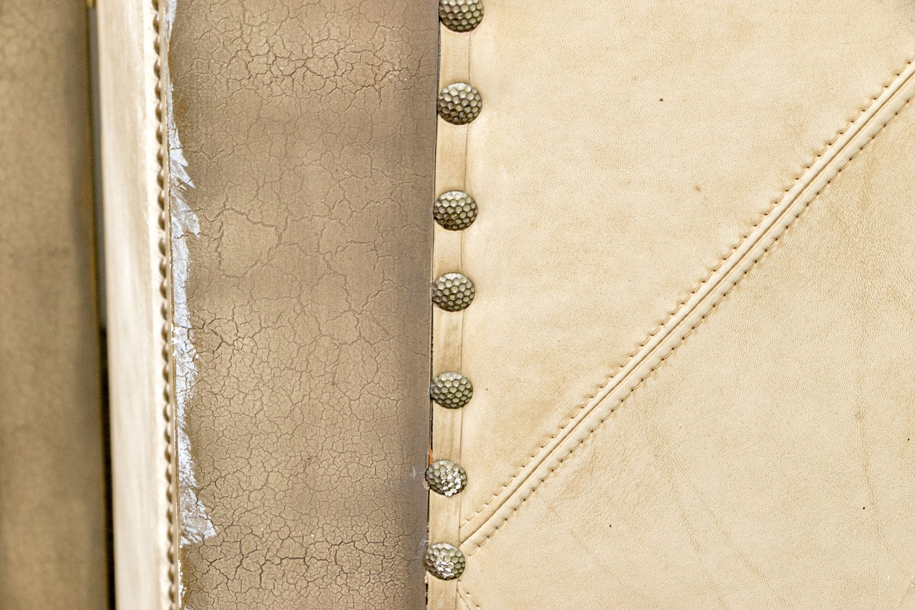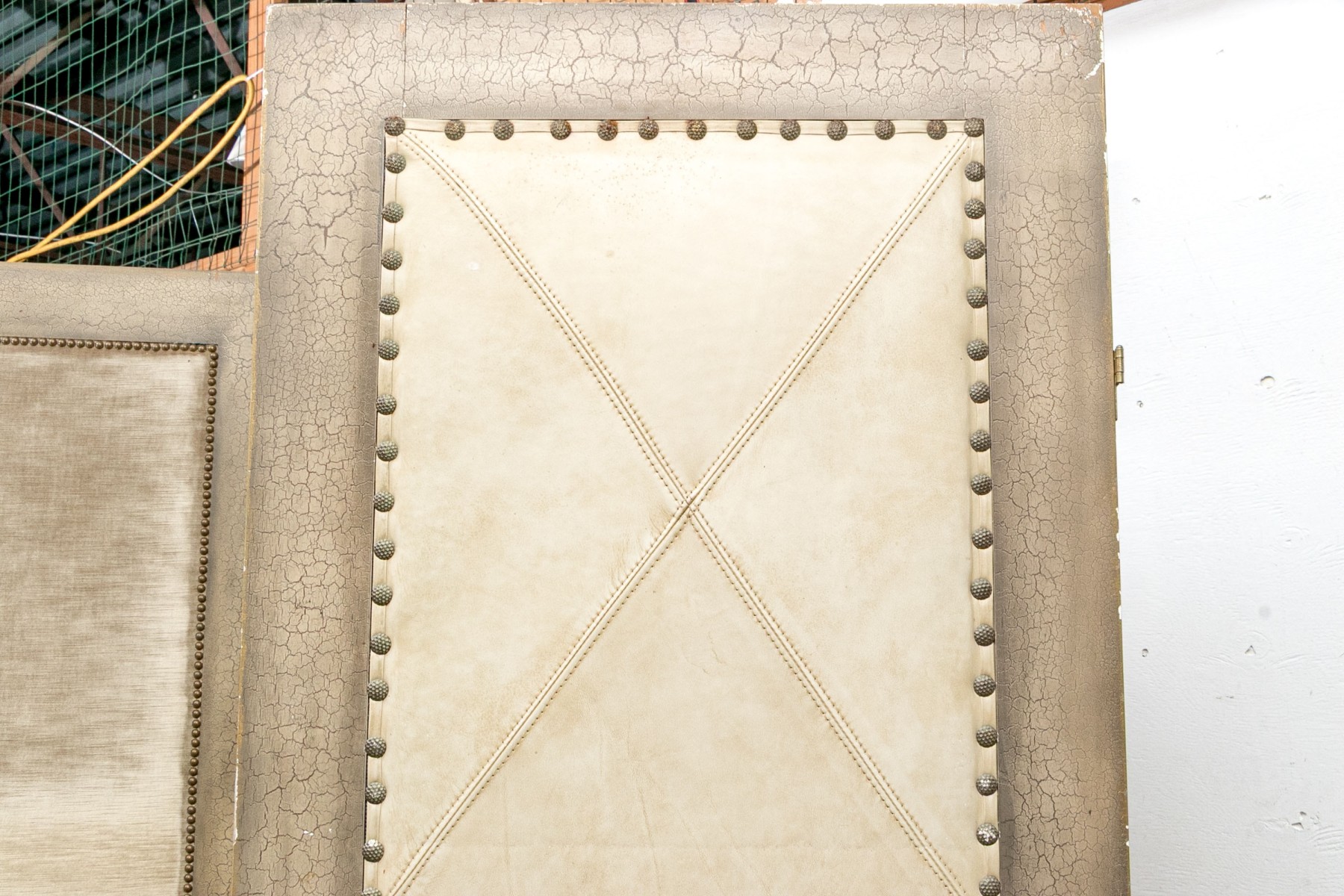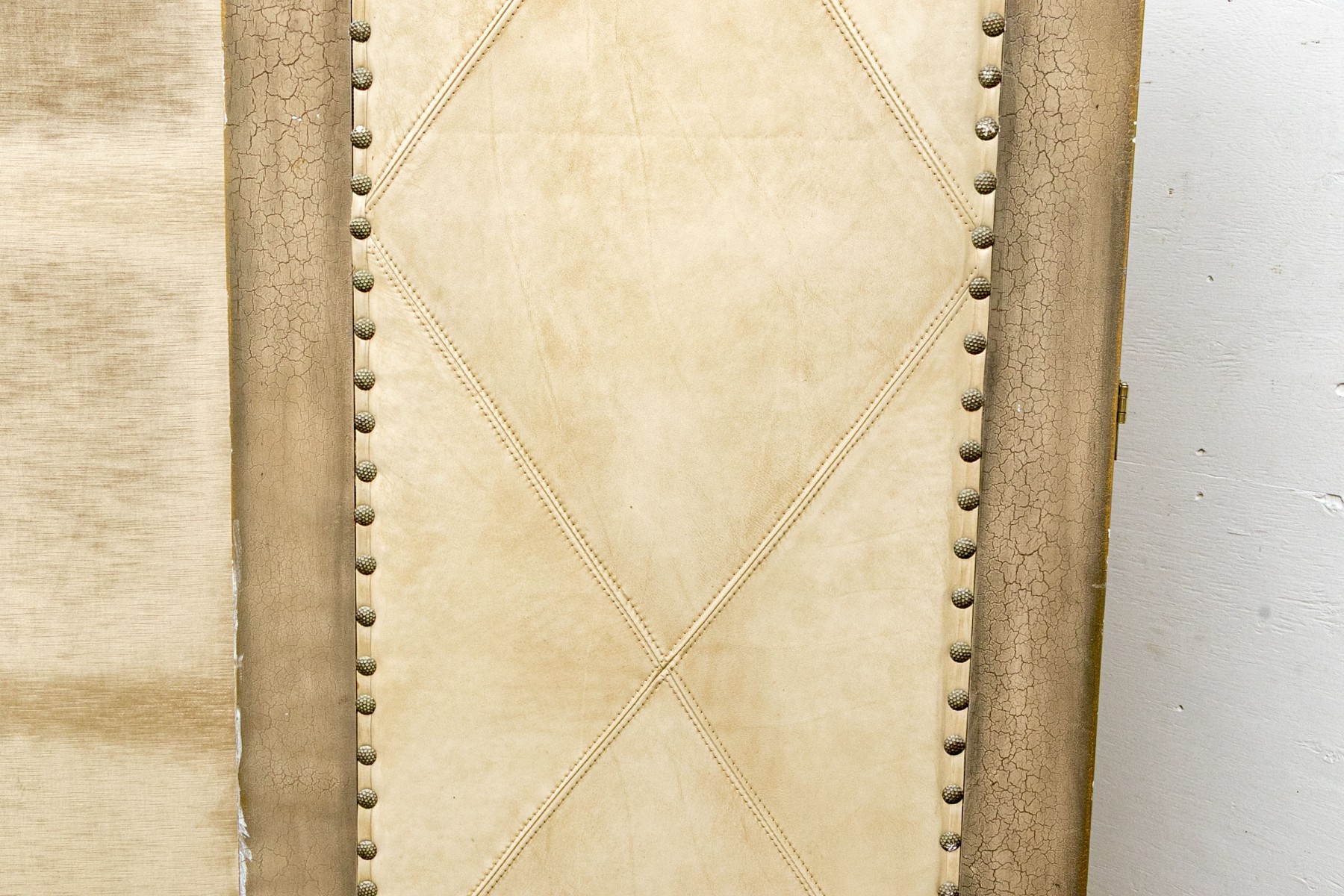 One side with upholstered fabric panels, with the opposite side having leather upholstered panels. Upholstered panels affixed with brass tack nailhead trim.