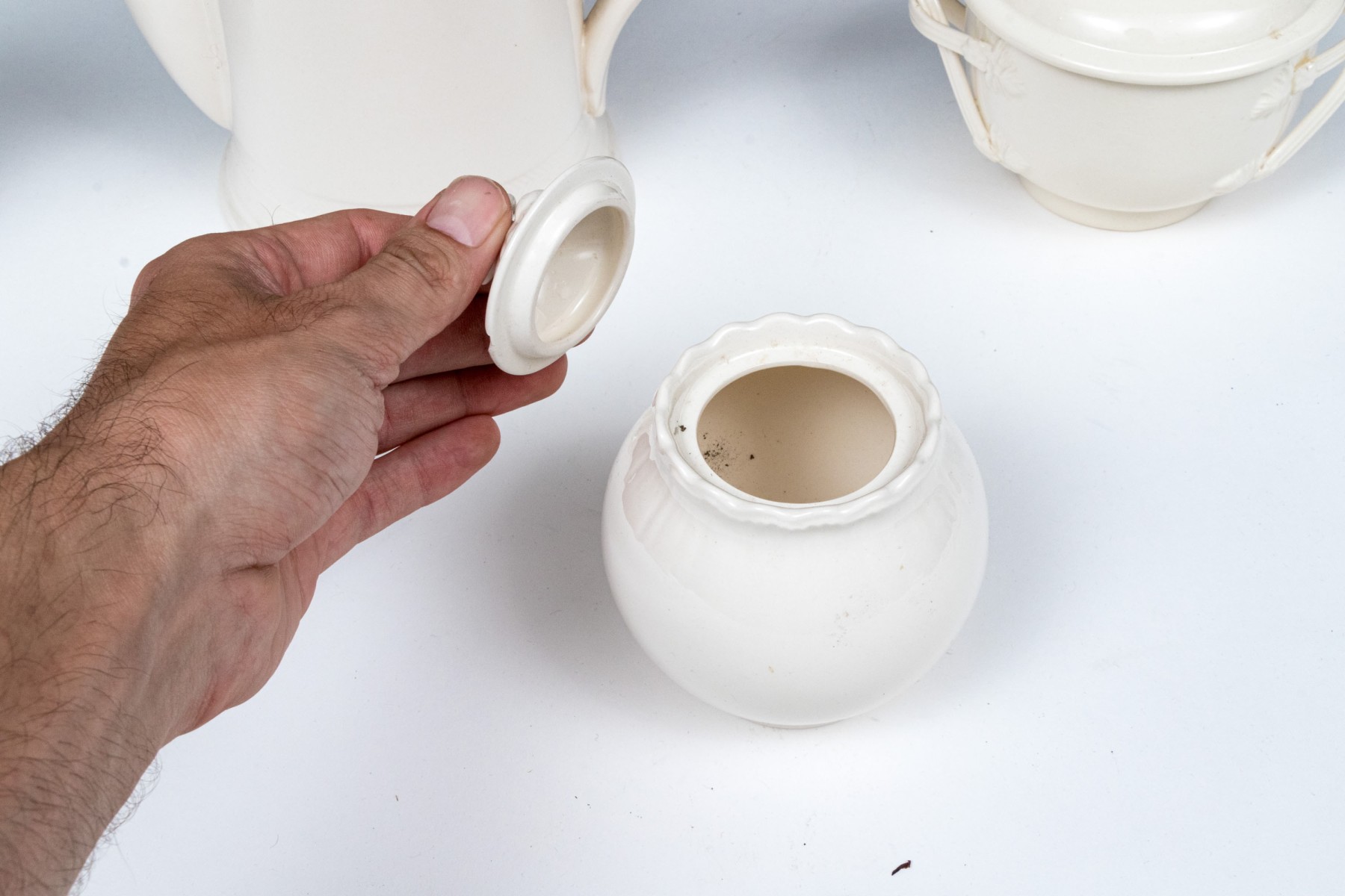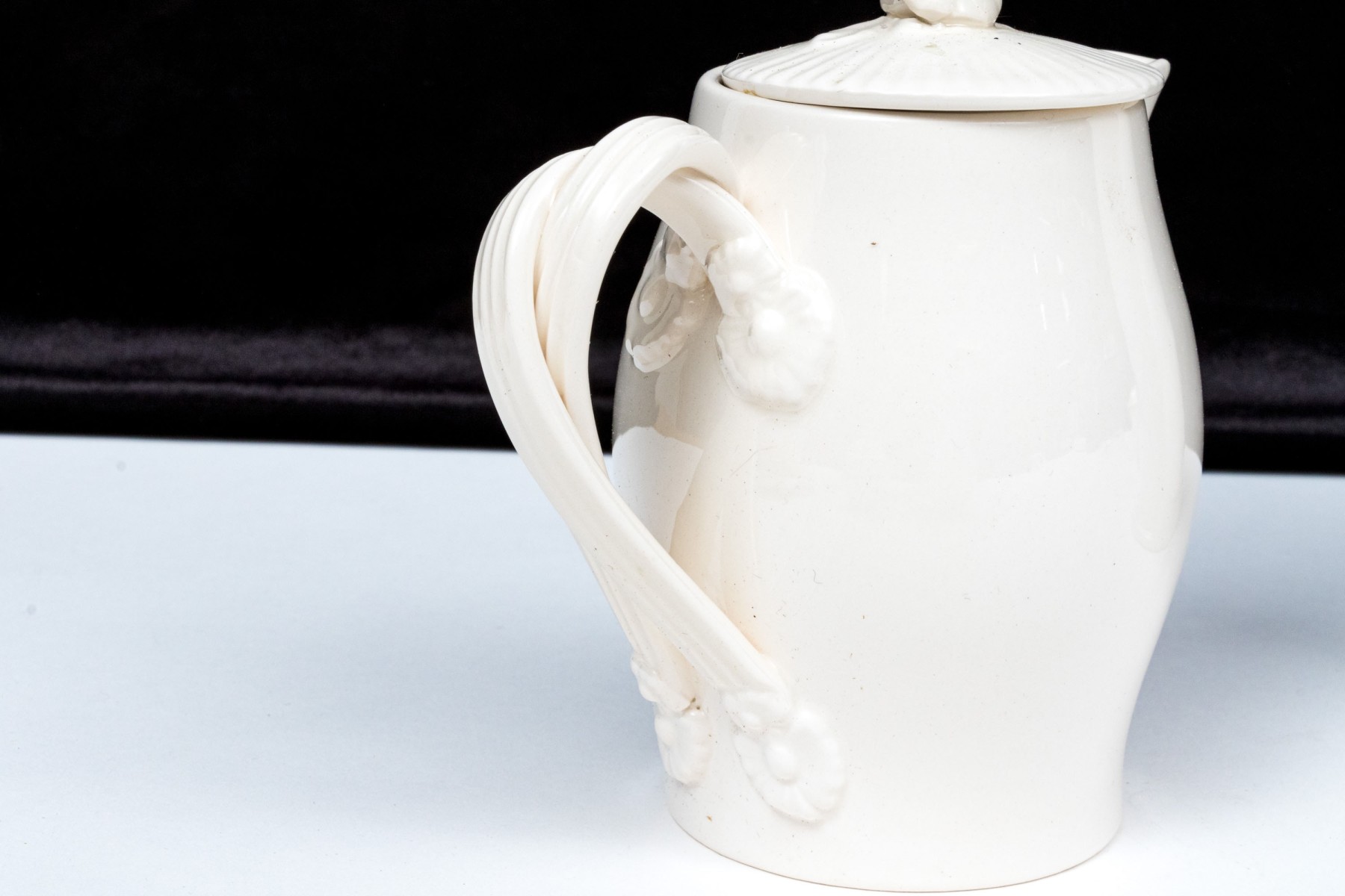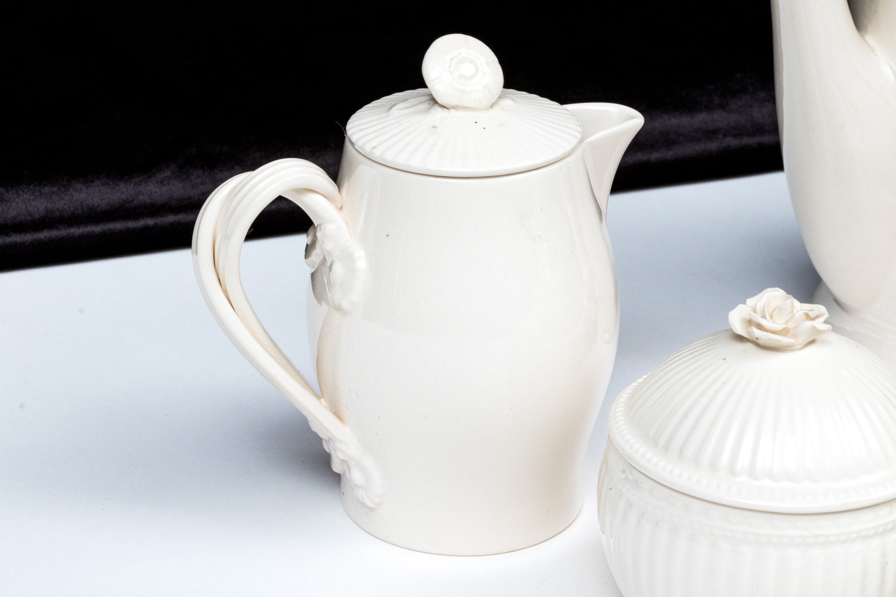 - A lidded creamer with floral form finial