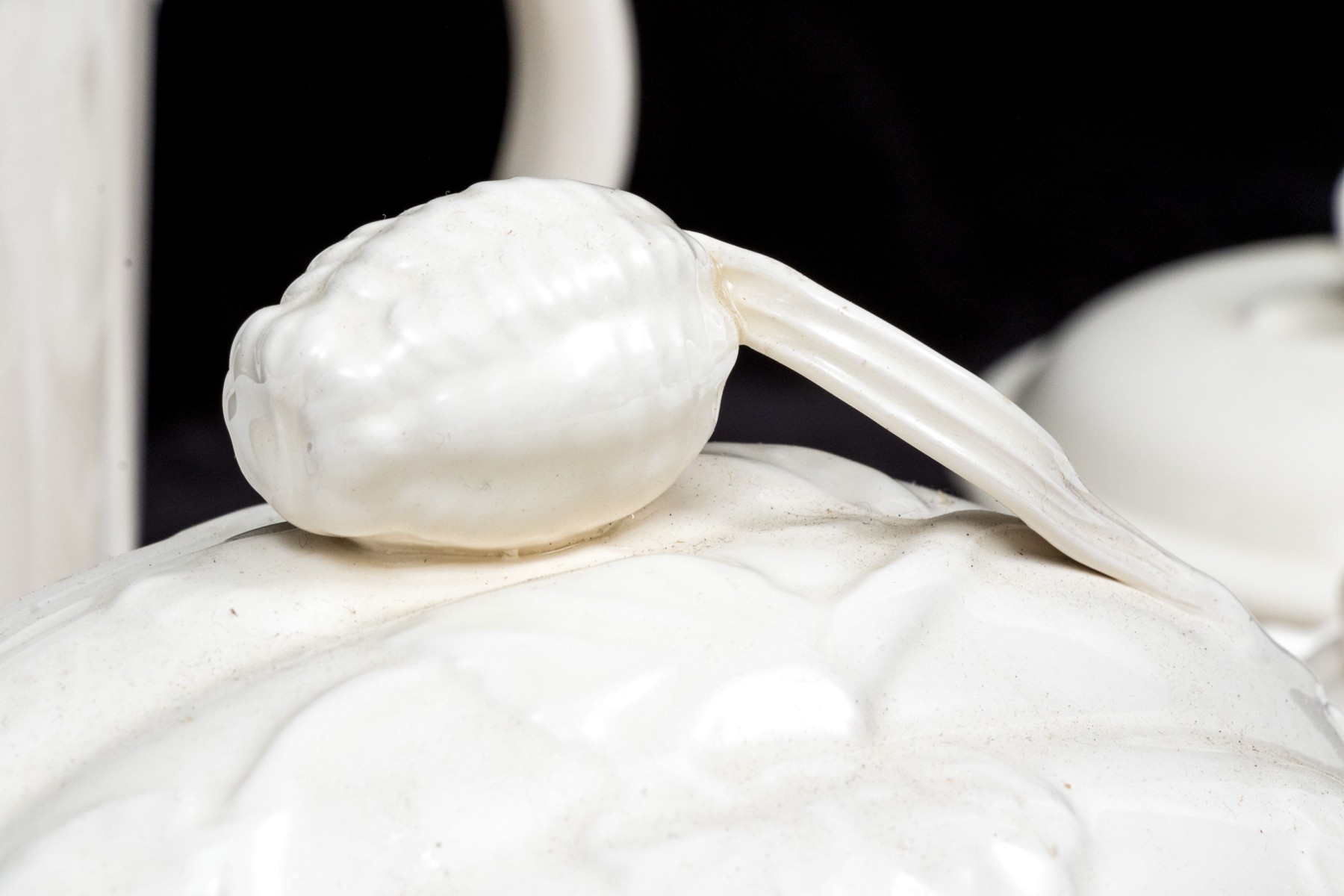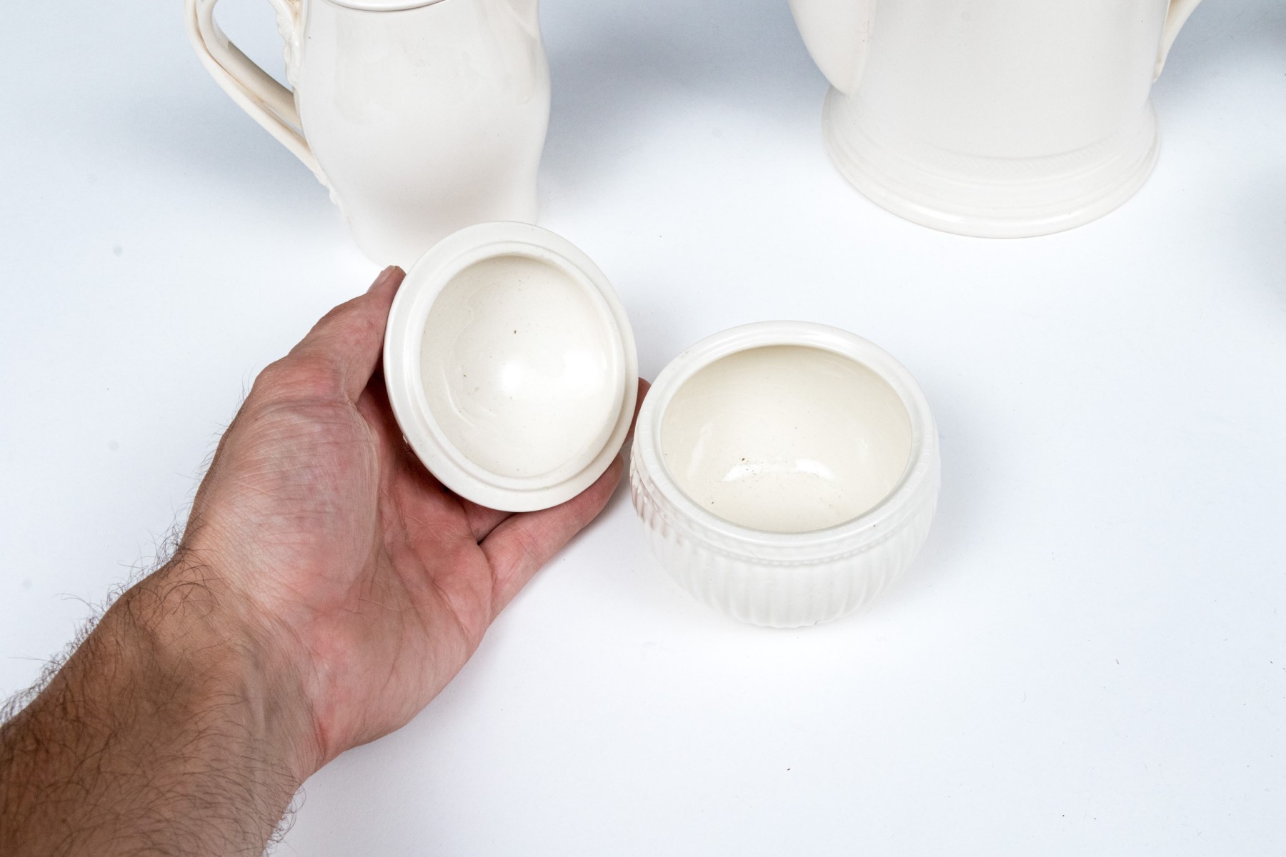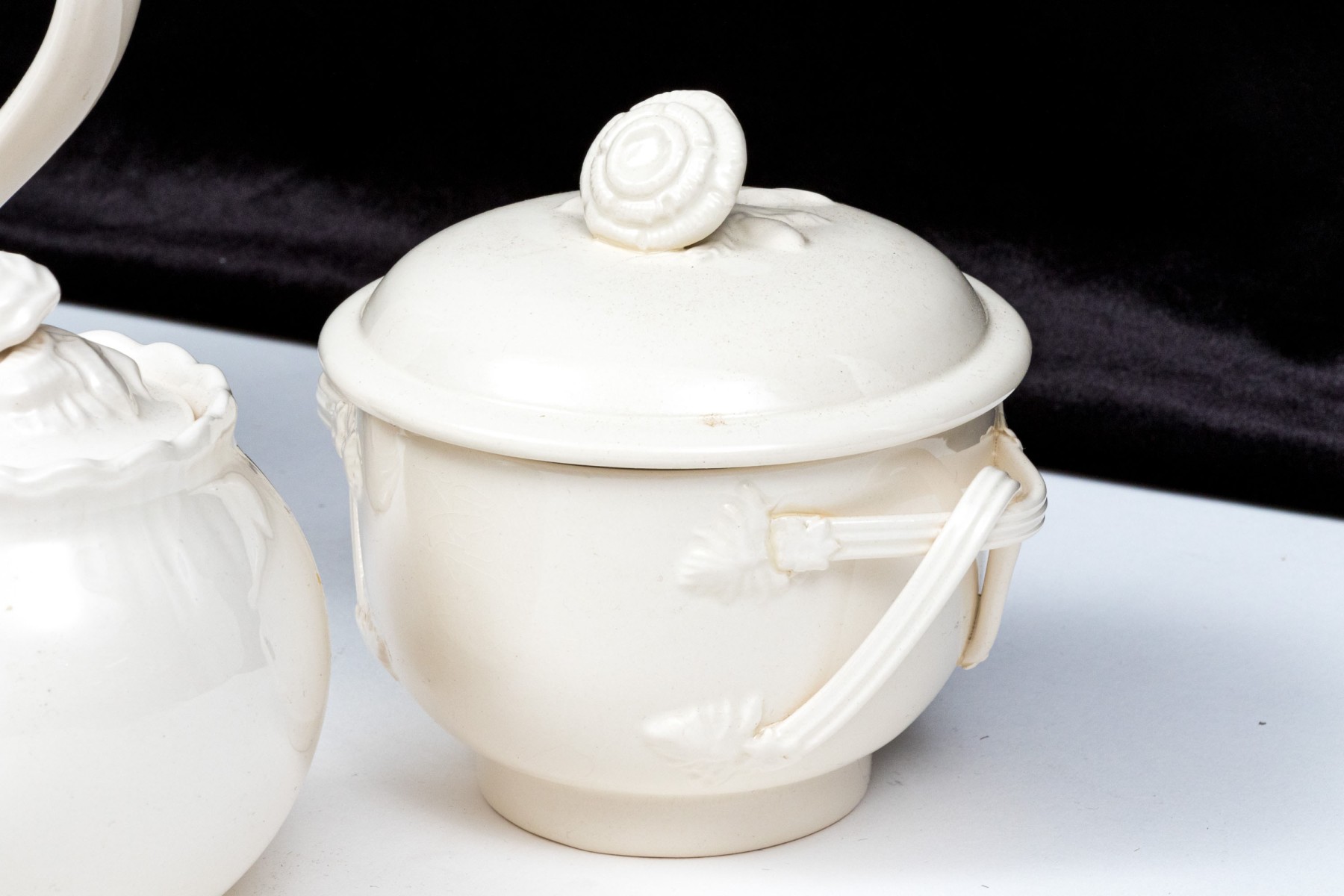 - A lidded creamer with floral form finial