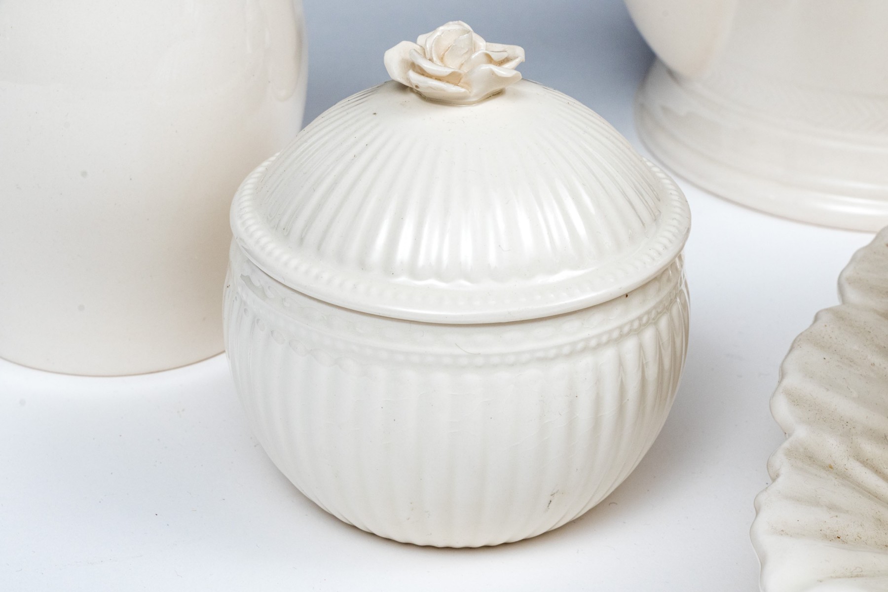 Comprised of a suite of ceramics with cream hued glazed finish.