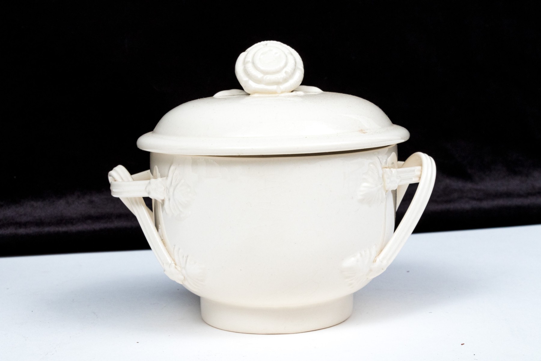 - A twin handled lidded wastebowl or larger sugar bowl, with braided handles and a floral form finial