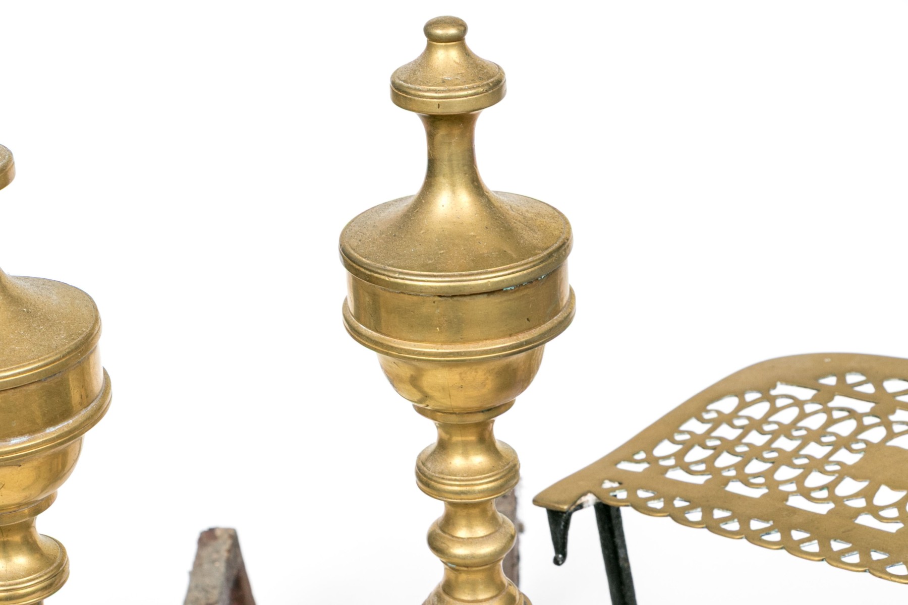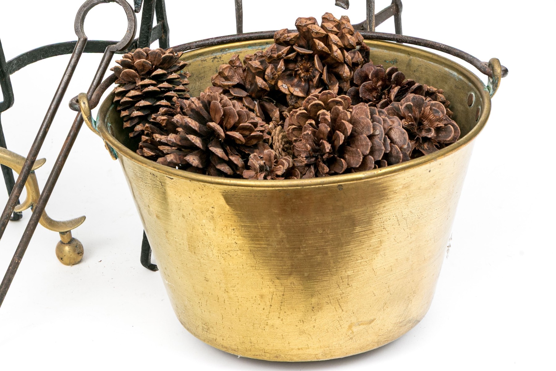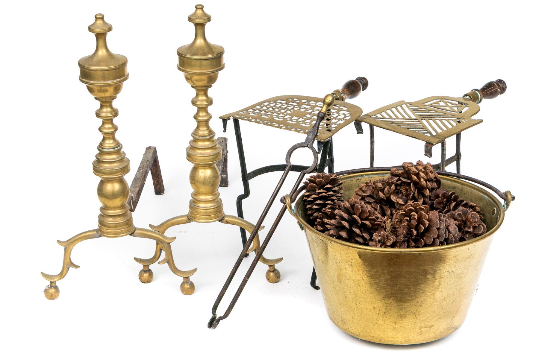 Comprised of a pair of brass and iron andirons, with a bucket with swing handle and iron and brass clamps, with two trivets.