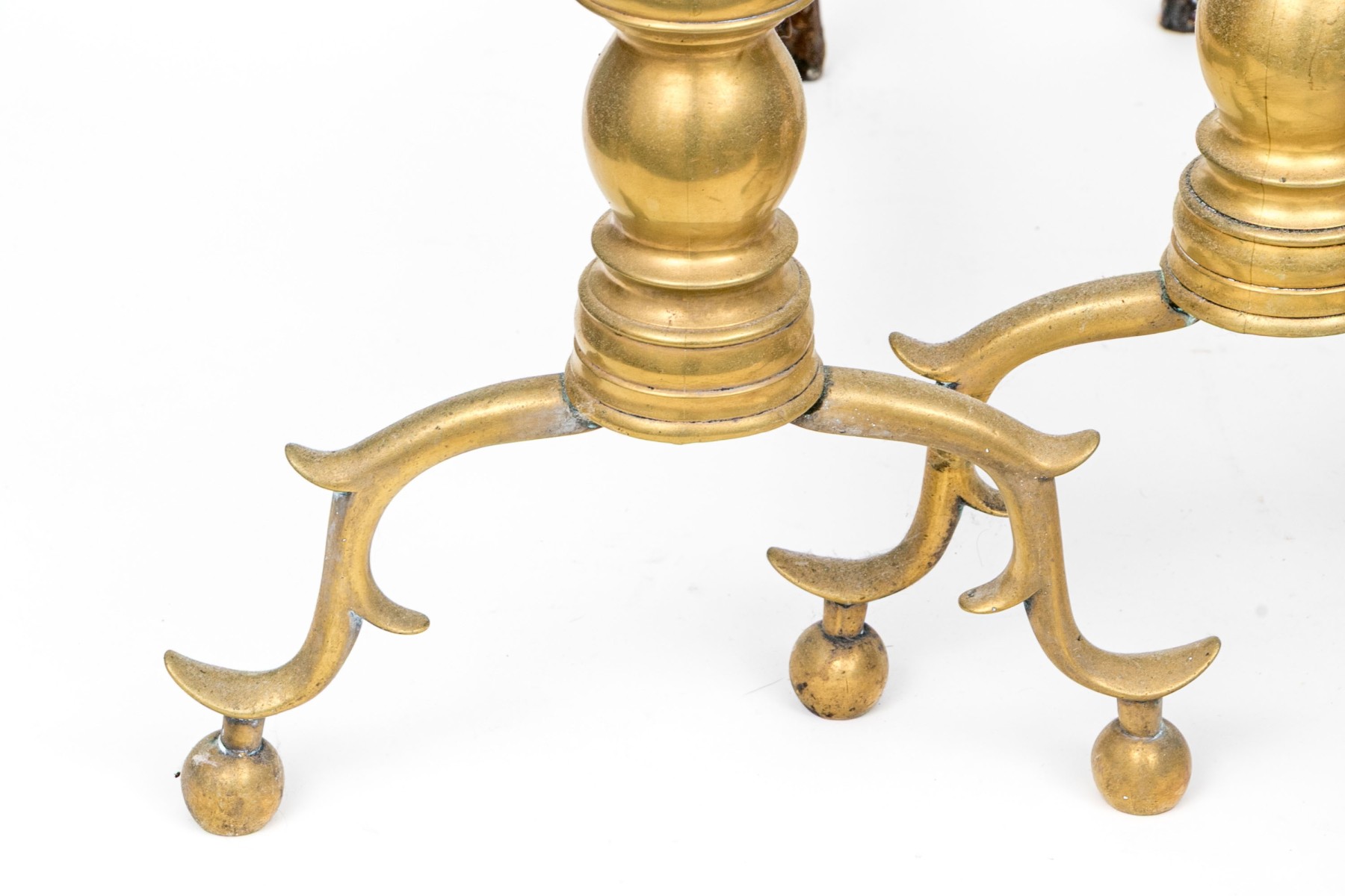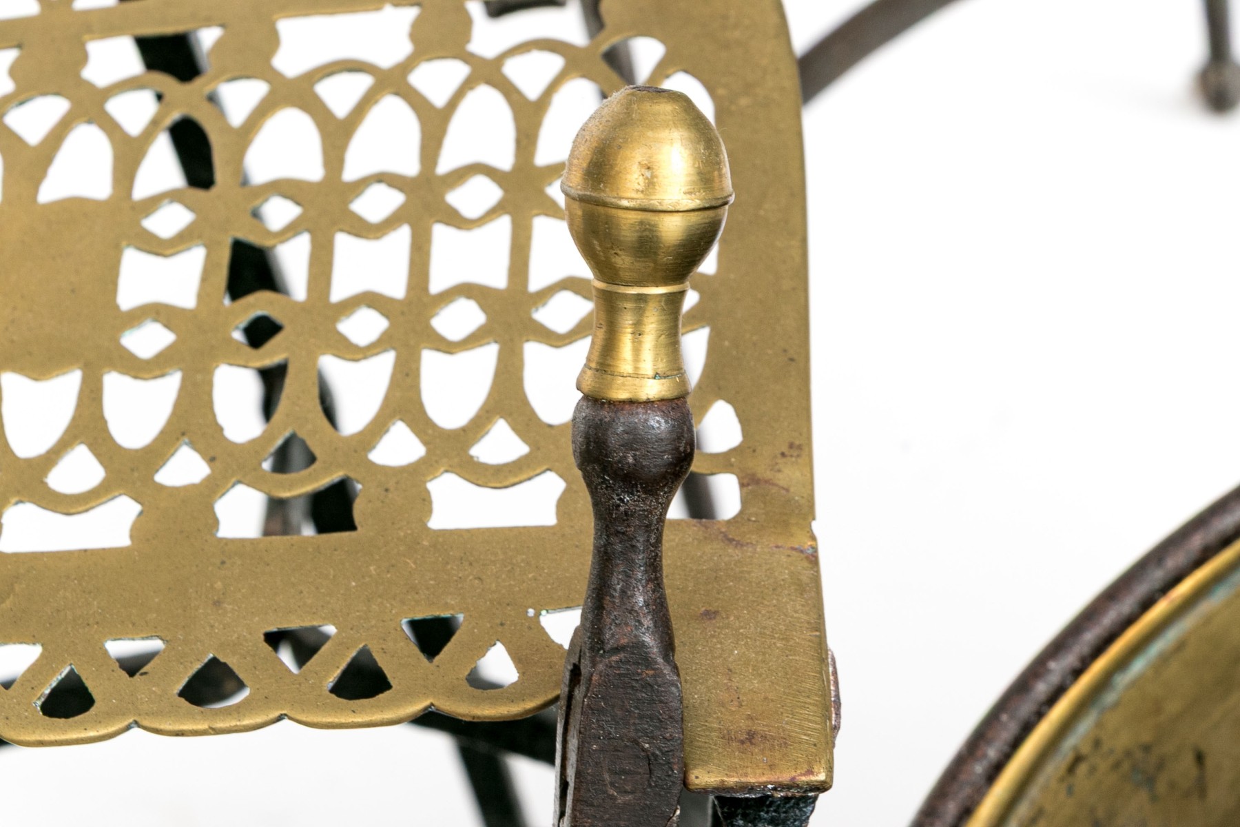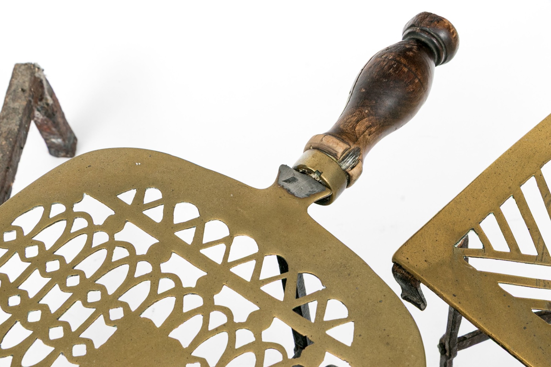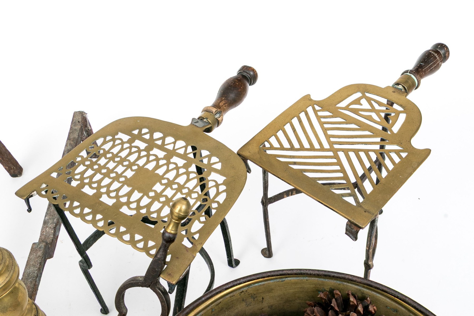 Comprised of a pair of brass and iron andirons, with a bucket with swing handle and iron and brass clamps, with two trivets.