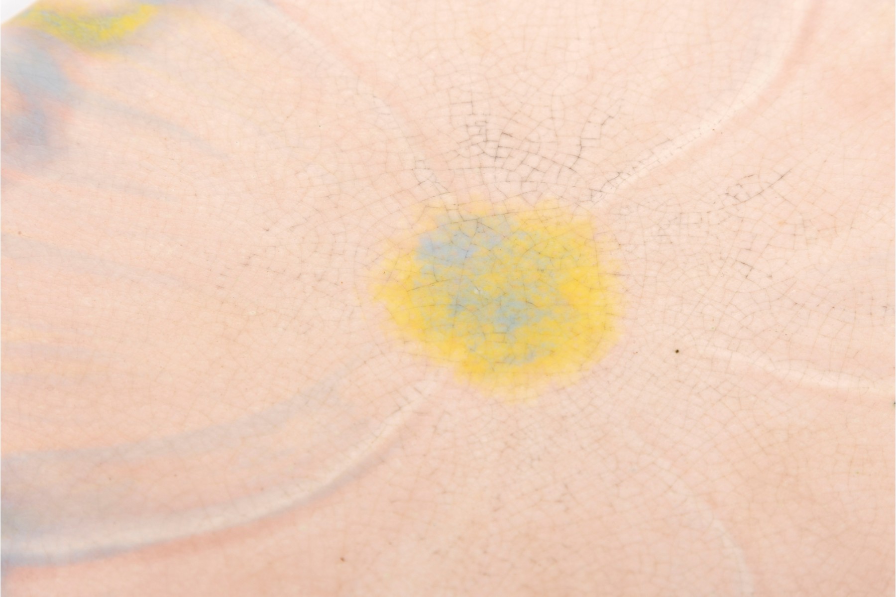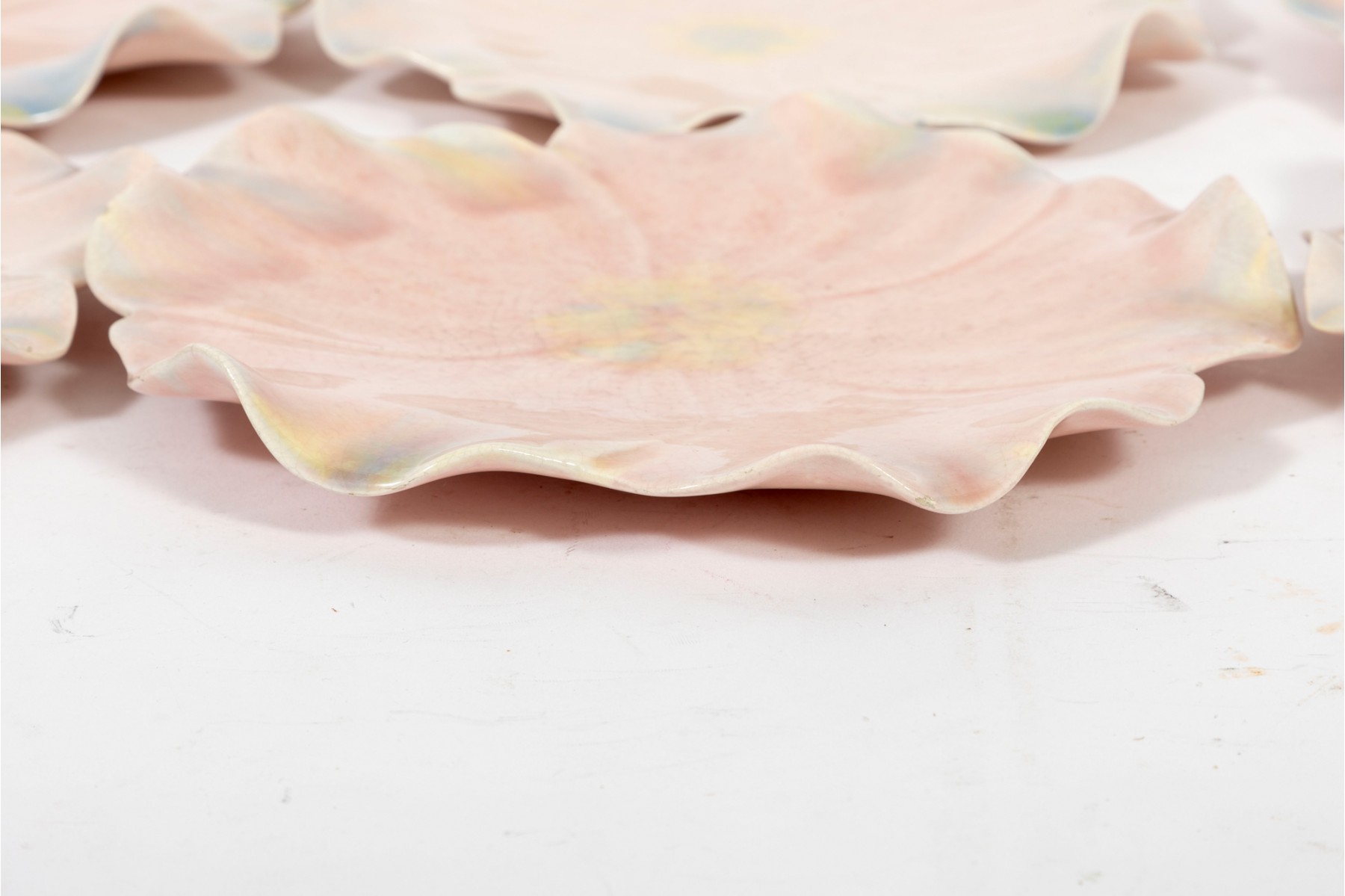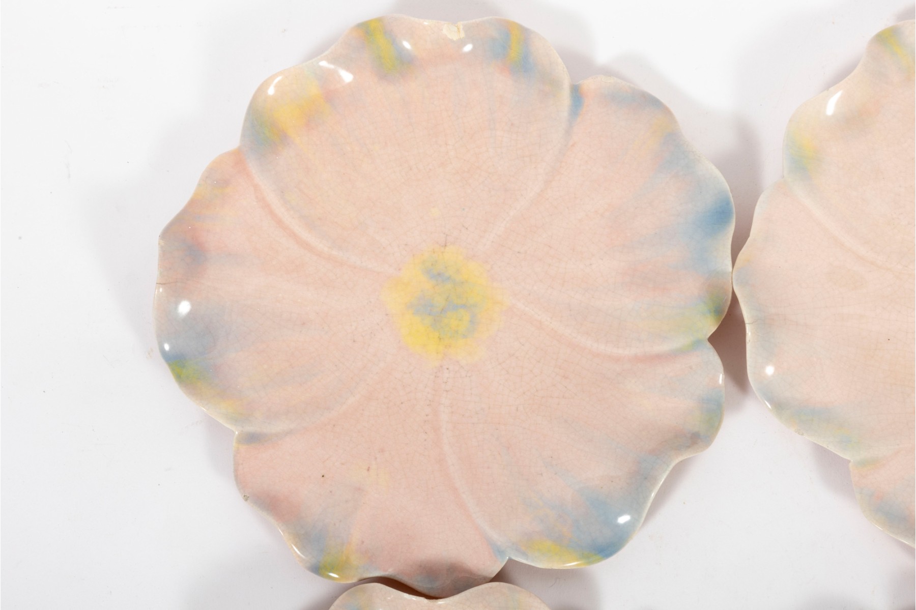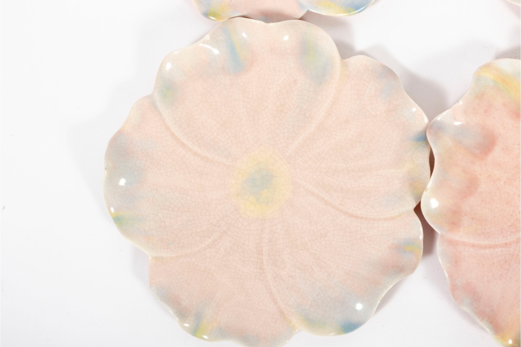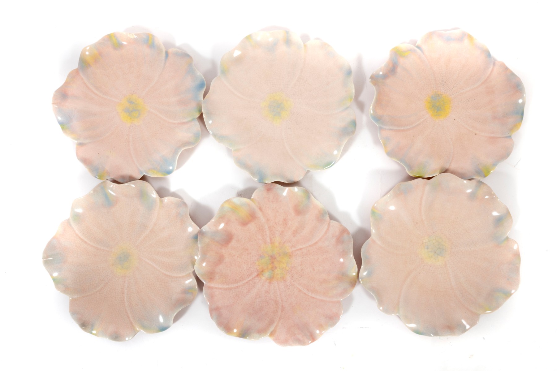 A set of six 9" pink crackle glazed lotus flower plates with blue/yellow petal highlights, unsigned.