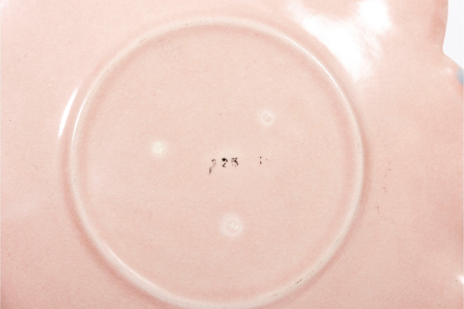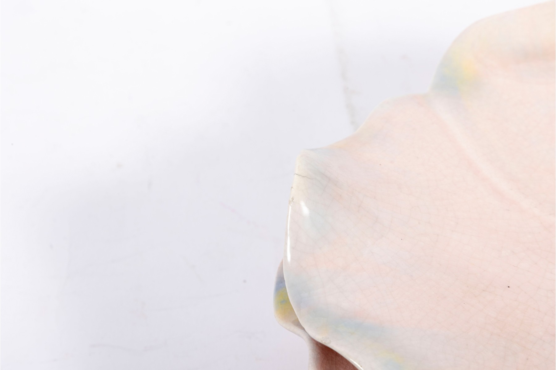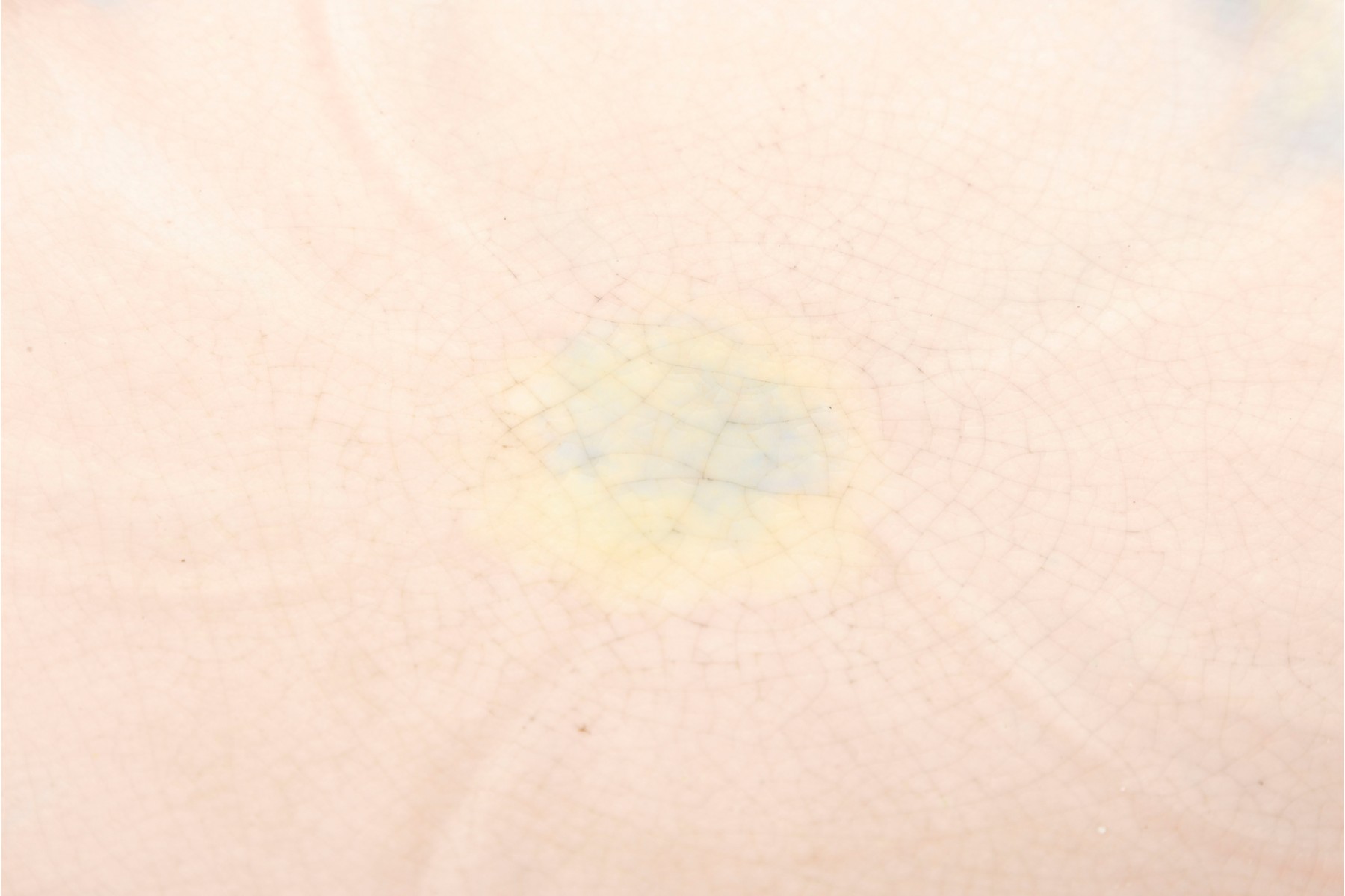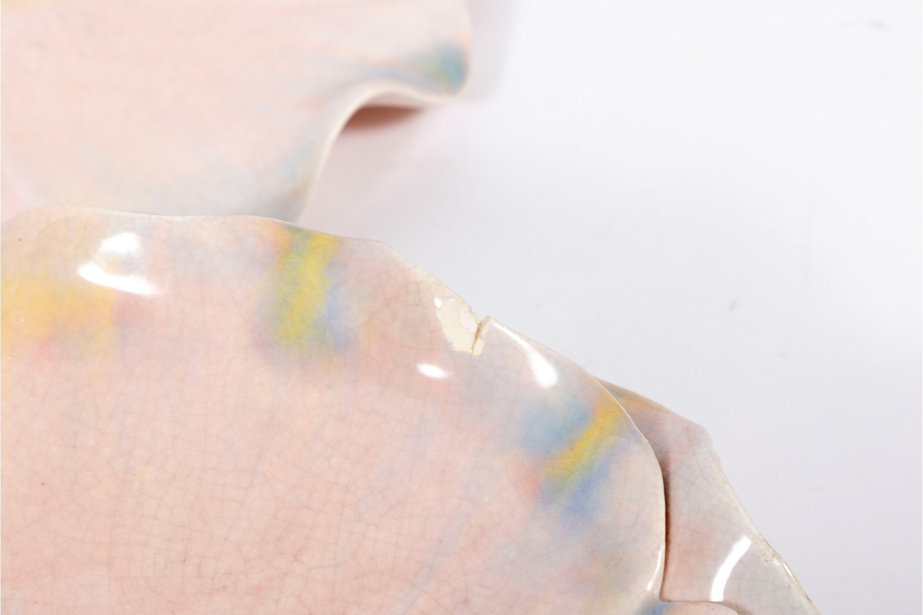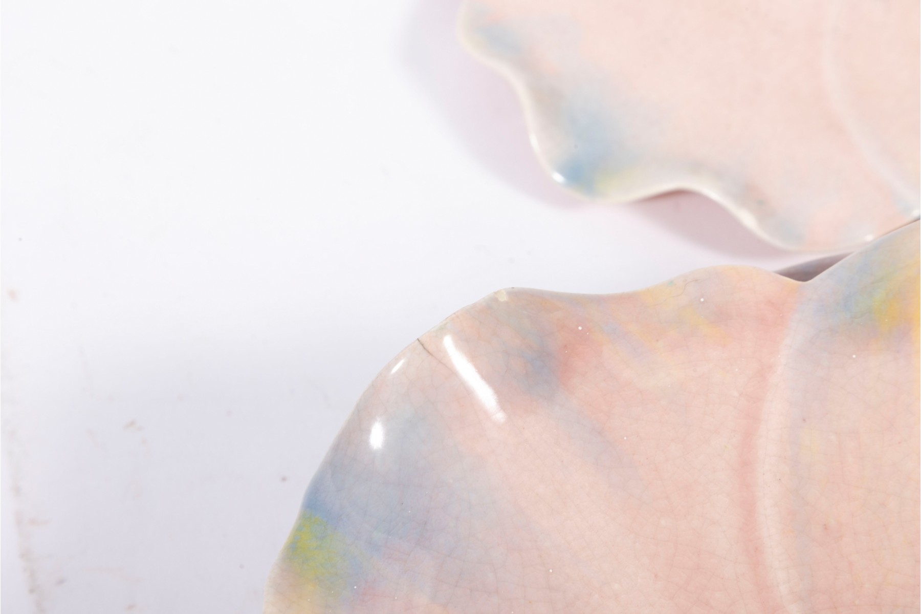 A set of six 9" pink crackle glazed lotus flower plates with blue/yellow petal highlights, unsigned.