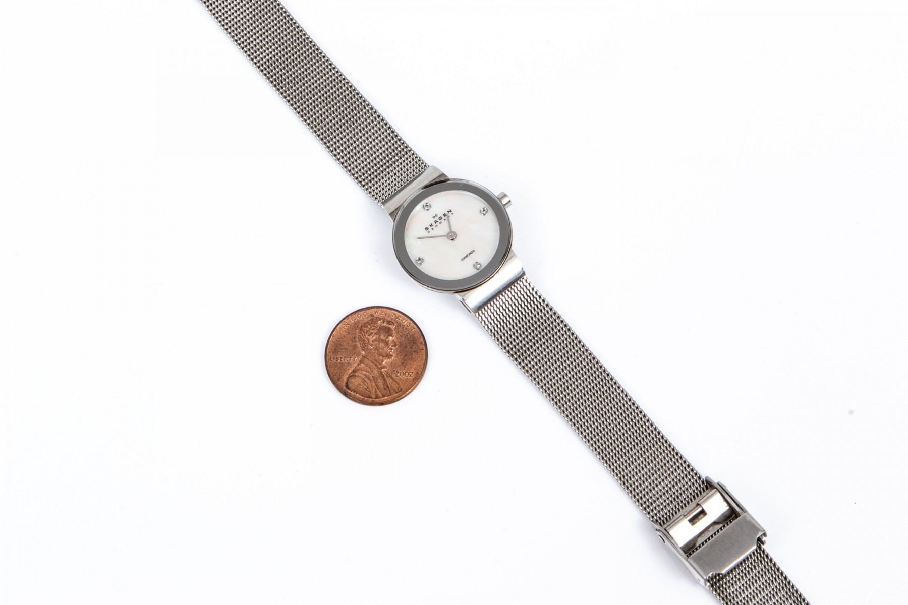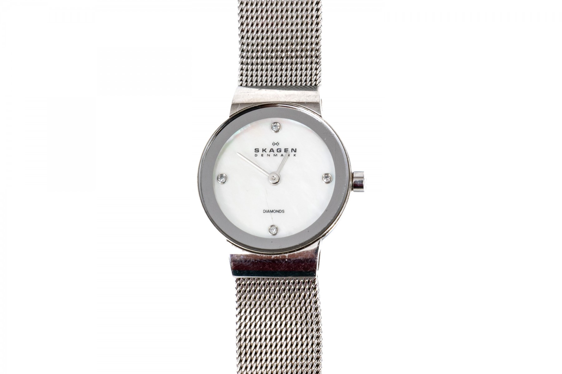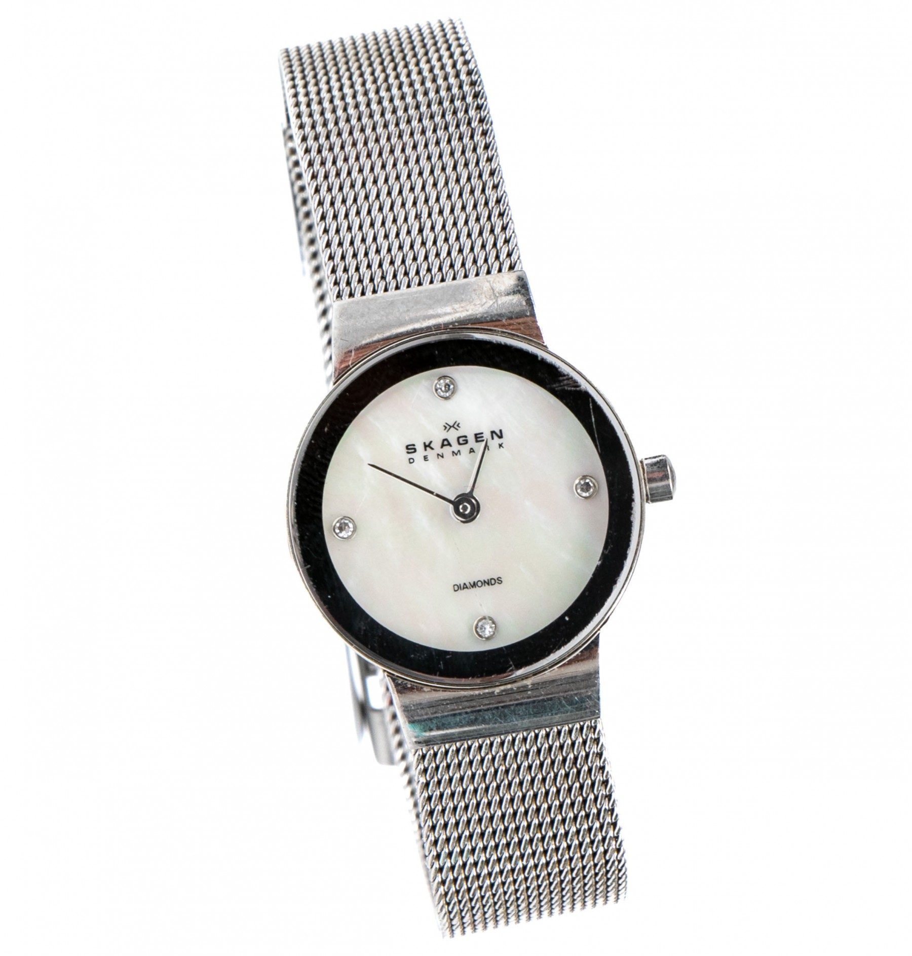 Skagen stainless steel quartz watch. The watch has a mother of pearl dial with diamond indices at the 12, 3, 6, and 9 positions. A stainless steel band with an adjustable clasp.