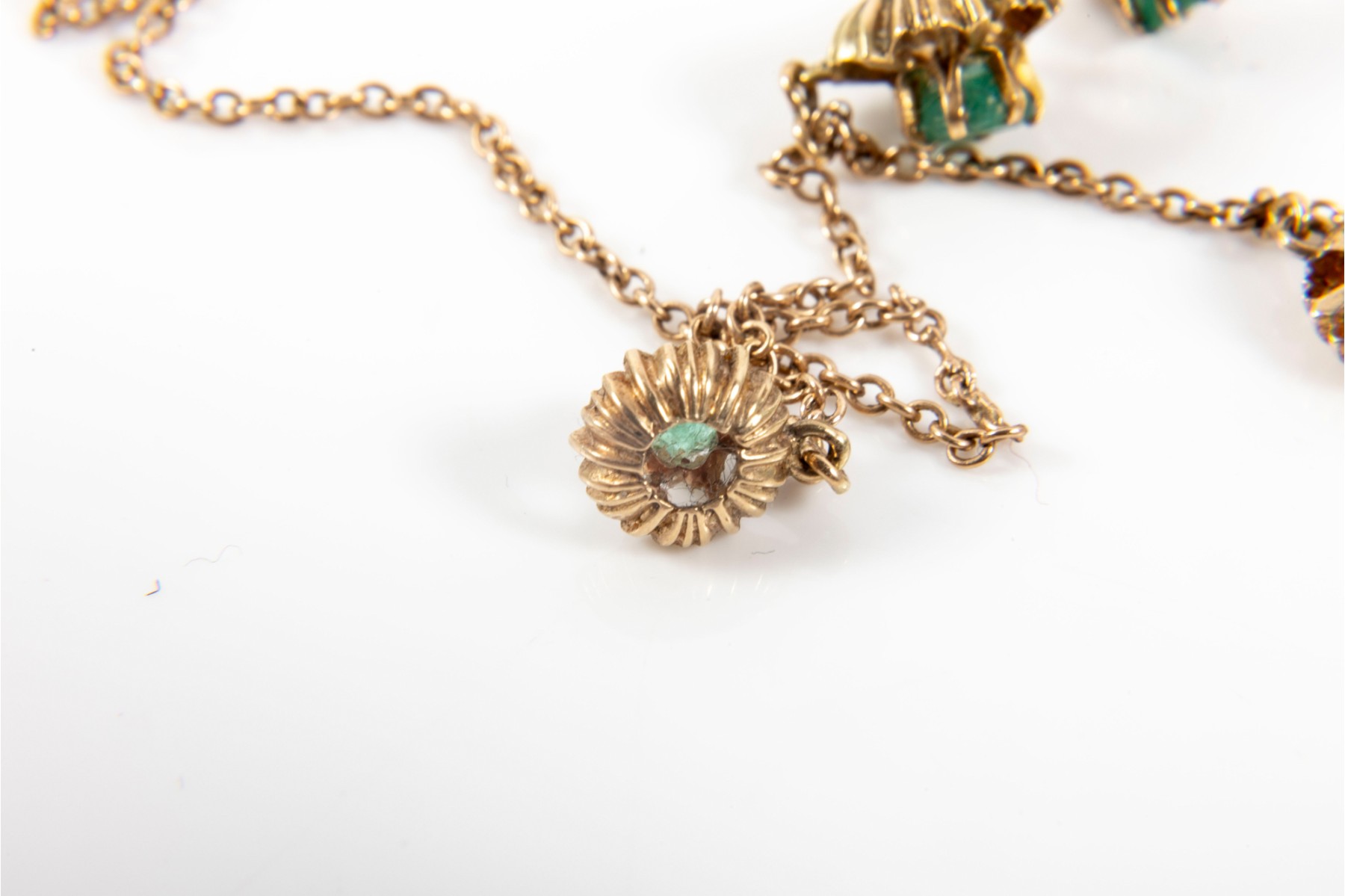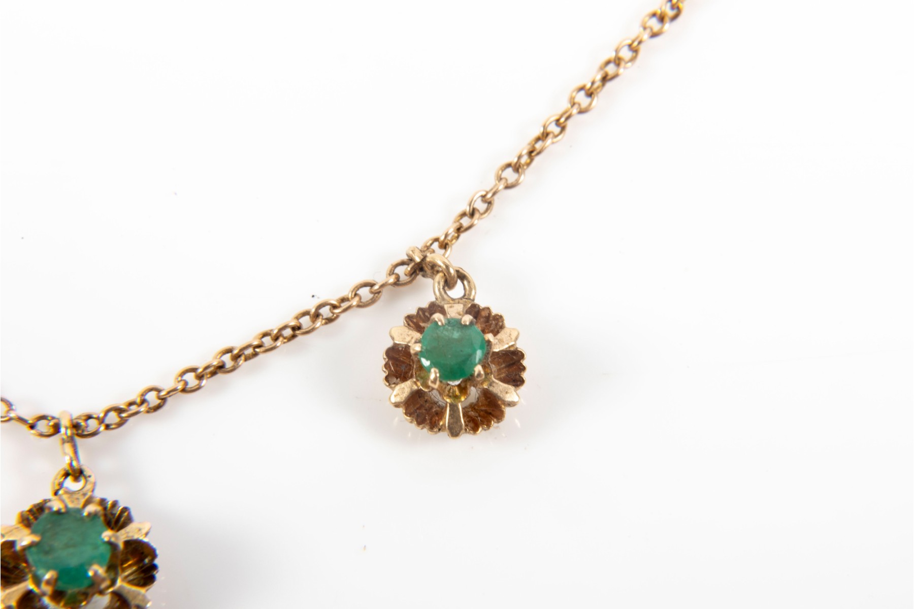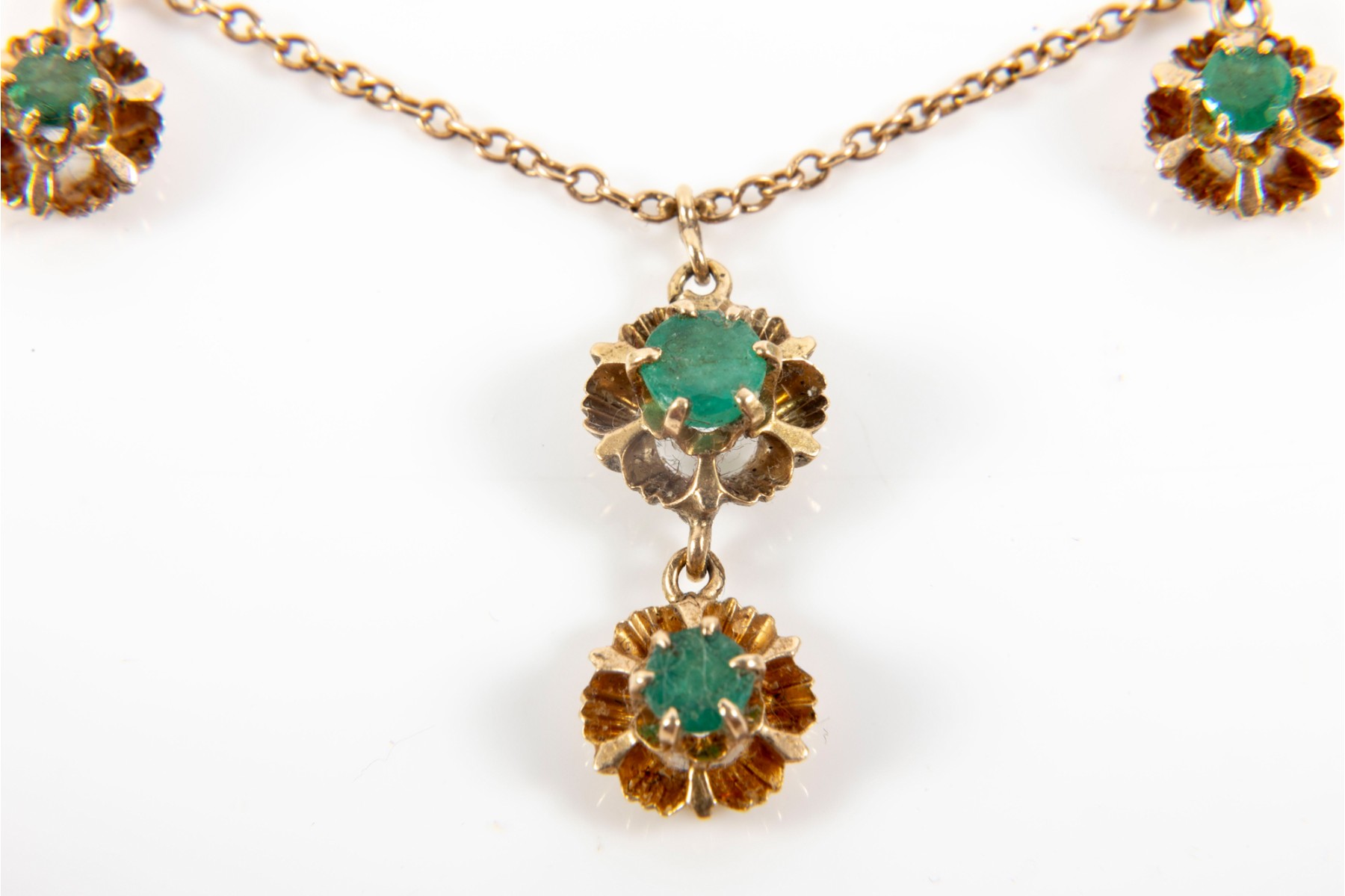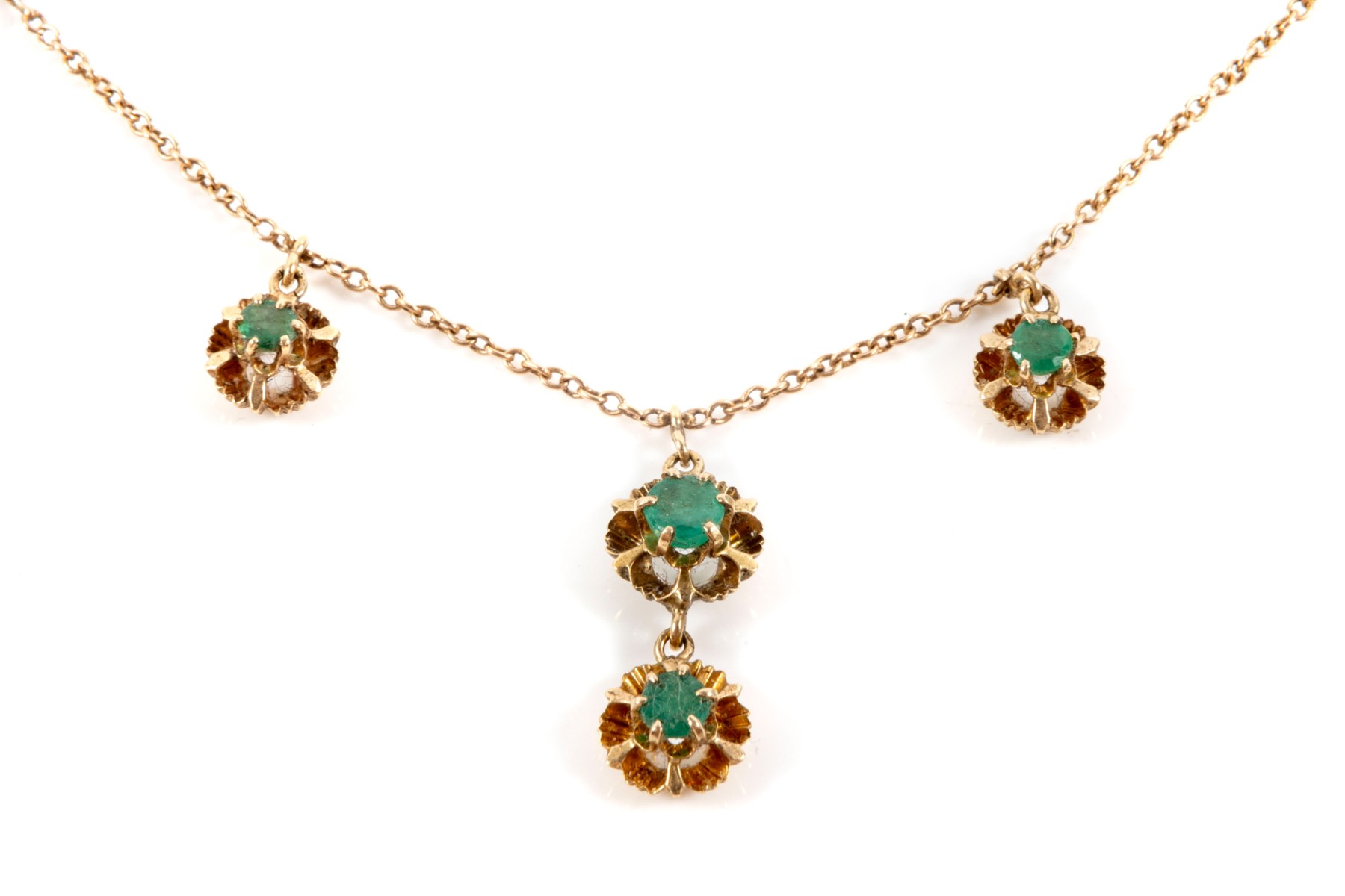 A sleek 14K yellow gold chain style necklace. At the center of the chain are three stationed pendants set with round faceted emeralds. The emeralds are approximately 0.38 TCW. Spring ring clasp.