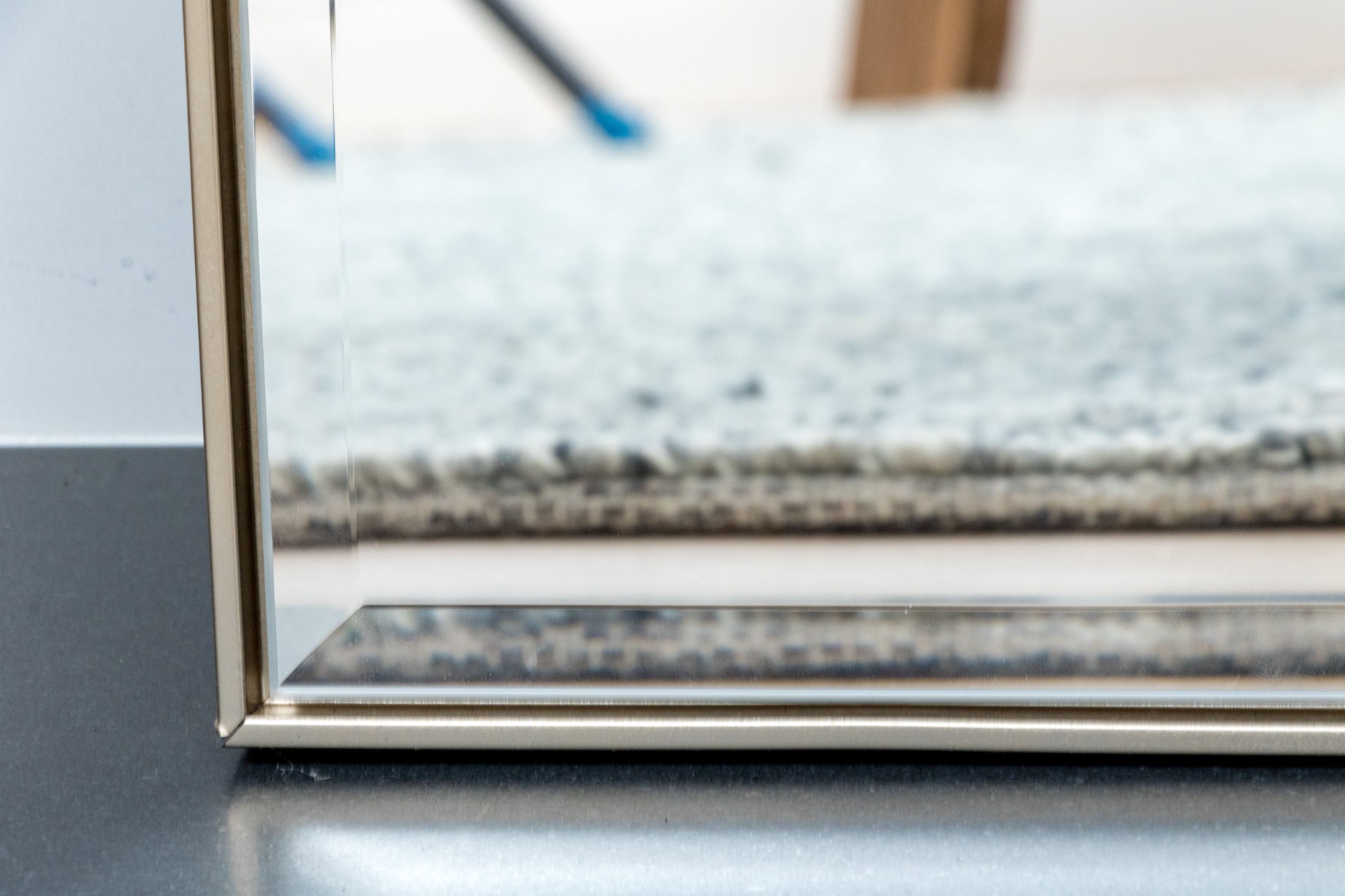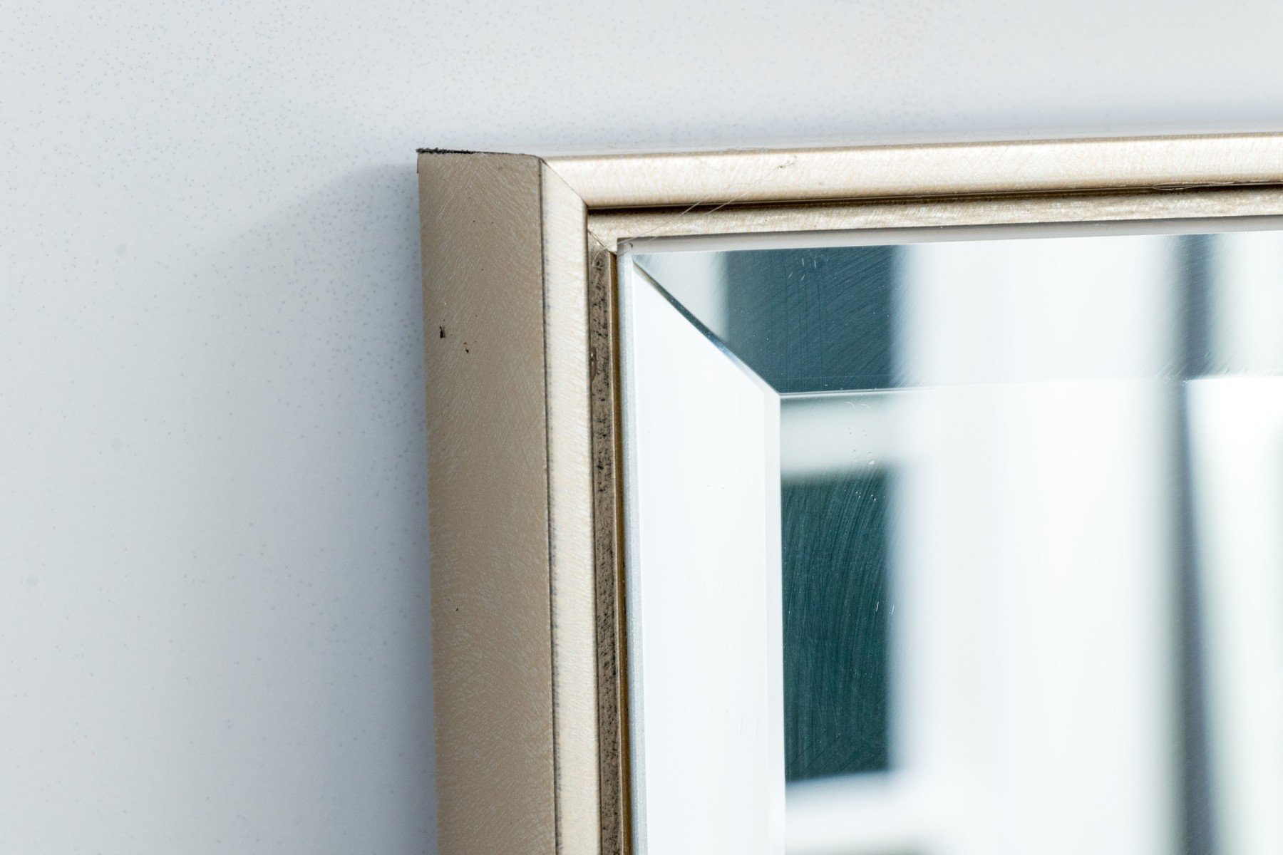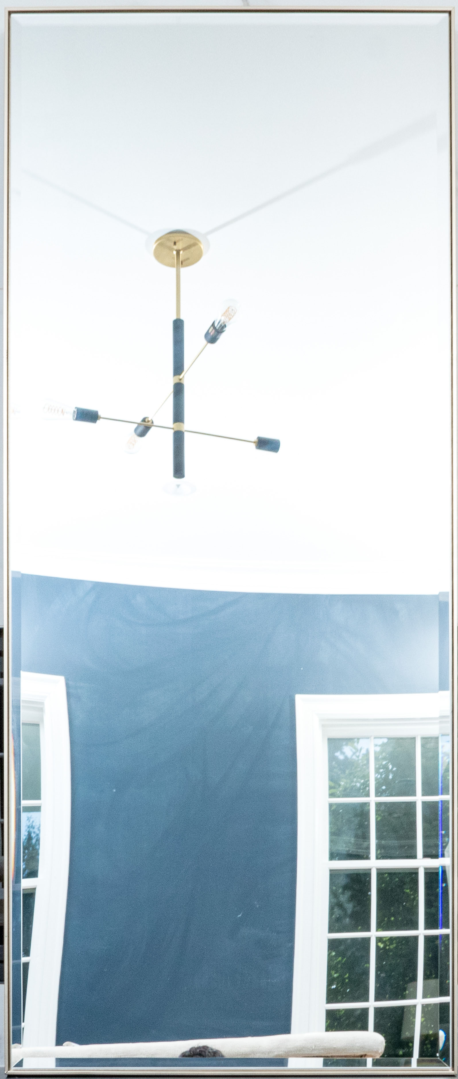 A wonderful 4'-10" rectangular beveled leaner mirror in a brushed nickel finished frame with a recessed inner border. Beautifully and simply detailed for a clean, minimalistic and elegant aesthetic.