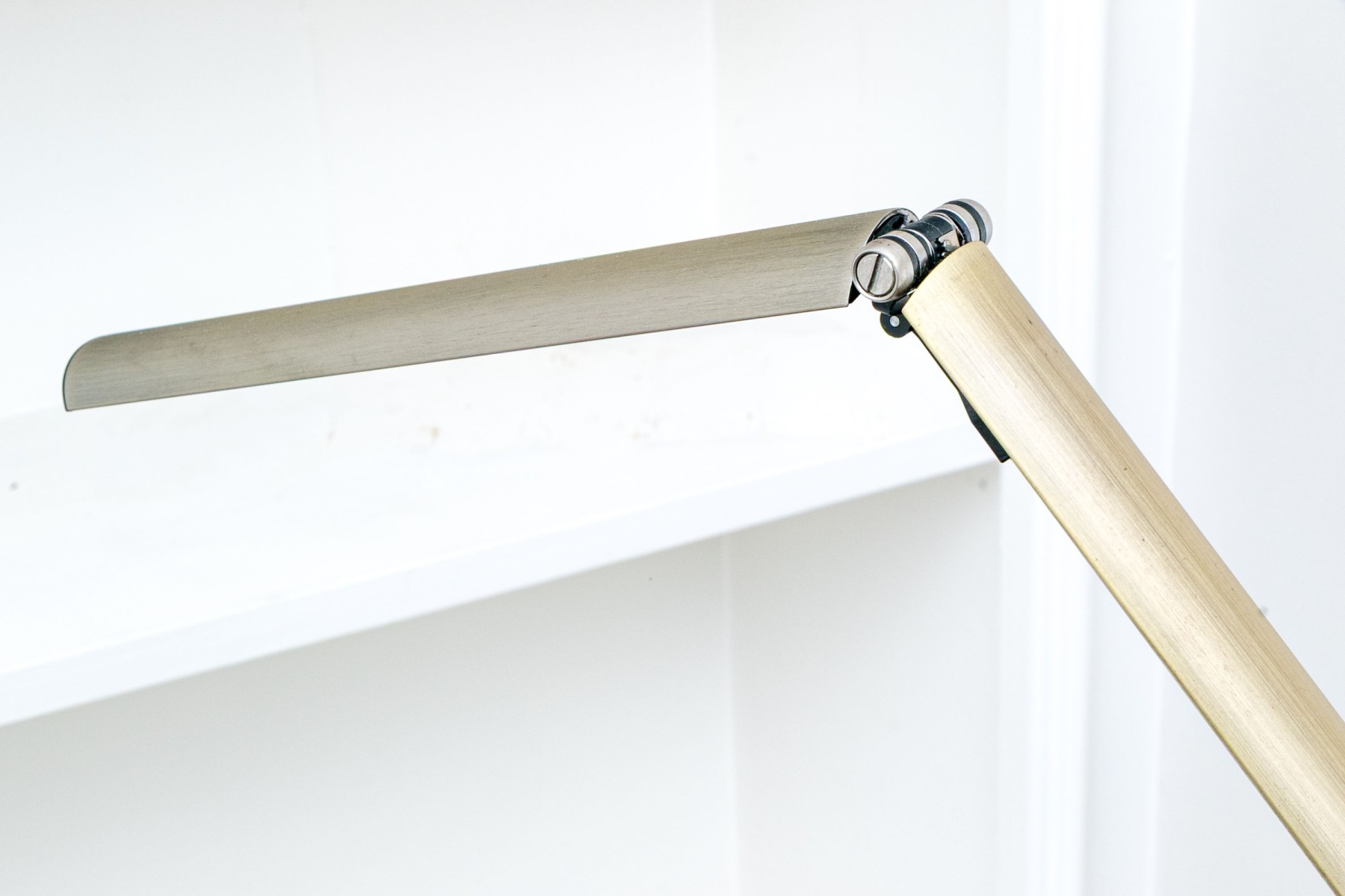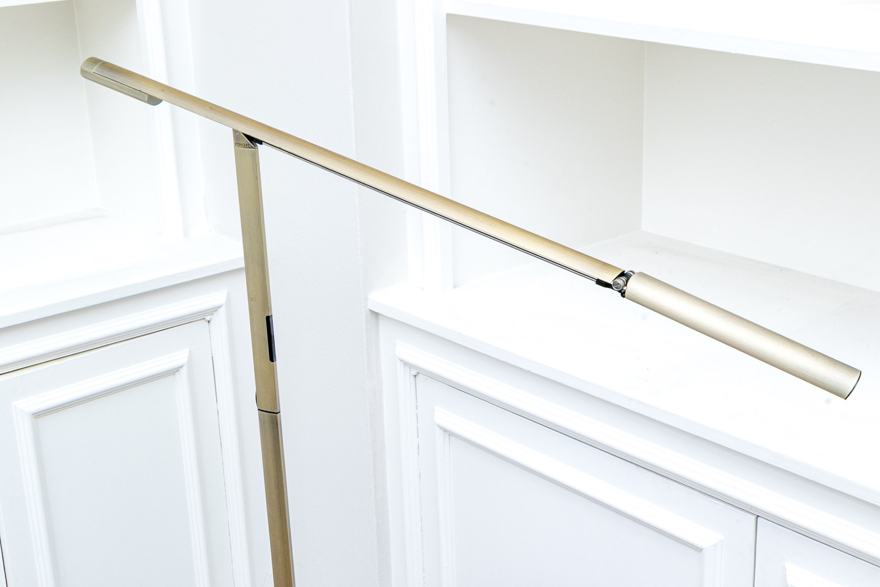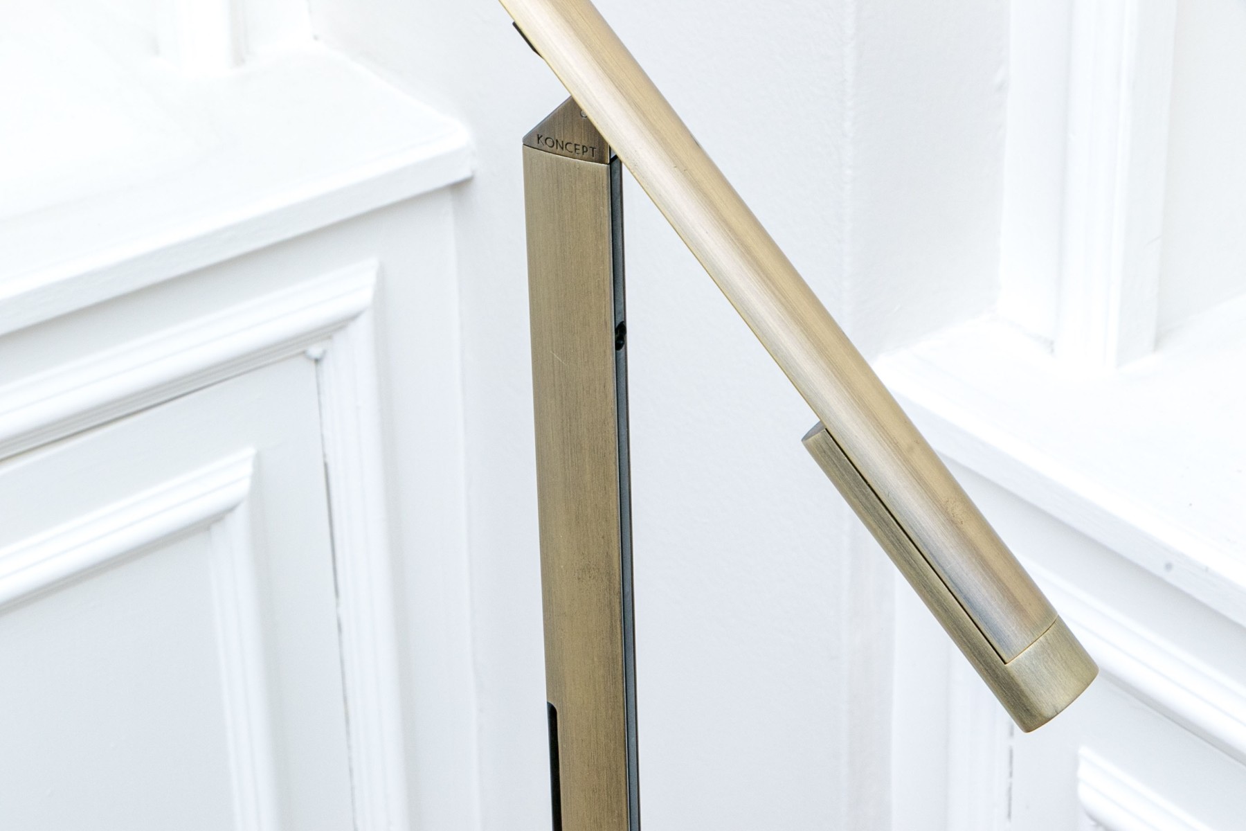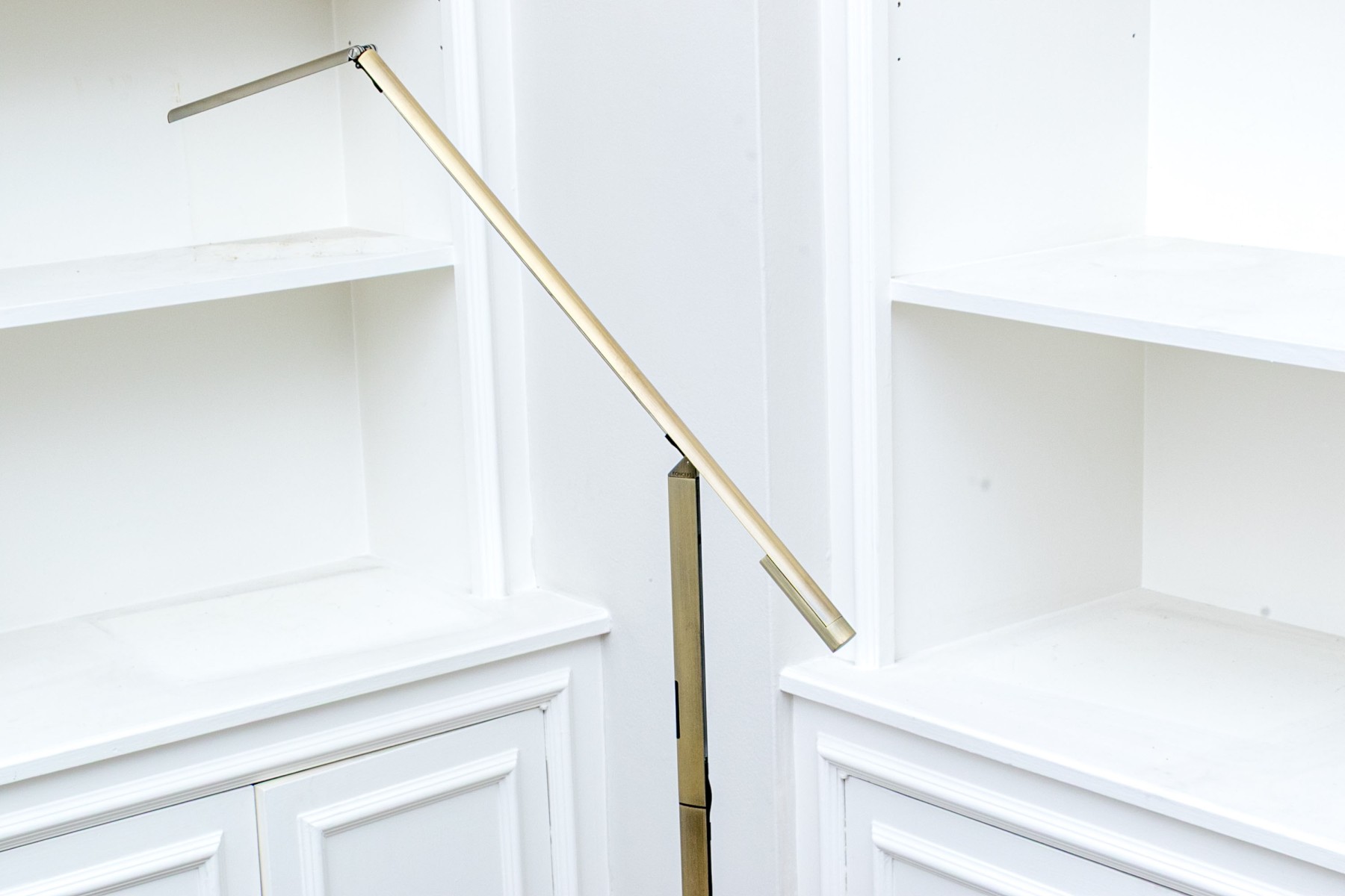 A sleek Koncept Model ELX-A-S-VBR "Equo" floor lamp in a stylish brass finish designed with a hinged head on an adjustable arm leading to a minimalist column over a circular foot.