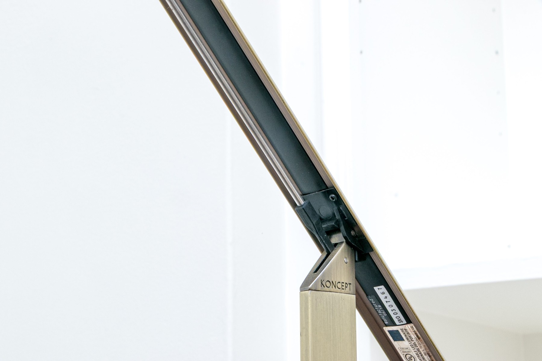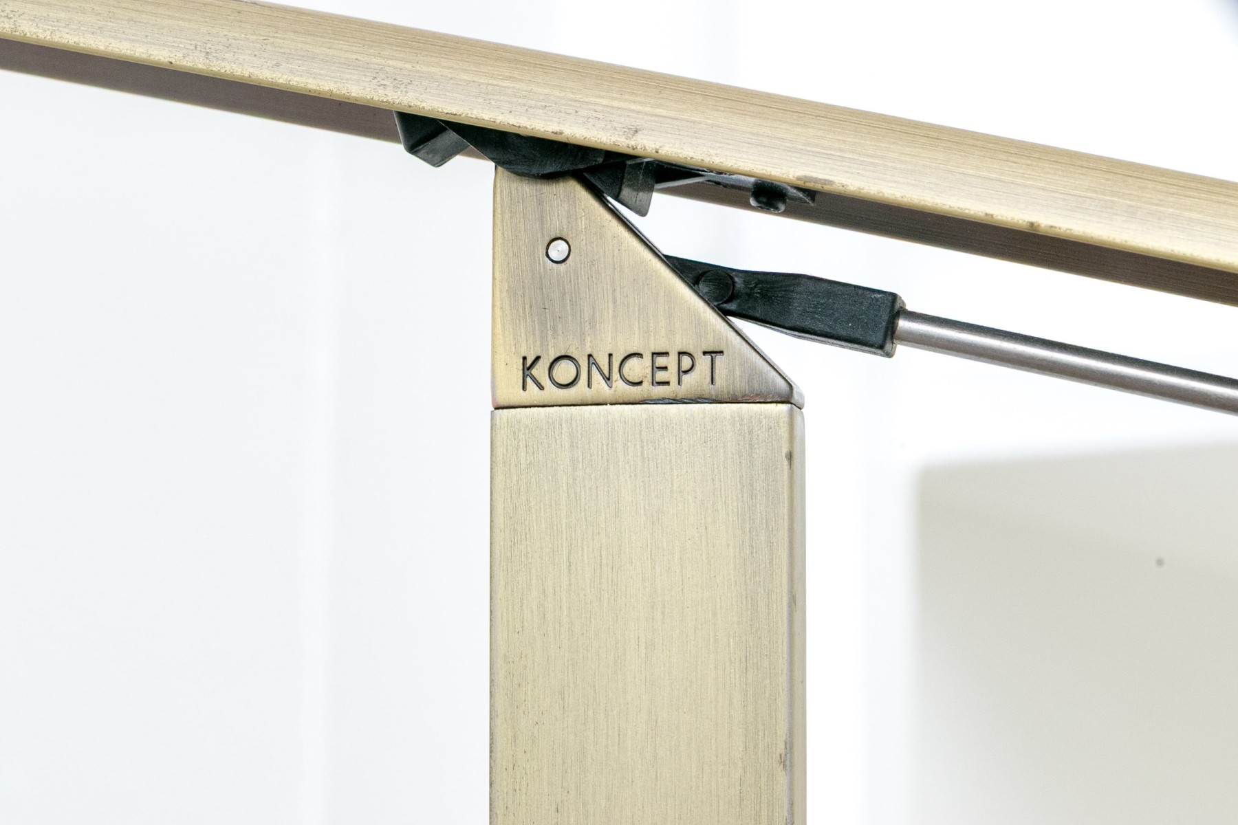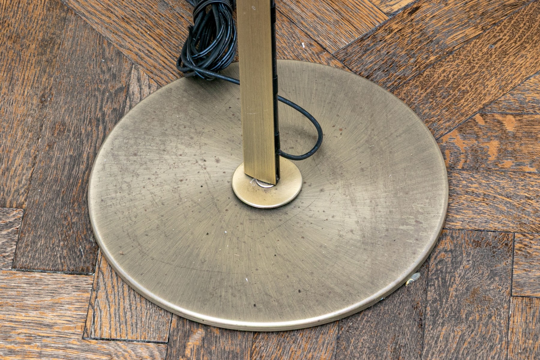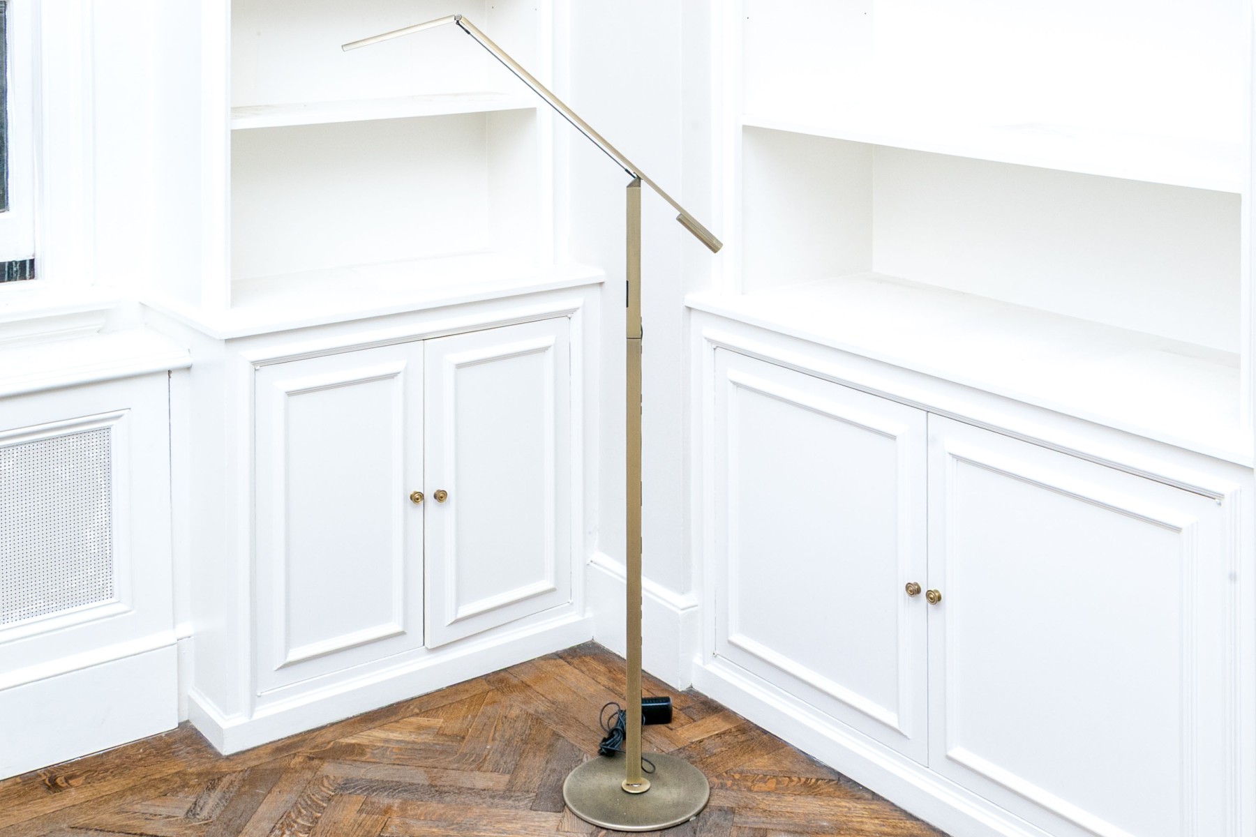A sleek Koncept Model ELX-A-S-VBR "Equo" floor lamp in a stylish brass finish designed with a hinged head on an adjustable arm leading to a minimalist column over a circular foot.