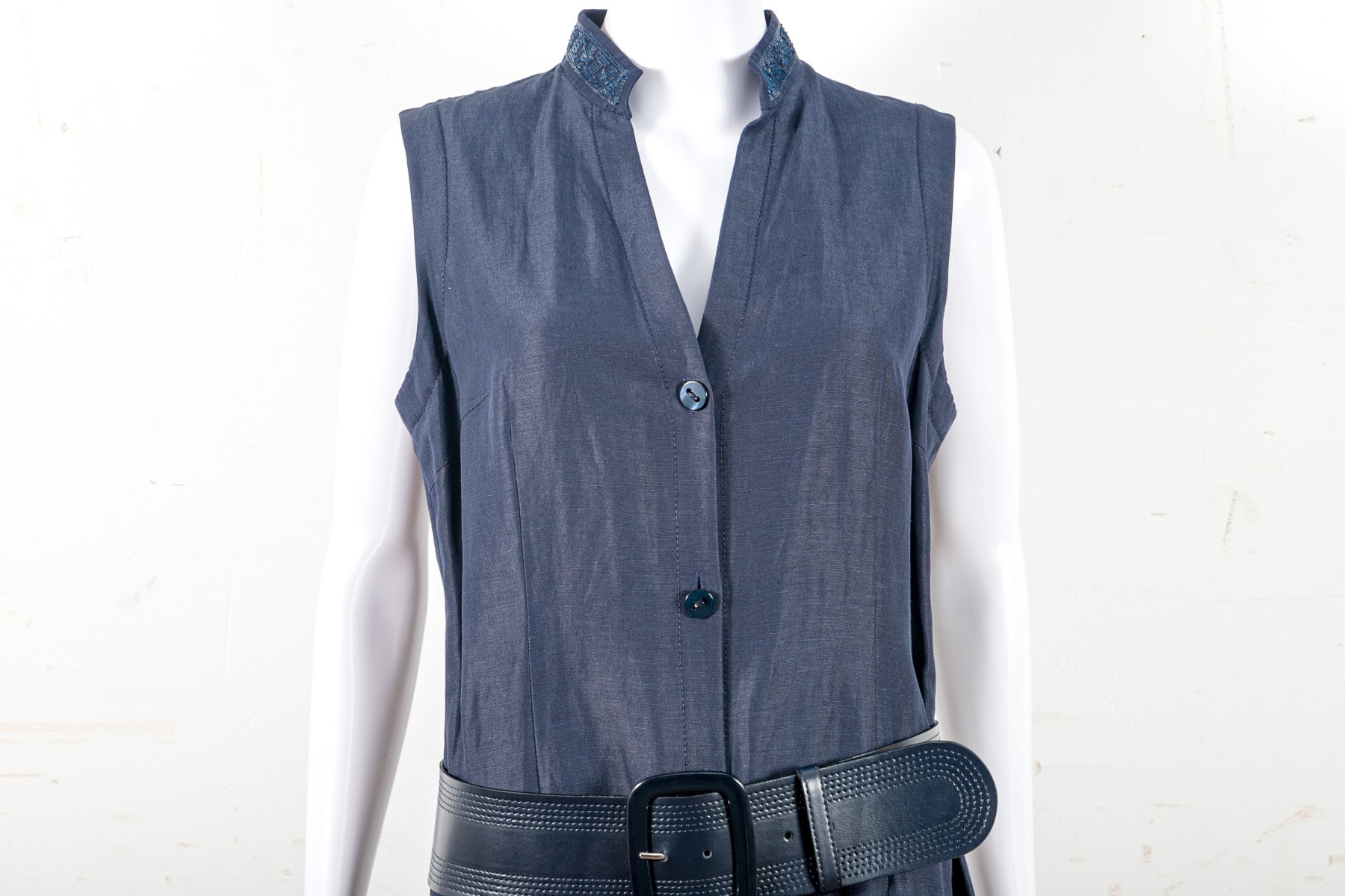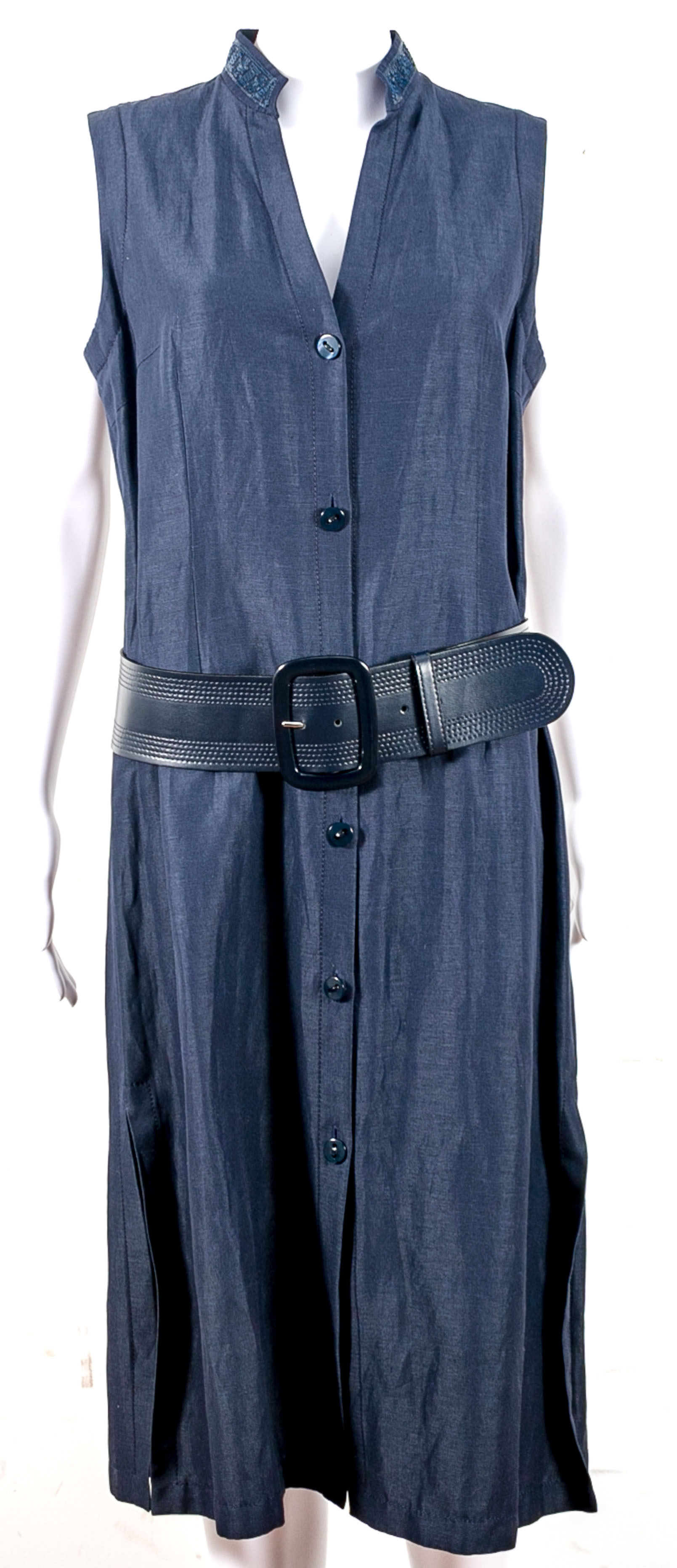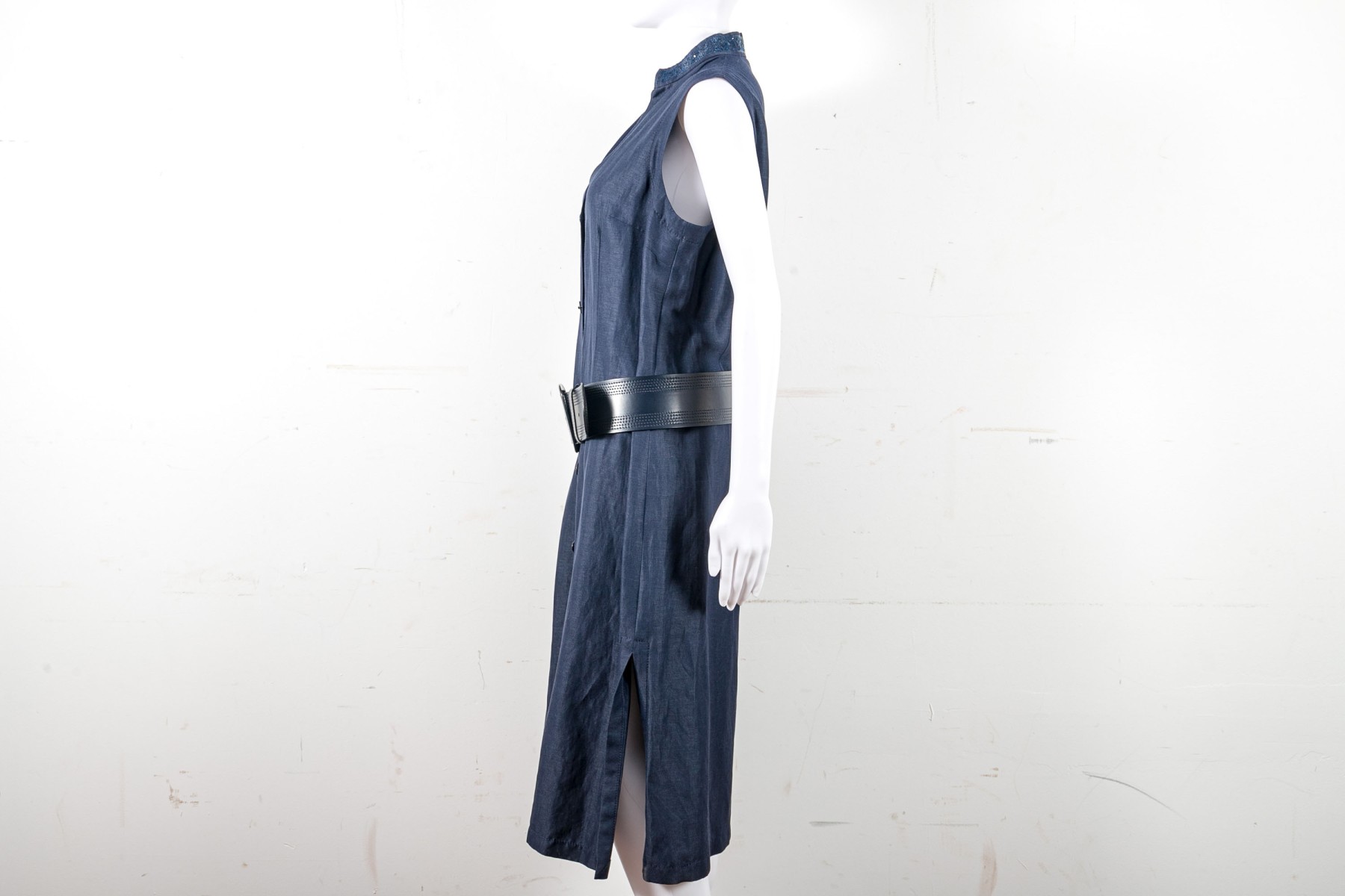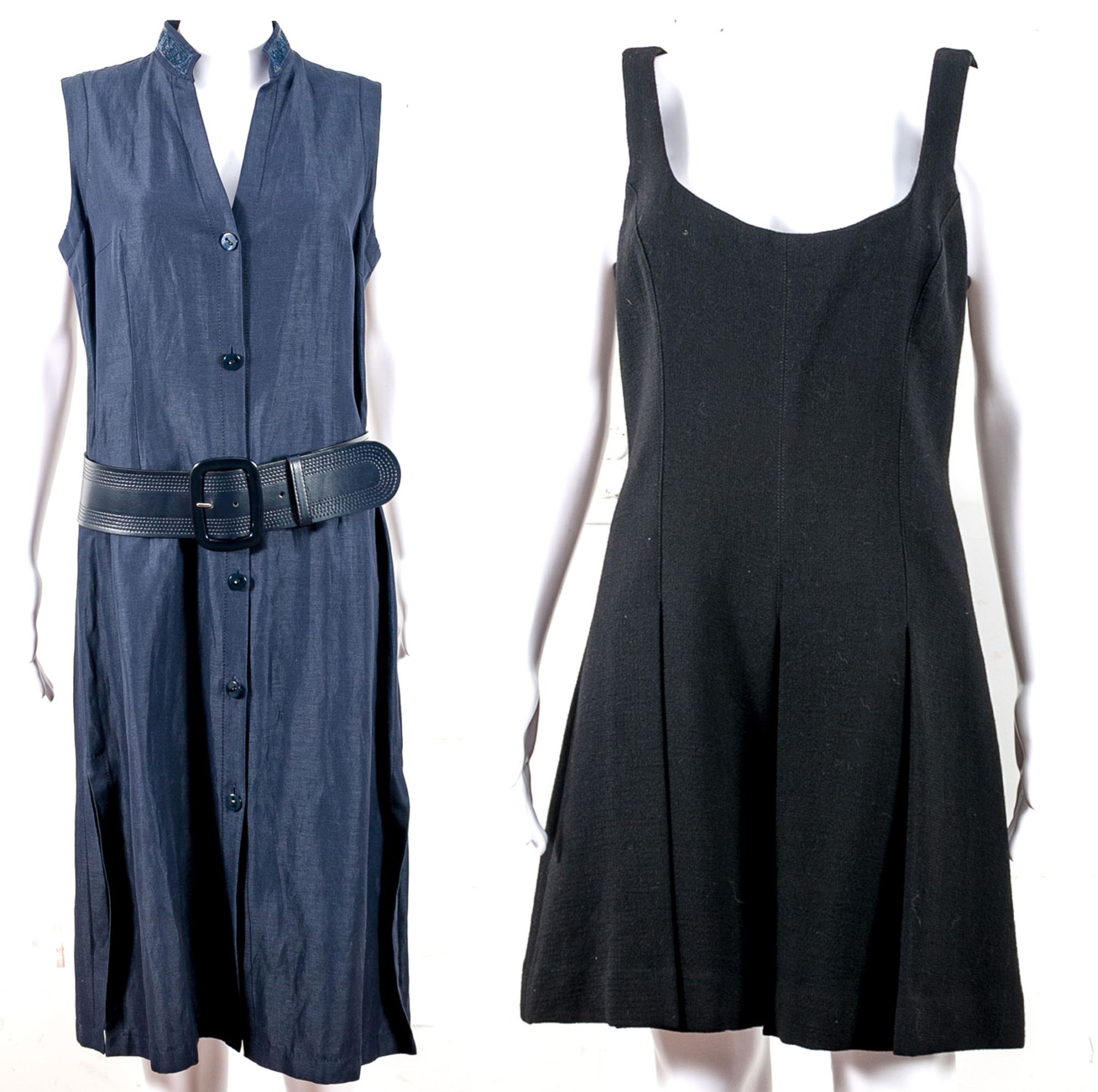 A fabulous duo of sleeveless cocktail or party dresses. The first, from Milly, sports a heavy-weight black wool-blend form with a pleated skirt; original tags attacked and labeled style 153WC012522. The second dress comes in a beautiful navy-blue blend of linen and silk, displaying a banded collar with sequin designs and a button-up front with dark blue buttons sporting a metallic shimmer.