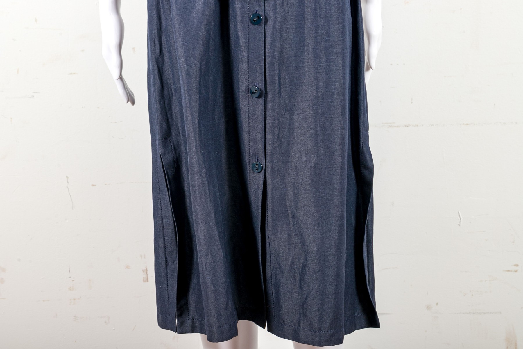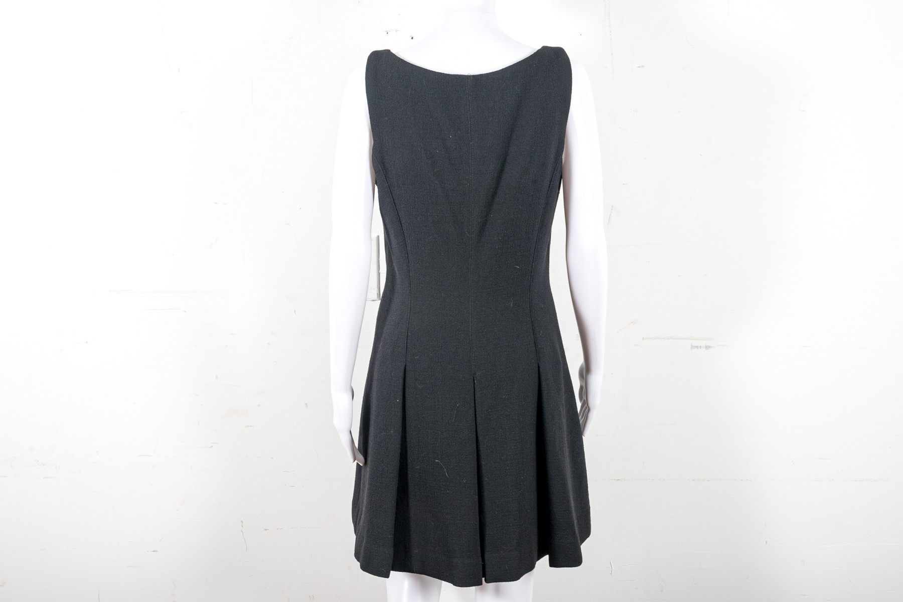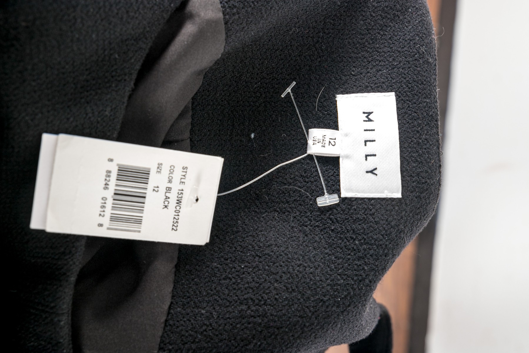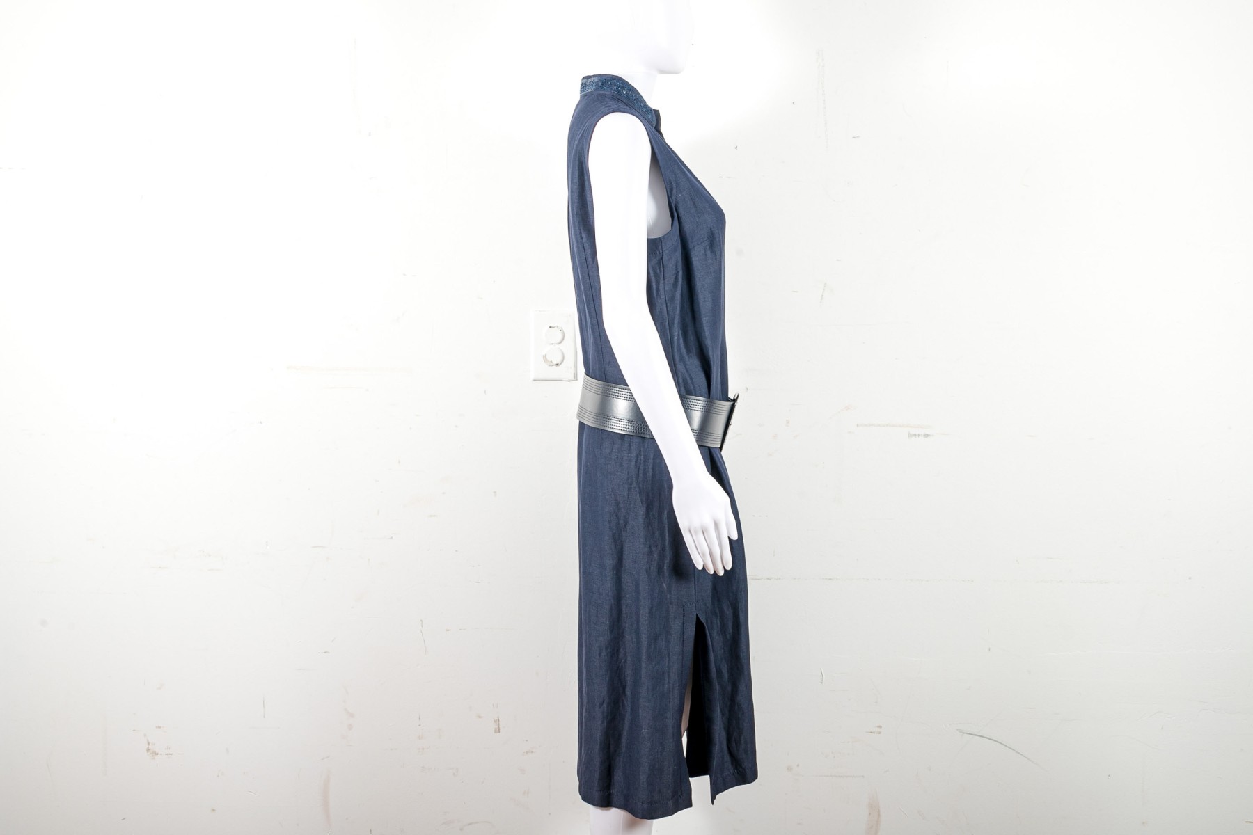 A fabulous duo of sleeveless cocktail or party dresses. The first, from Milly, sports a heavy-weight black wool-blend form with a pleated skirt; original tags attacked and labeled style 153WC012522. The second dress comes in a beautiful navy-blue blend of linen and silk, displaying a banded collar with sequin designs and a button-up front with dark blue buttons sporting a metallic shimmer.