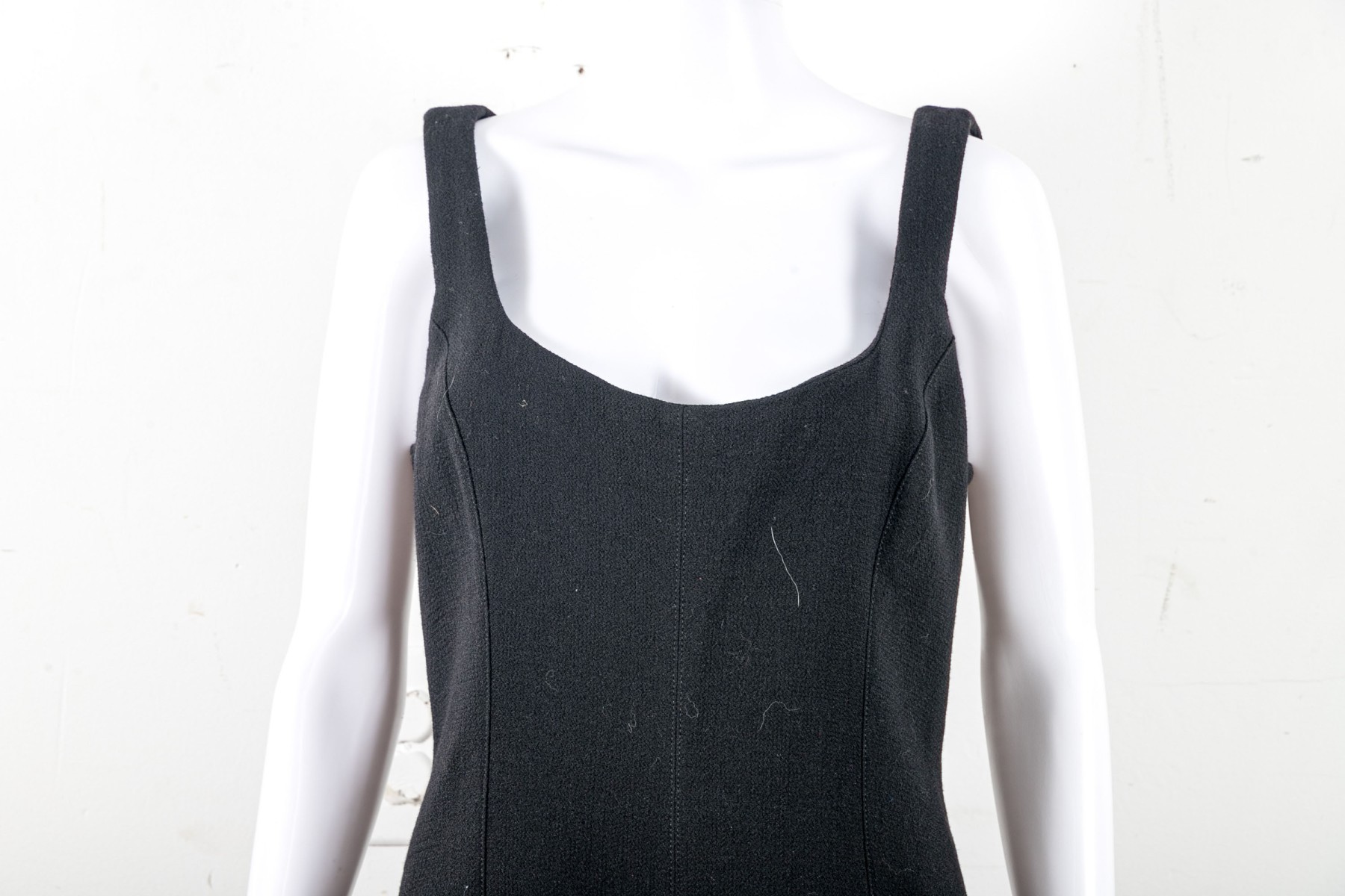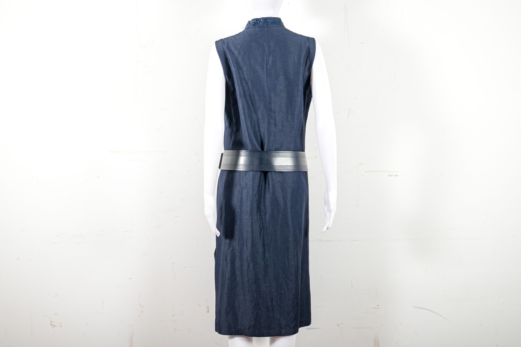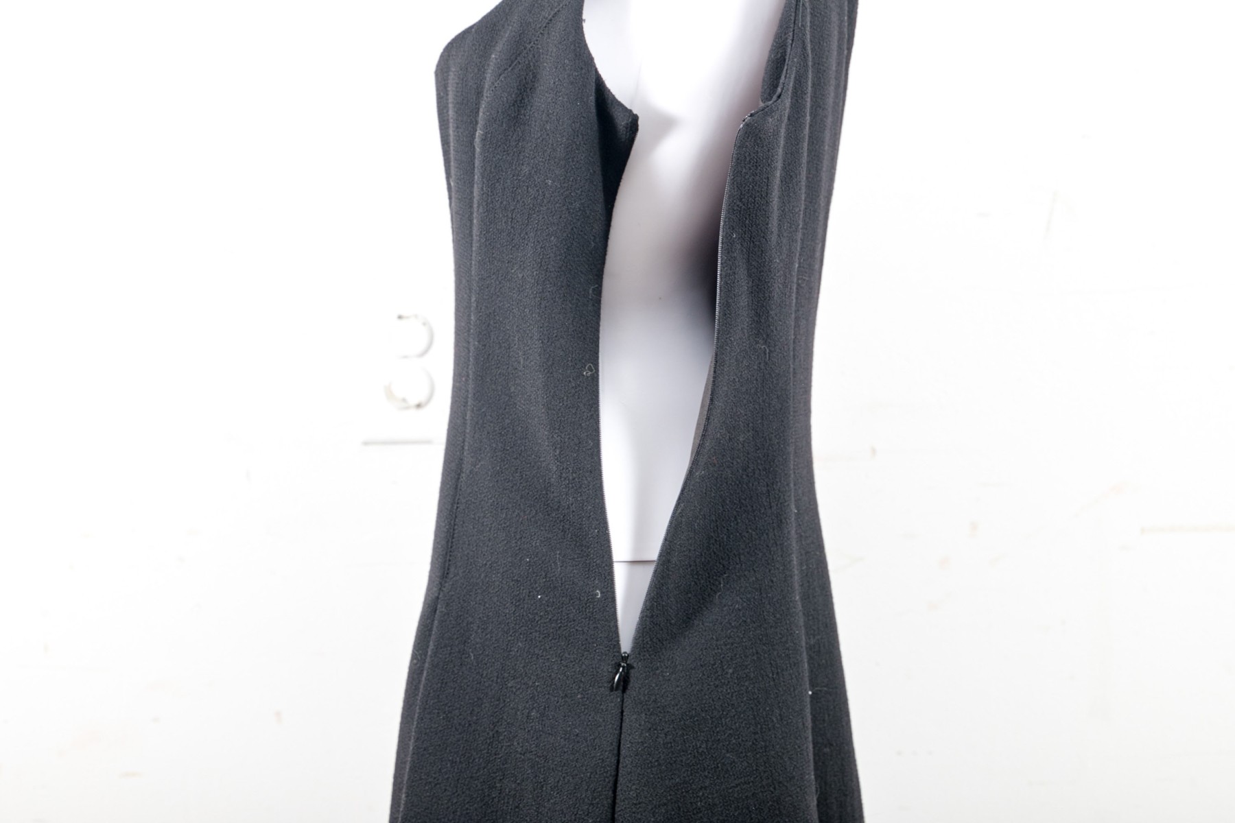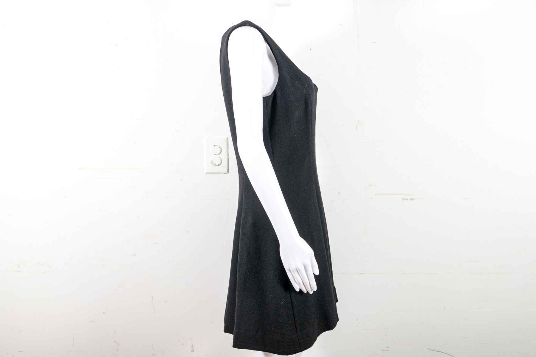 A fabulous duo of sleeveless cocktail or party dresses. The first, from Milly, sports a heavy-weight black wool-blend form with a pleated skirt; original tags attacked and labeled style 153WC012522. The second dress comes in a beautiful navy-blue blend of linen and silk, displaying a banded collar with sequin designs and a button-up front with dark blue buttons sporting a metallic shimmer.