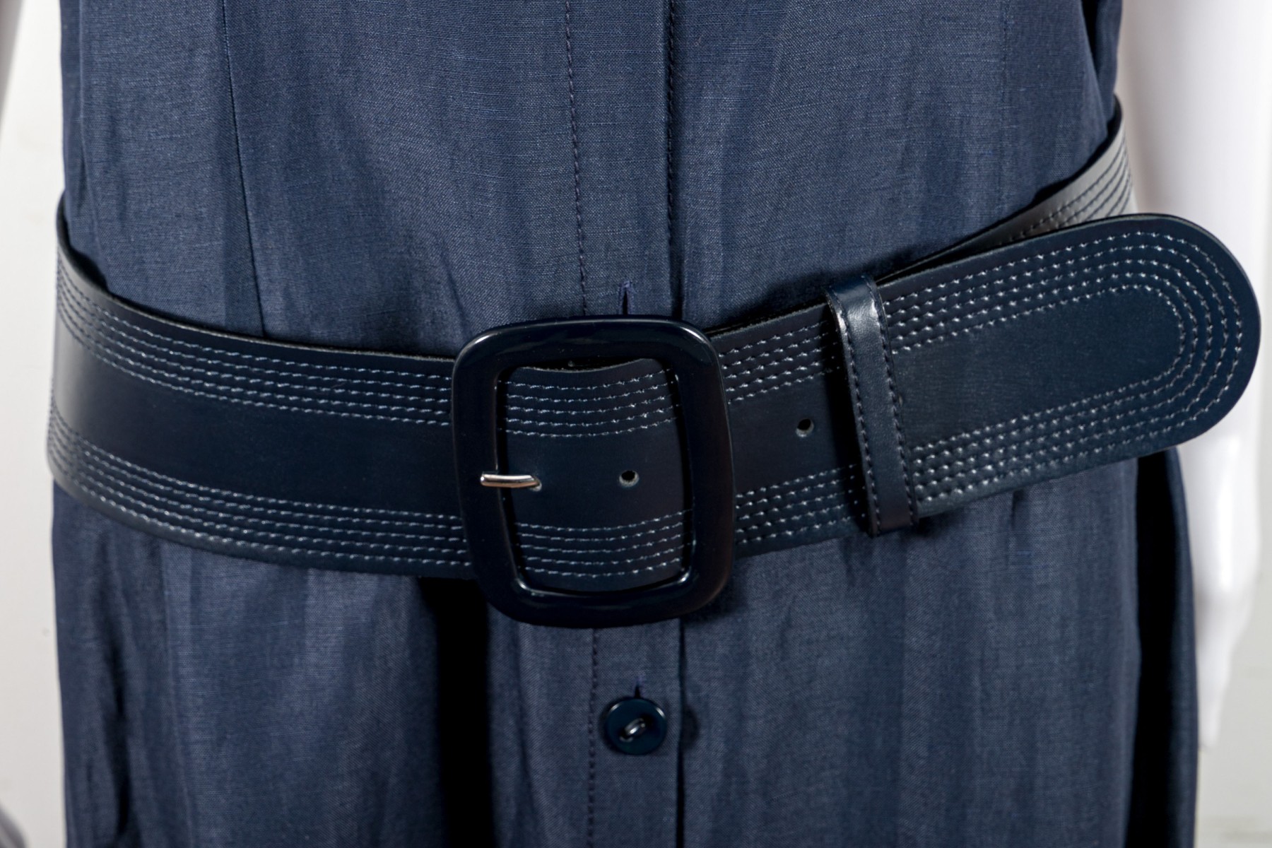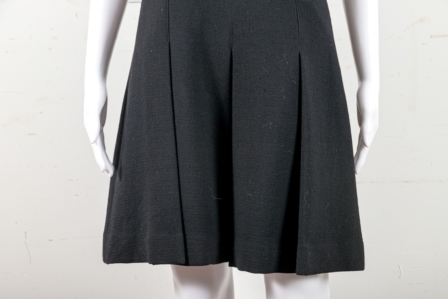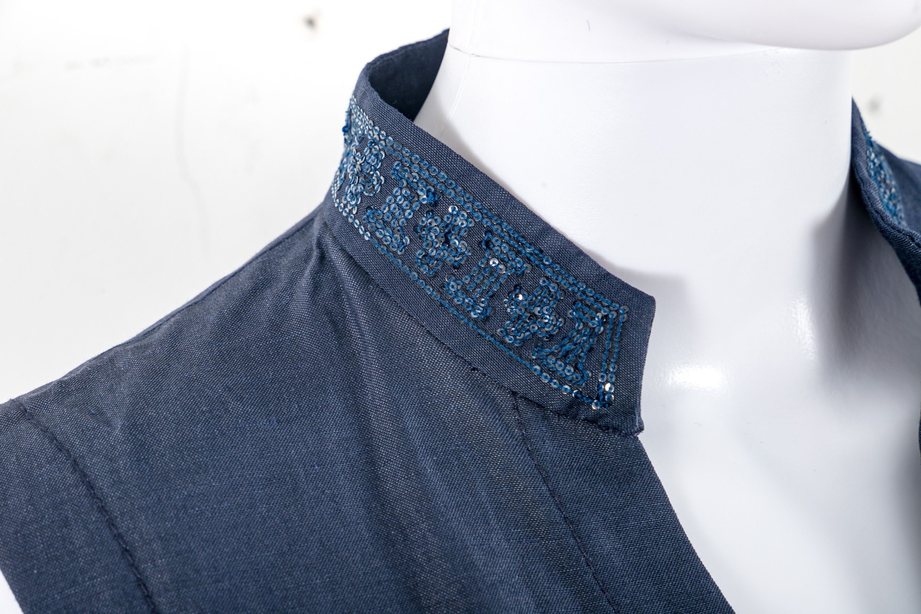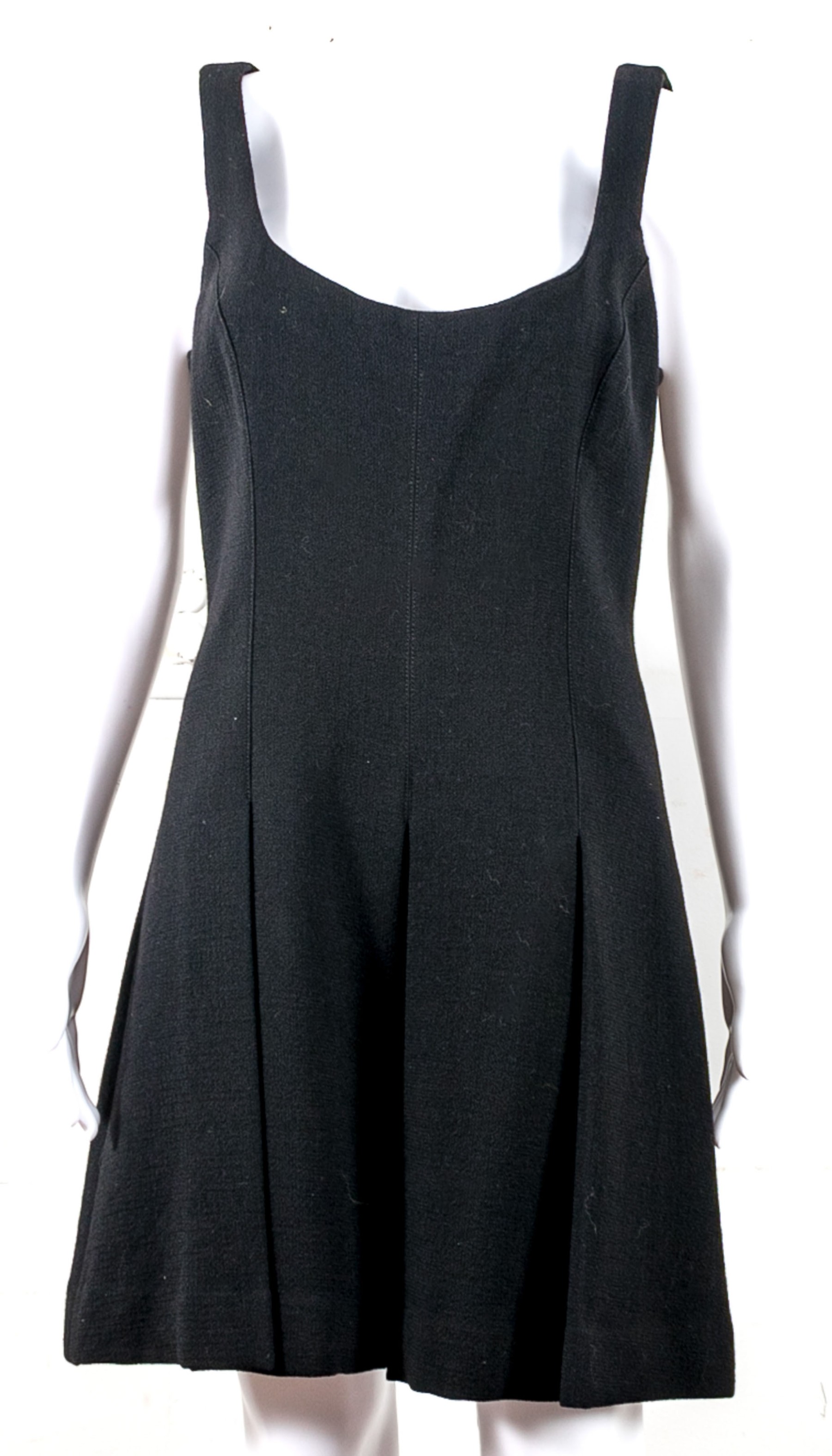 A fabulous duo of sleeveless cocktail or party dresses. The first, from Milly, sports a heavy-weight black wool-blend form with a pleated skirt; original tags attacked and labeled style 153WC012522. The second dress comes in a beautiful navy-blue blend of linen and silk, displaying a banded collar with sequin designs and a button-up front with dark blue buttons sporting a metallic shimmer.