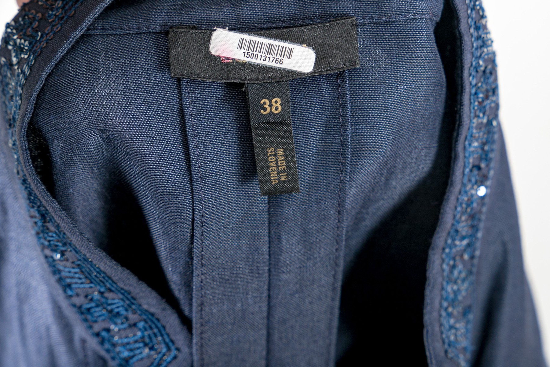 Displays well. The silk-linen dress has a manufacturer's label on the inner neck, but a barcode that cannot be removed is covering the name.