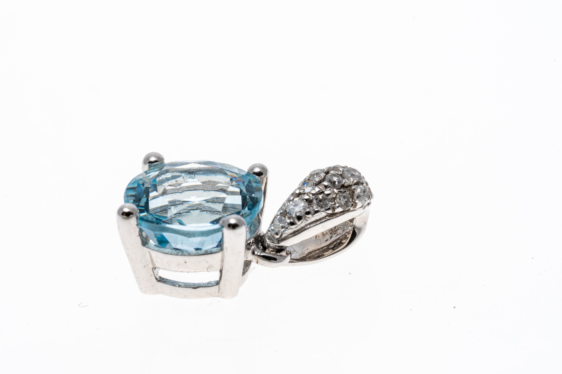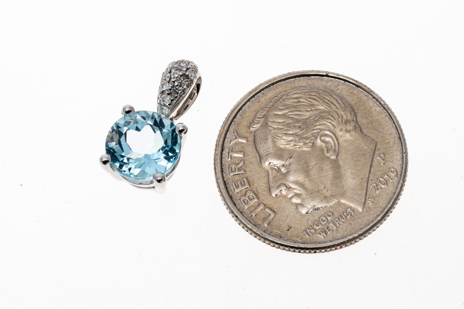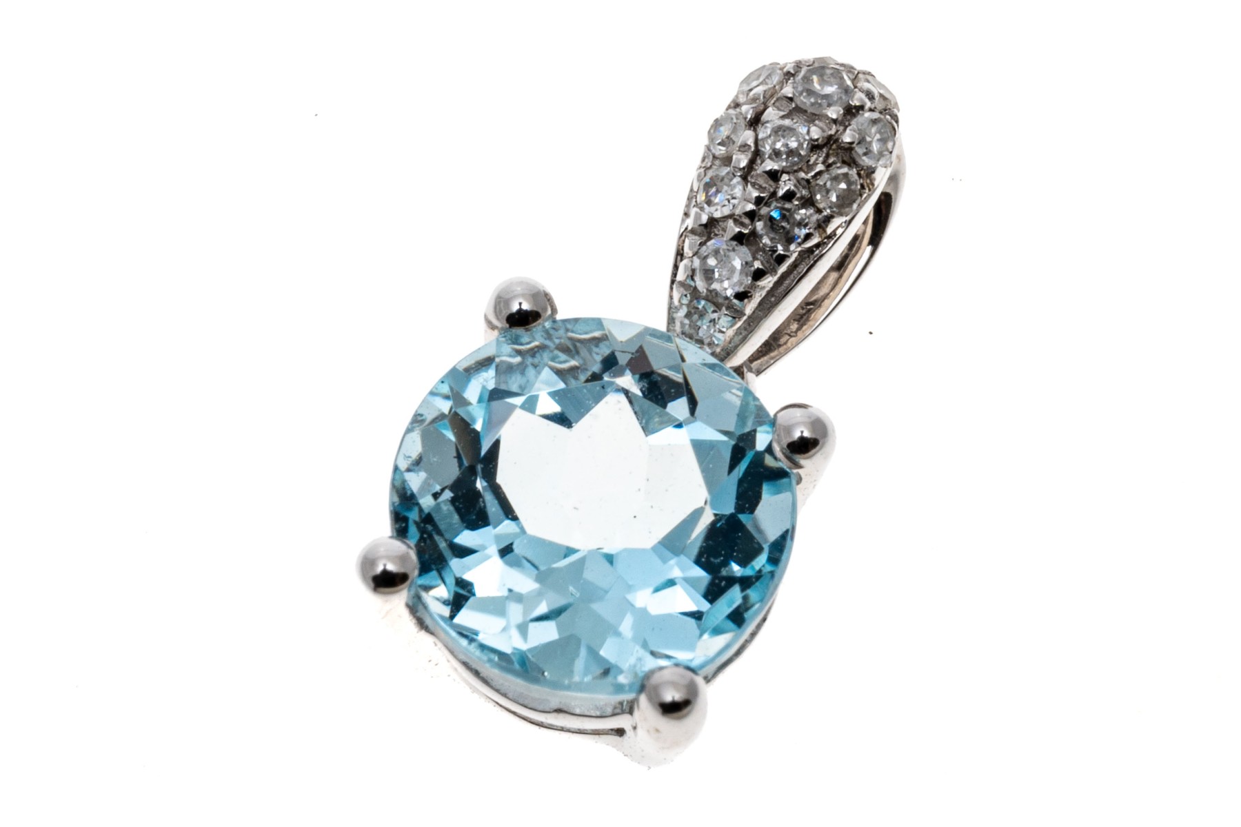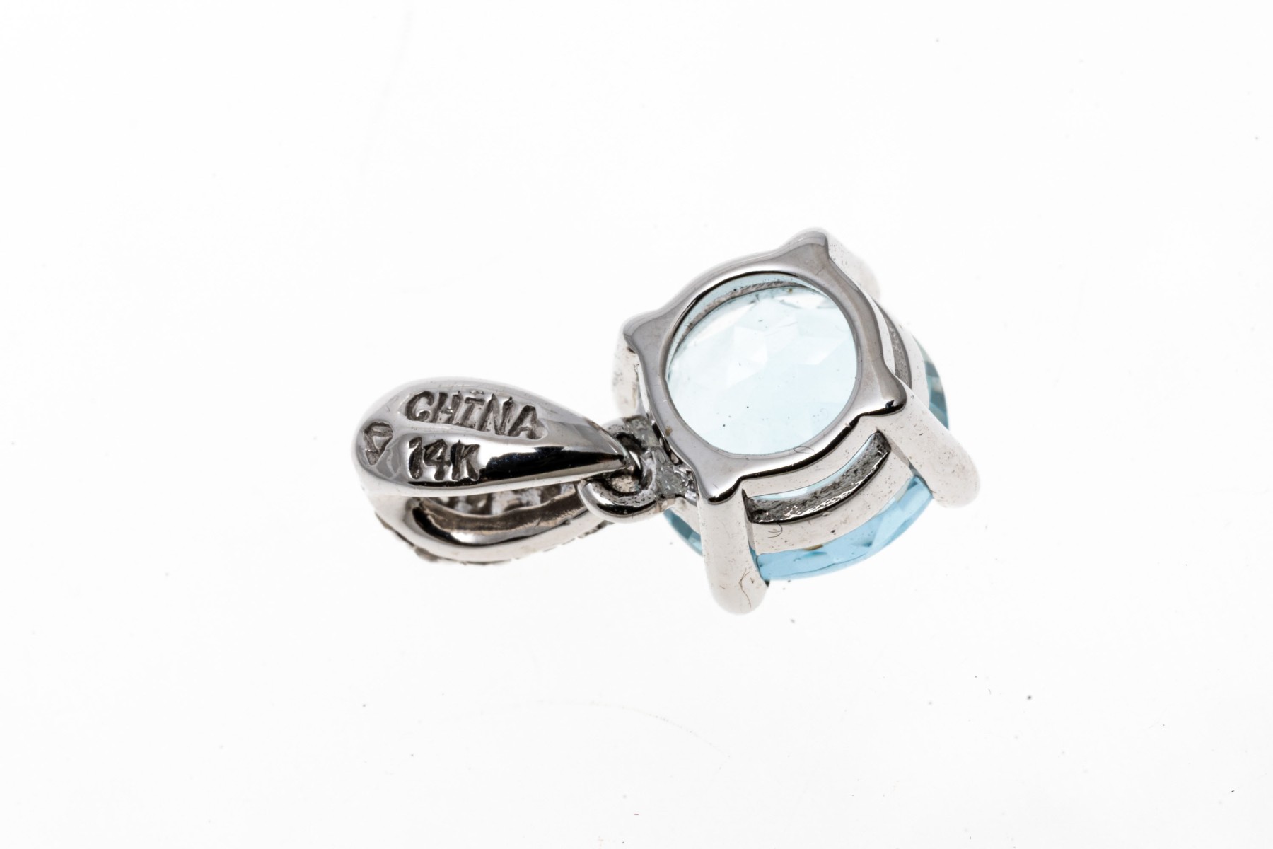 Slight pendant created from 14K white gold and prong set with a single round faceted aquamarine stone, approximately 1.0 cts. Accent diamonds set into the bale.