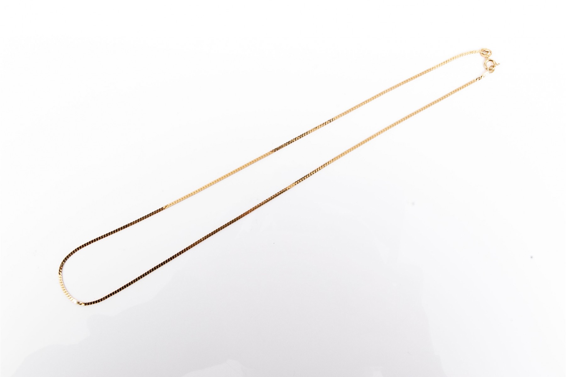 Slim herringbone chain necklace created from bright polished 14K yellow gold. The delicate chain ends in a spring ring clasp.
