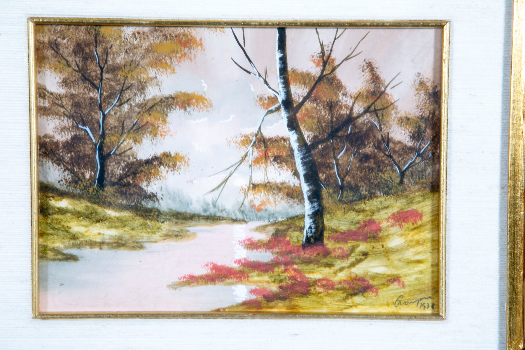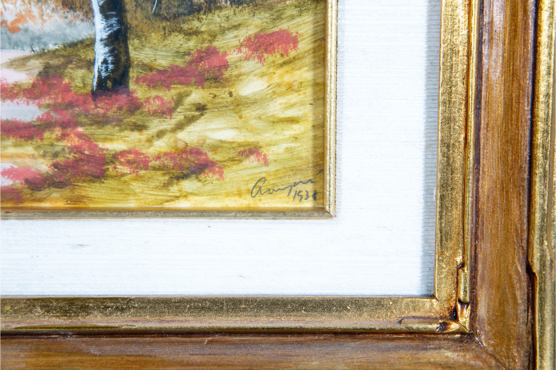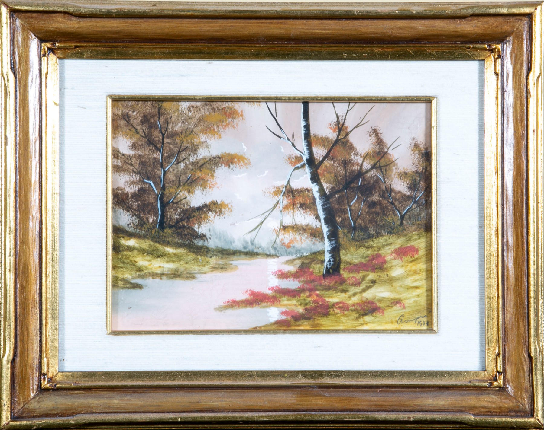 Unknown artist, signed indistinctly in the bottom right-hand corner, dated 1938. The oil landscape is displayed within an ornate gold-tone wood frame with a glass facing.