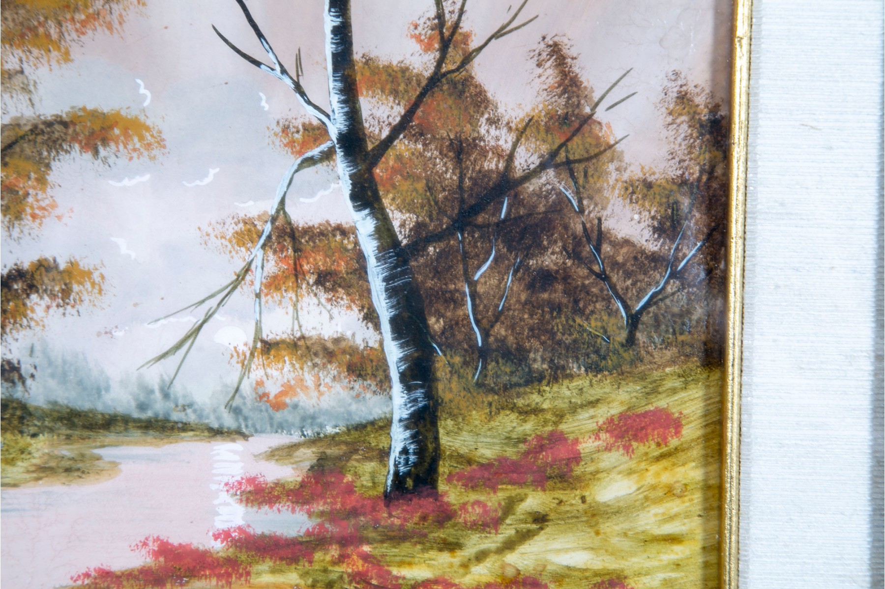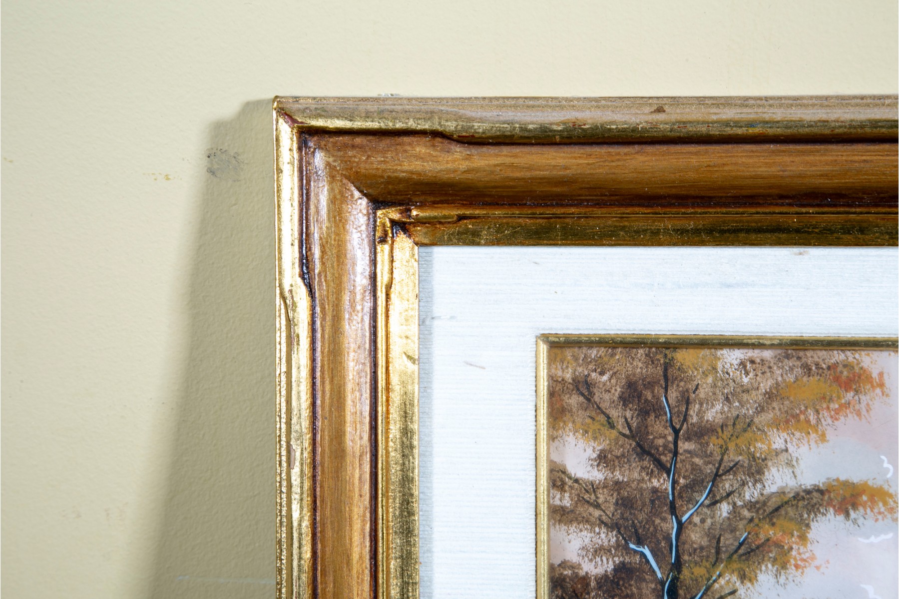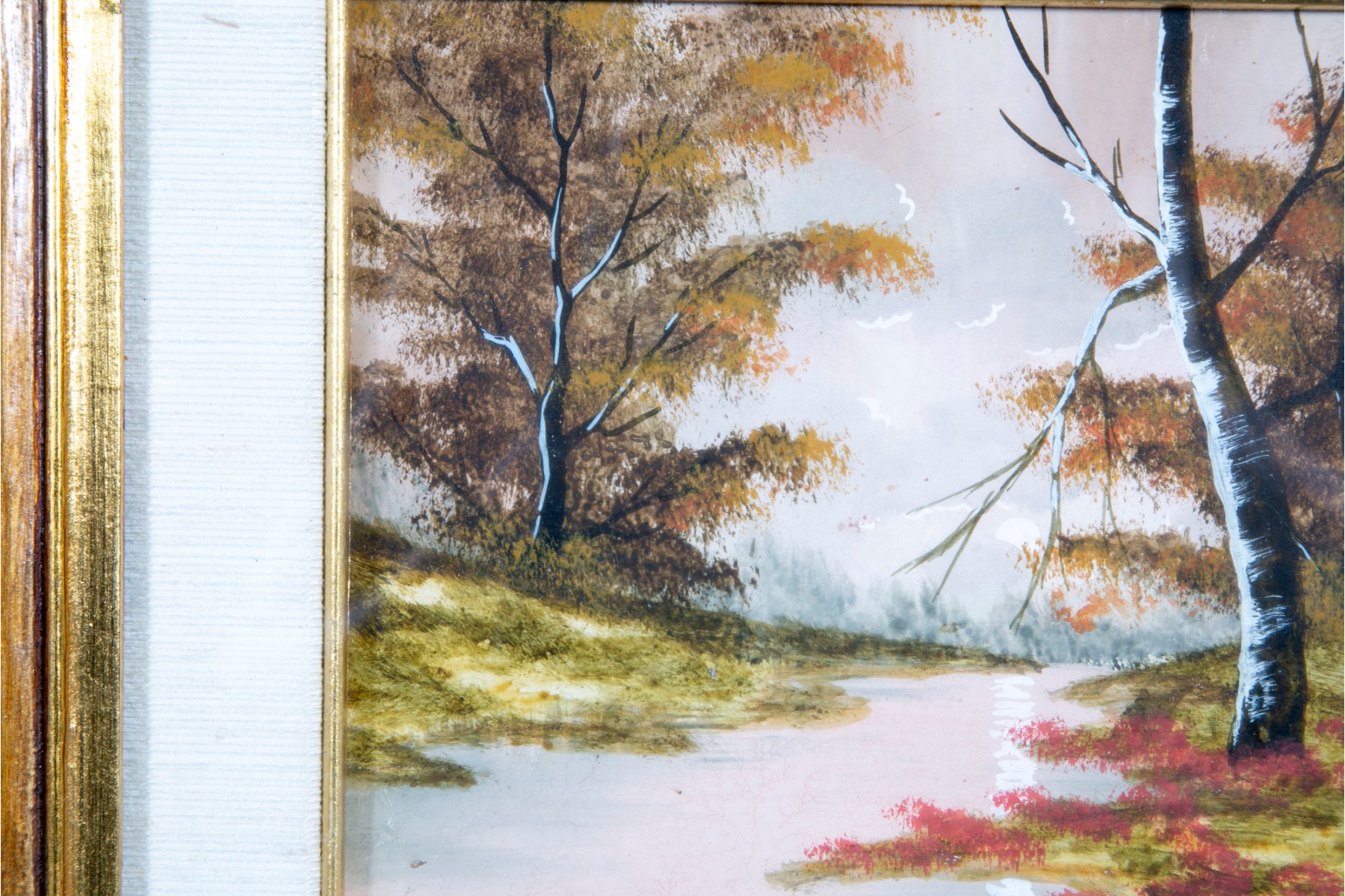 Unknown artist, signed indistinctly in the bottom right-hand corner, dated 1938. The oil landscape is displayed within an ornate gold-tone wood frame with a glass facing.