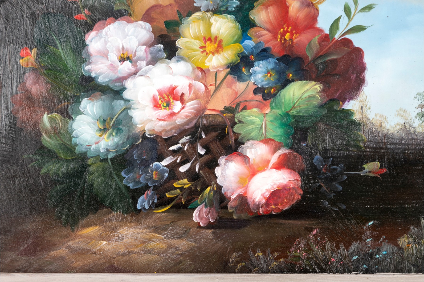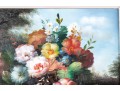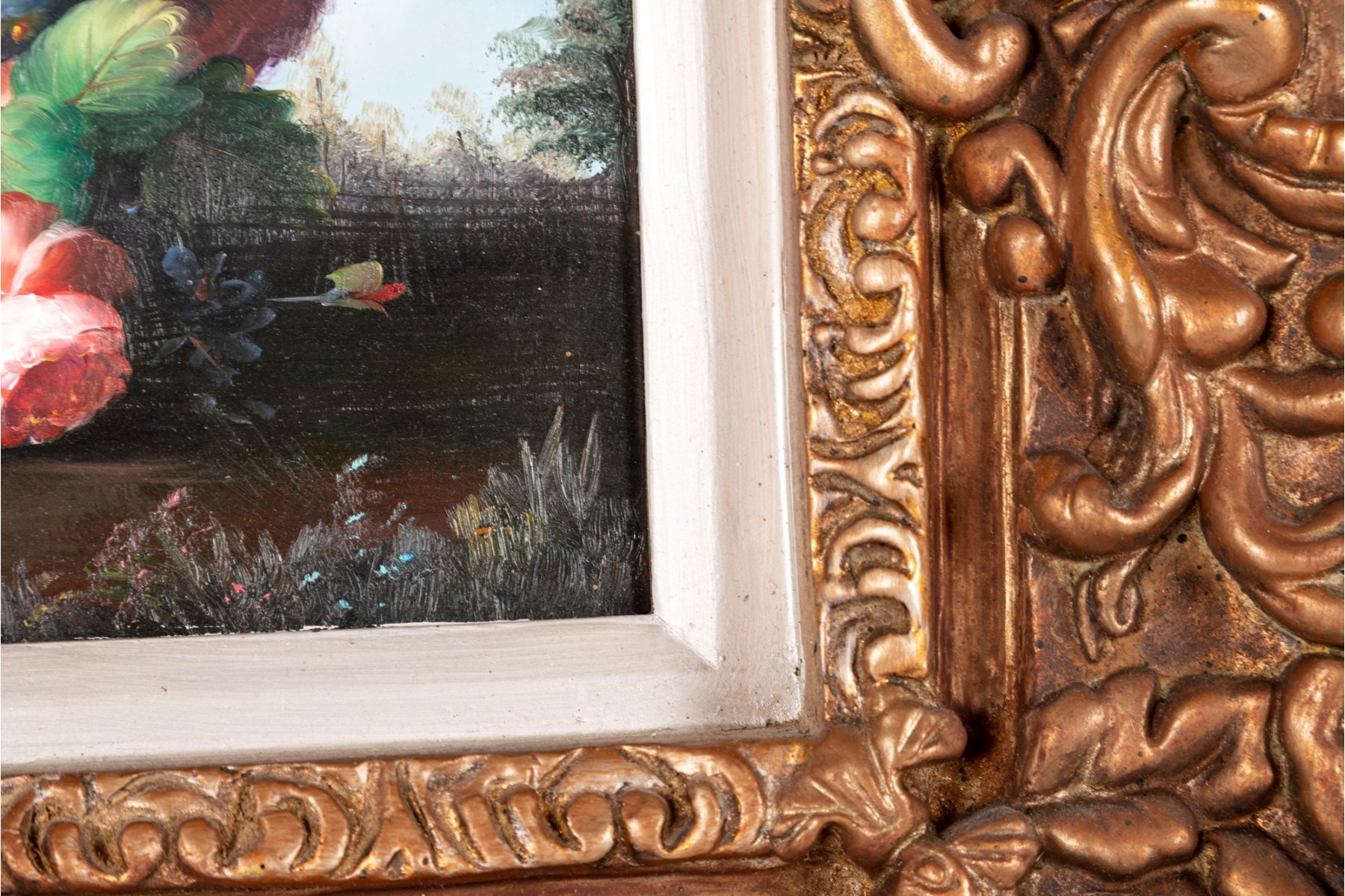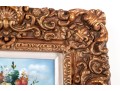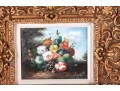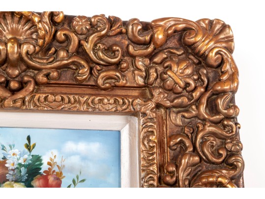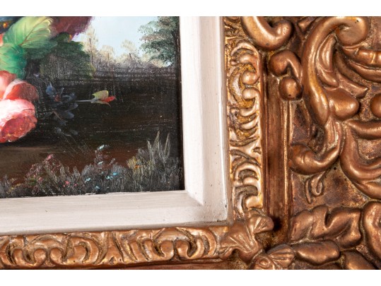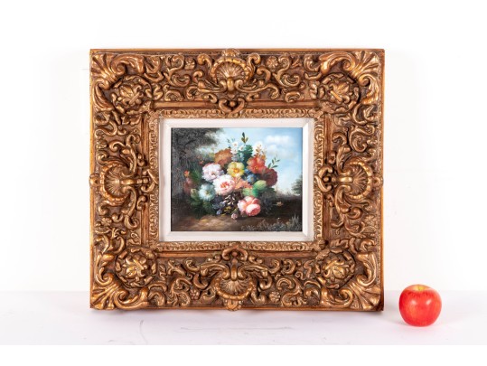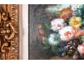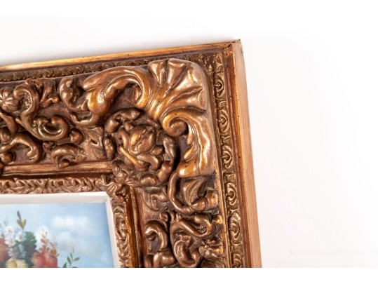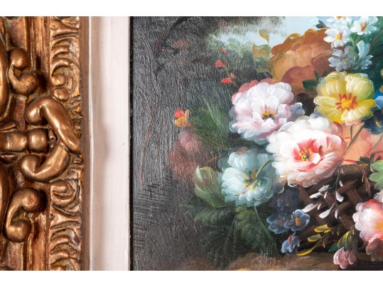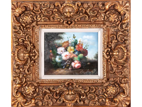 A marvelous painting on board -- oils composed into a lovely flower arrangement, unsigned. The artwork is presented openly within a highly carved gilt wood frame. Circa mid 20th century.