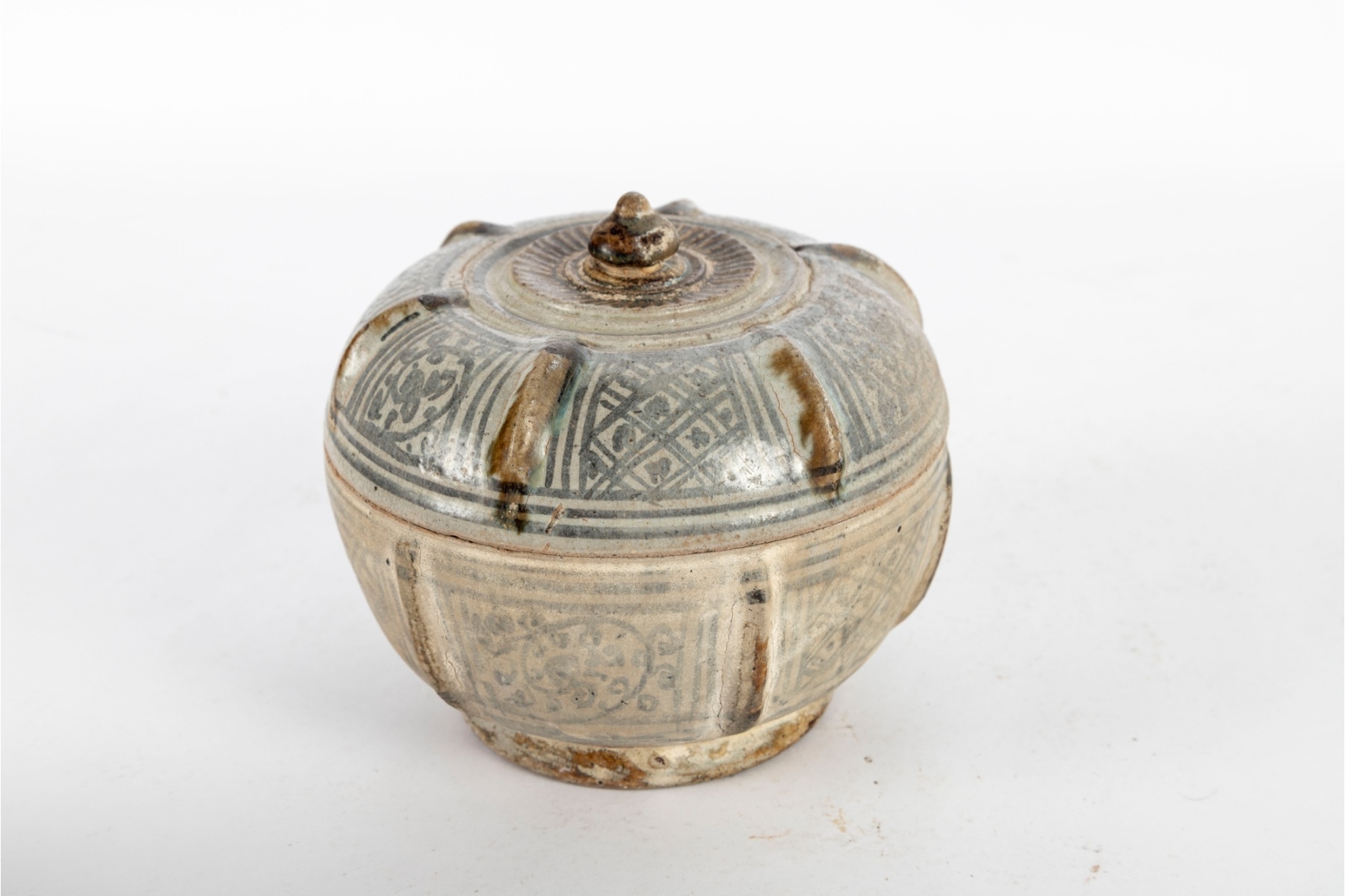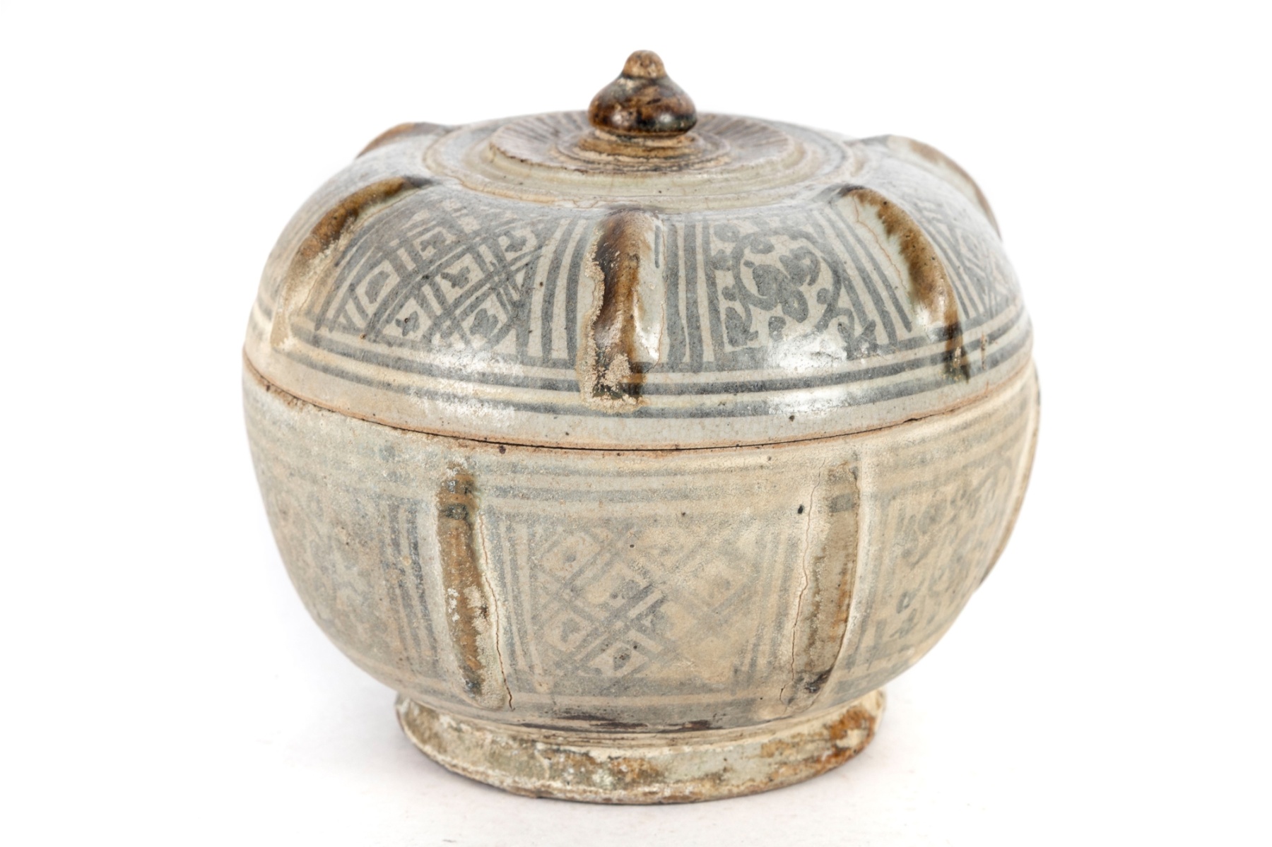 Possibly Khmer or Thai in origin, this antique stoneware jar features an incised geometric and floral pattern beneath a celadon-toned glaze. The domed lid is topped with a small round finial and decorated to match the body with repeating incised motifs and vertical rib accents. The piece rests on a short circular foot and displays an earthy, rustic aesthetic typical of early regional ceramic traditions.
