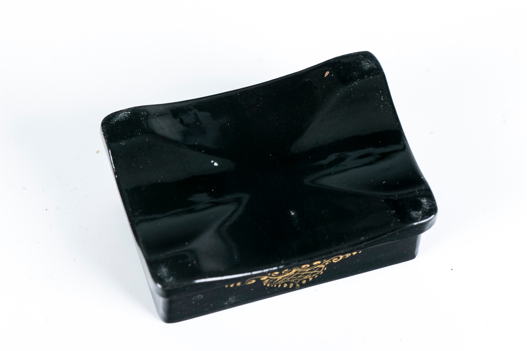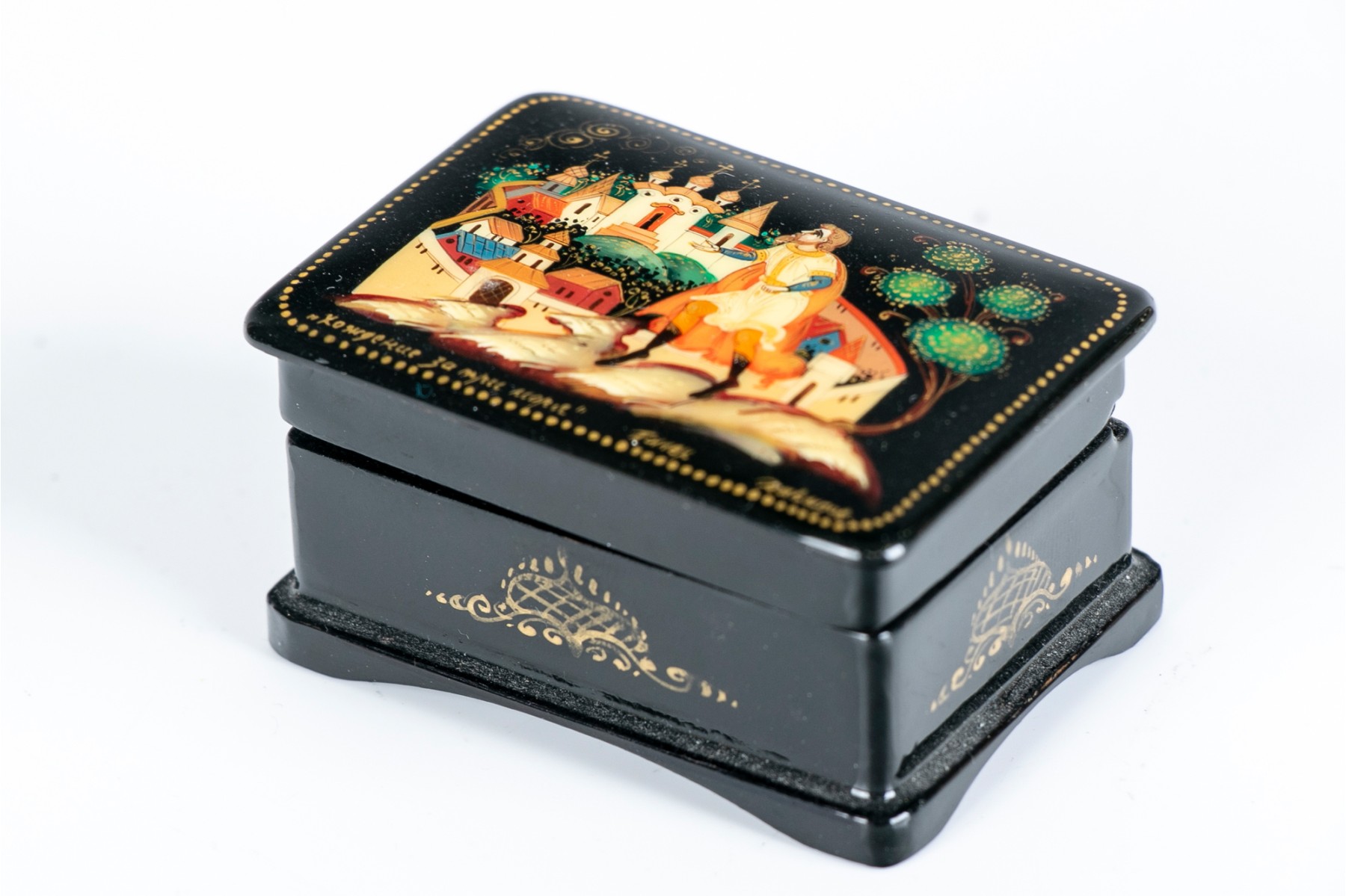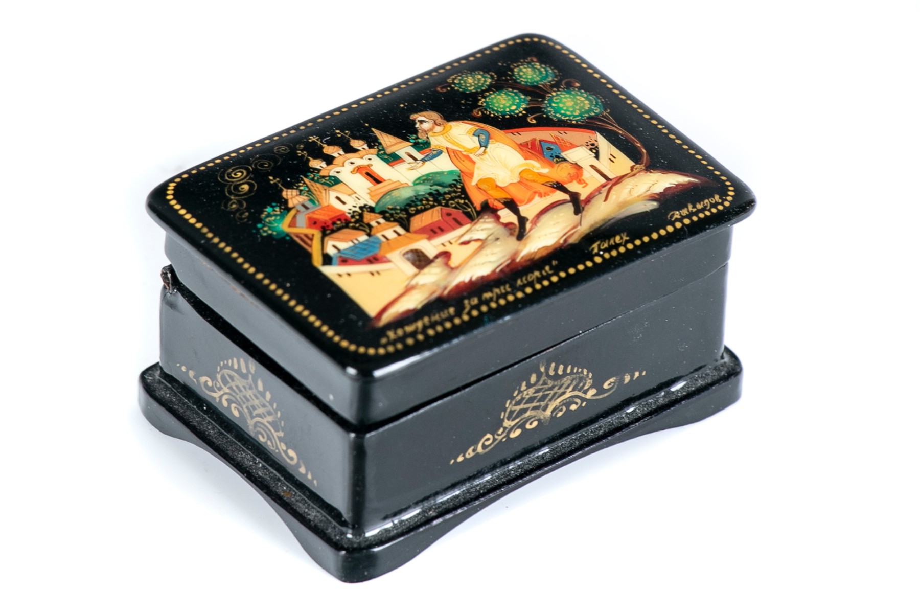 Small black lacquered box, hand painted with a figural landscape and gold filigree embellishments. The box is signed across the bottom edge.