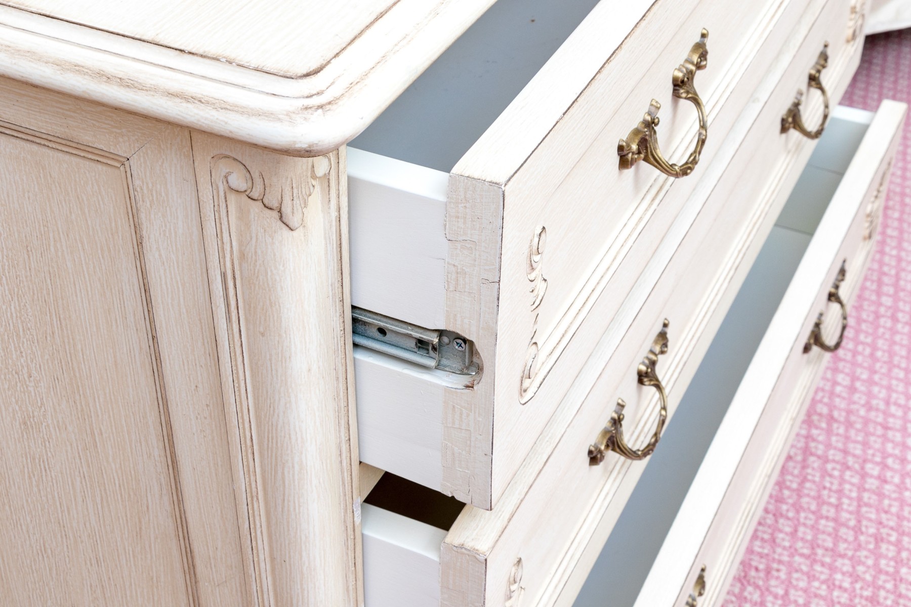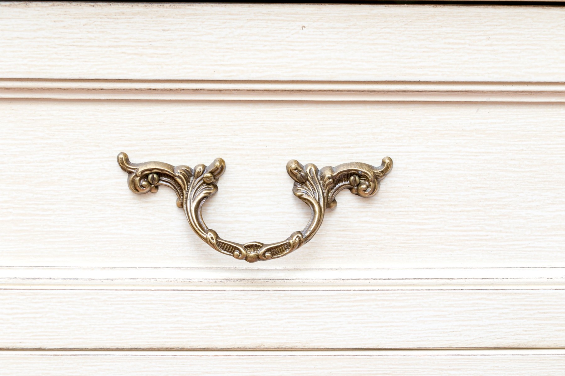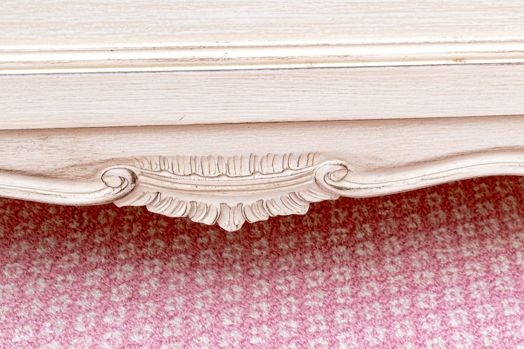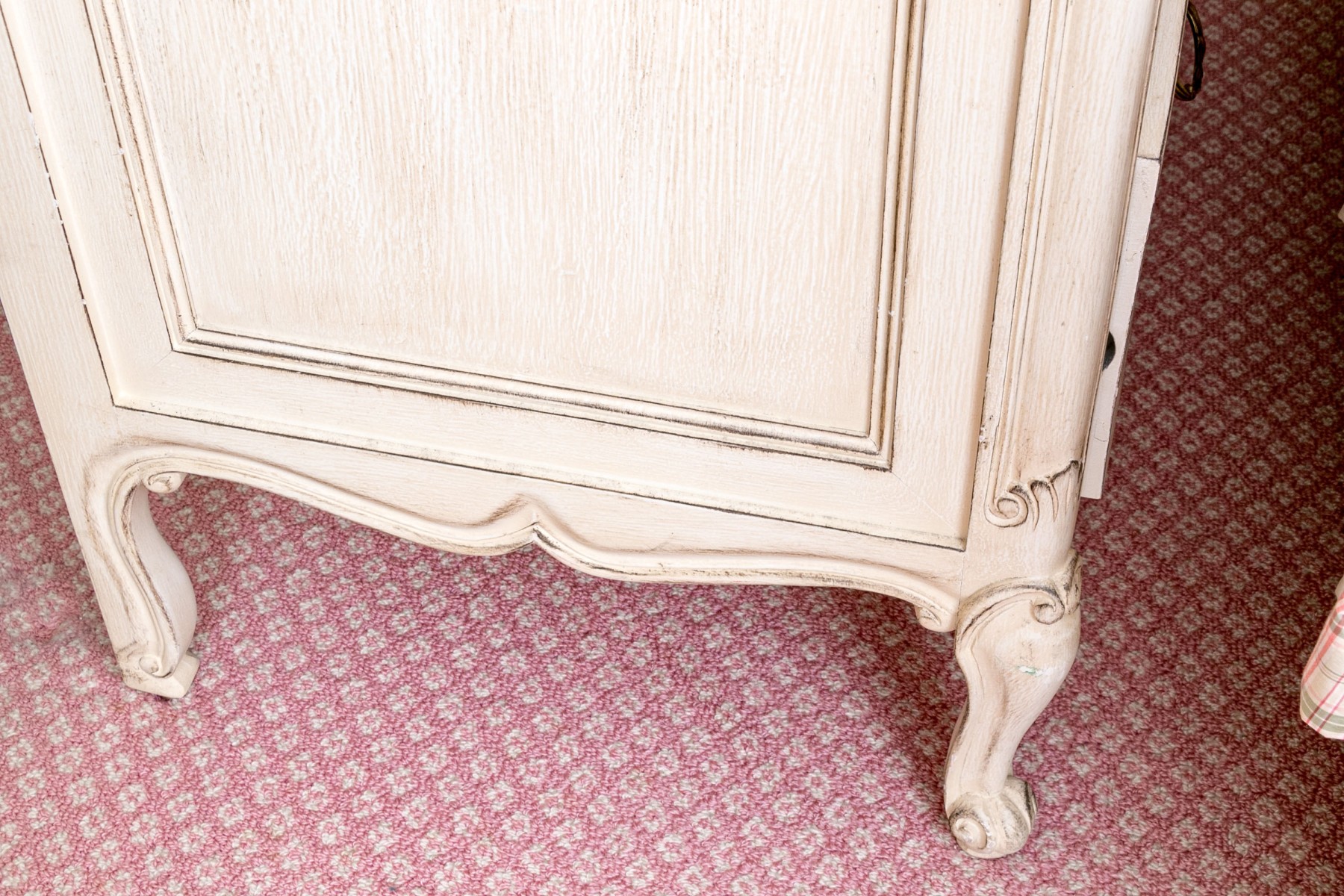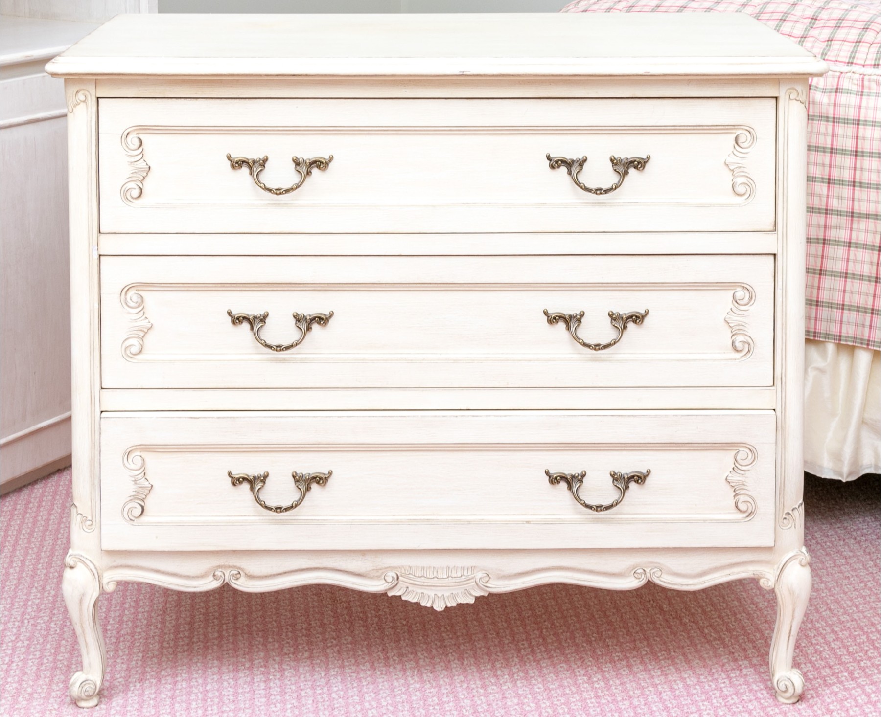 Wood laminate three drawer Provincial style chest with ornate bail pulls, and carved detail throughout, in distressed ivory finish.