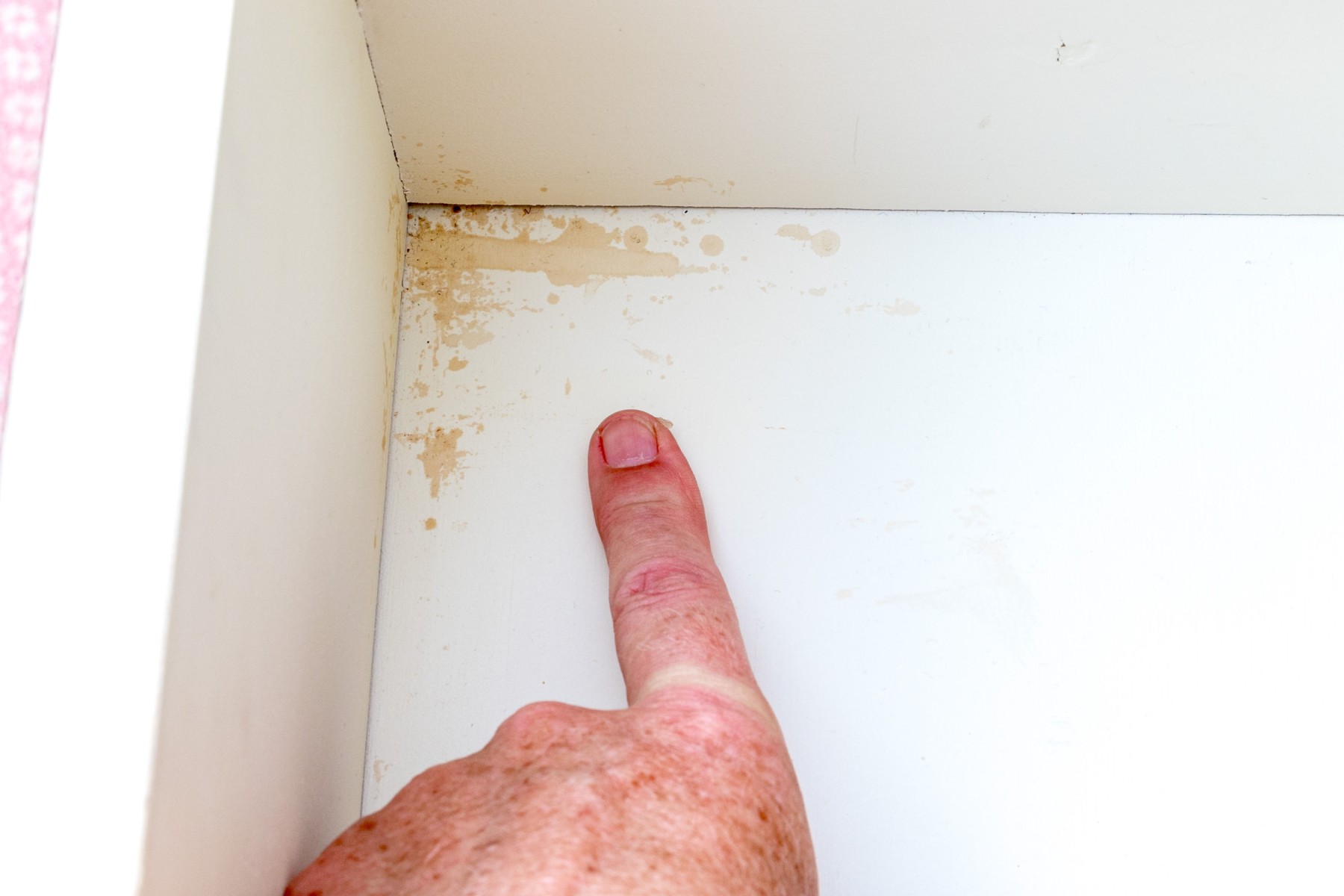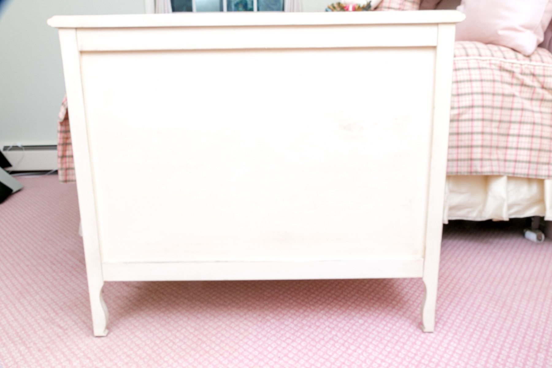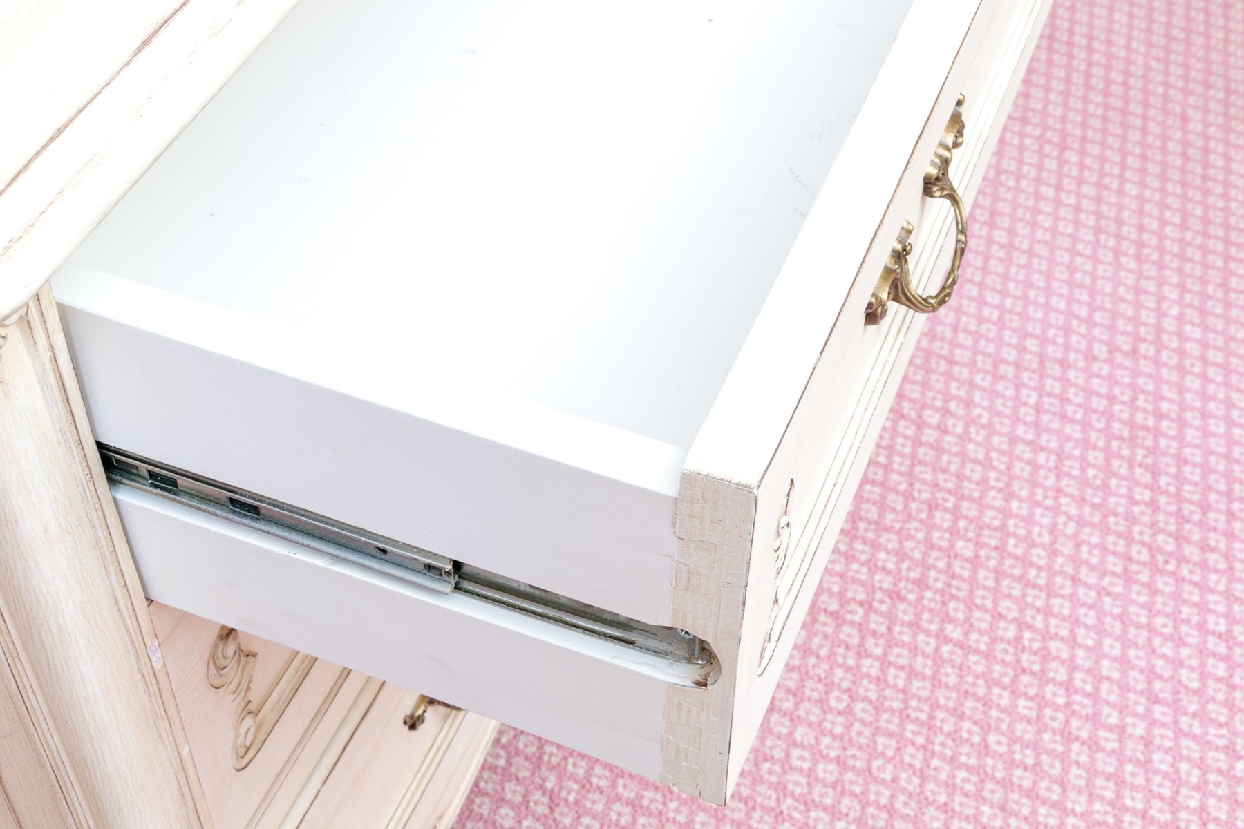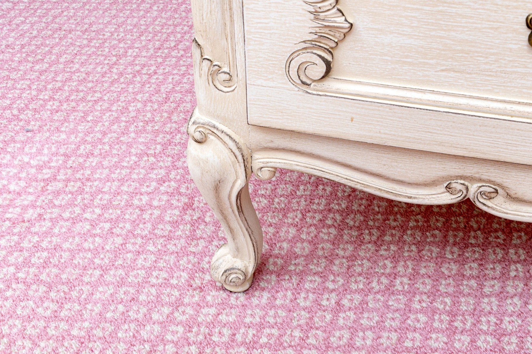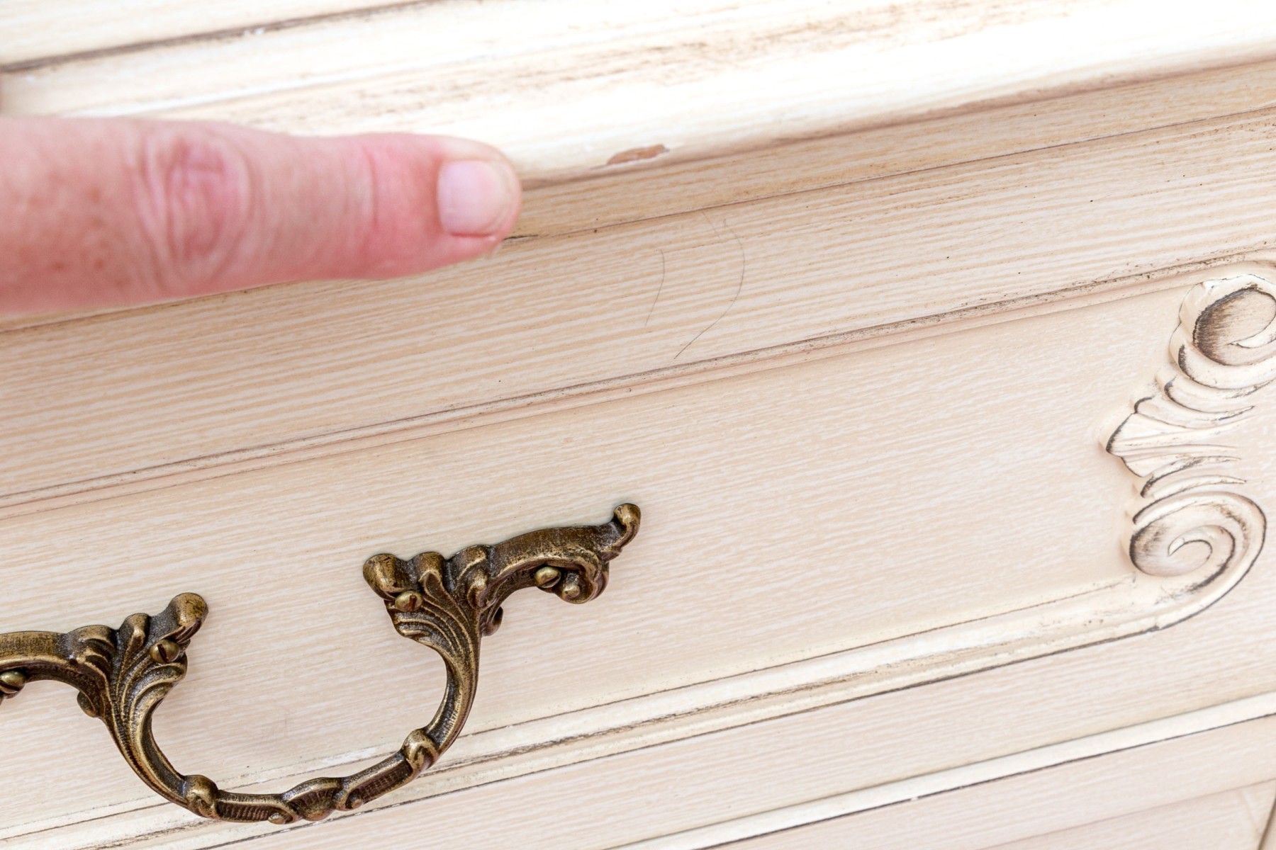 Wood laminate three drawer Provincial style chest with ornate bail pulls, and carved detail throughout, in distressed ivory finish.