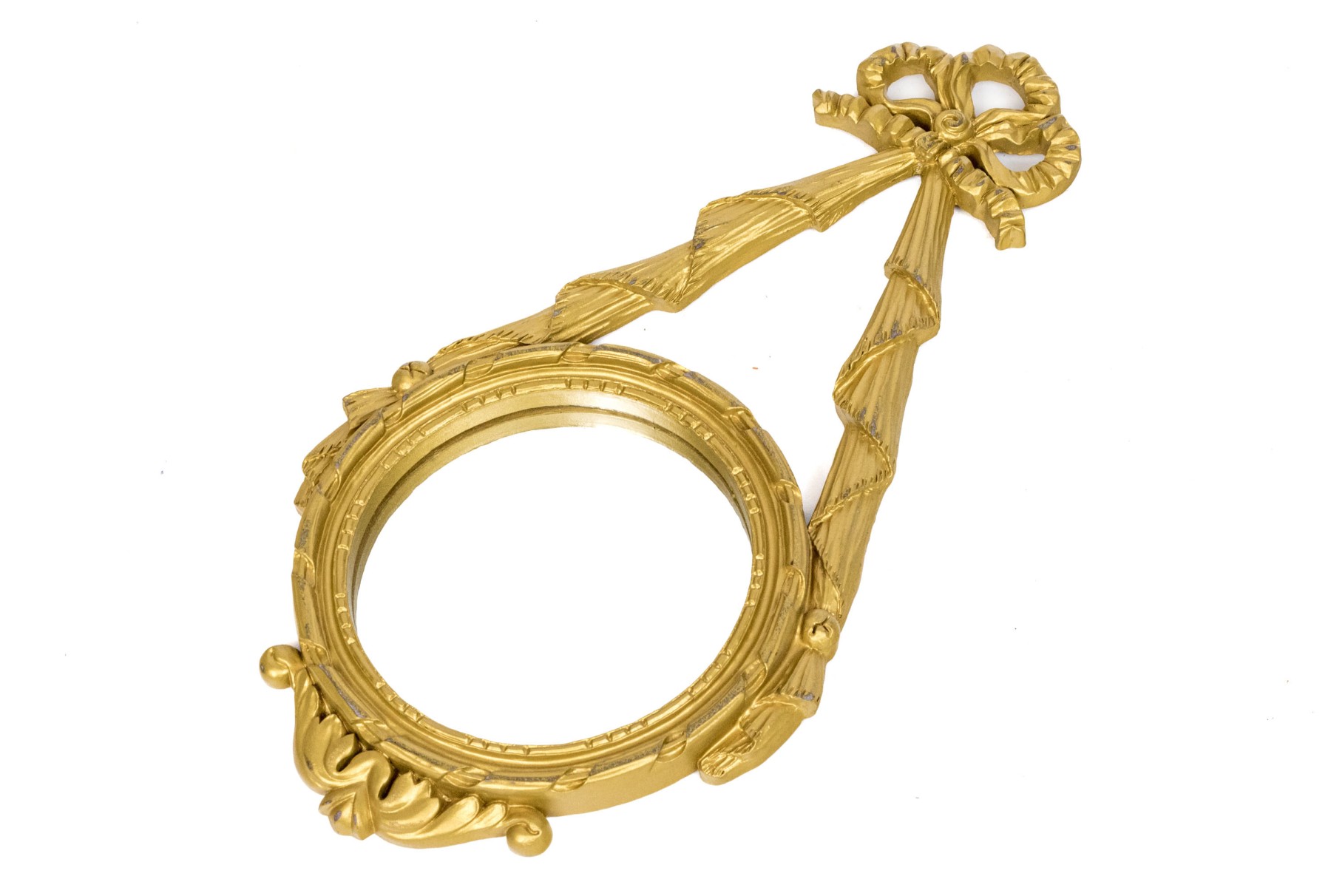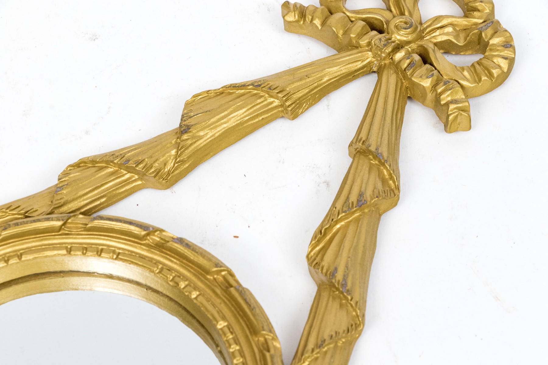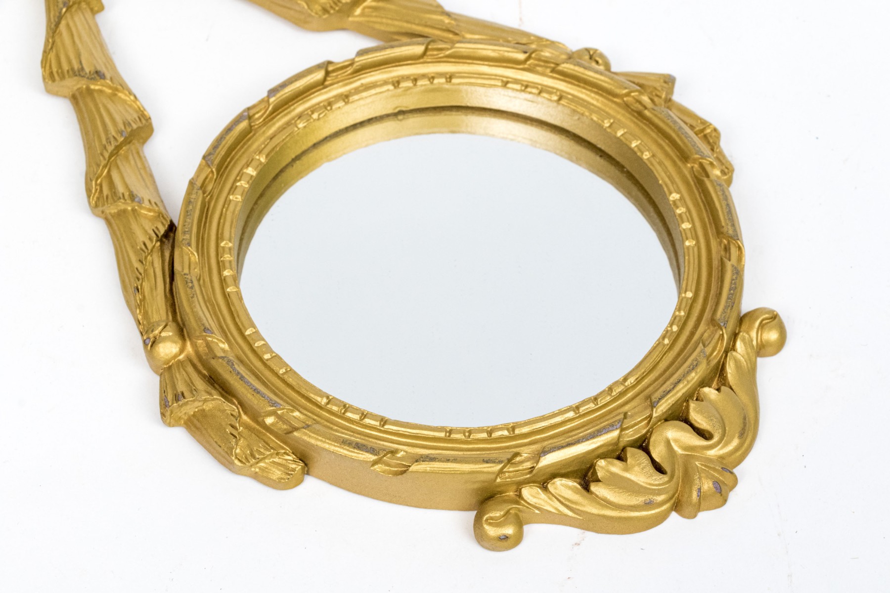 From Twos Company. A small round mirror with a French style ribbon twist surround and suspended by a bow topped folded faux fabric sides. And with a leafy terminal.