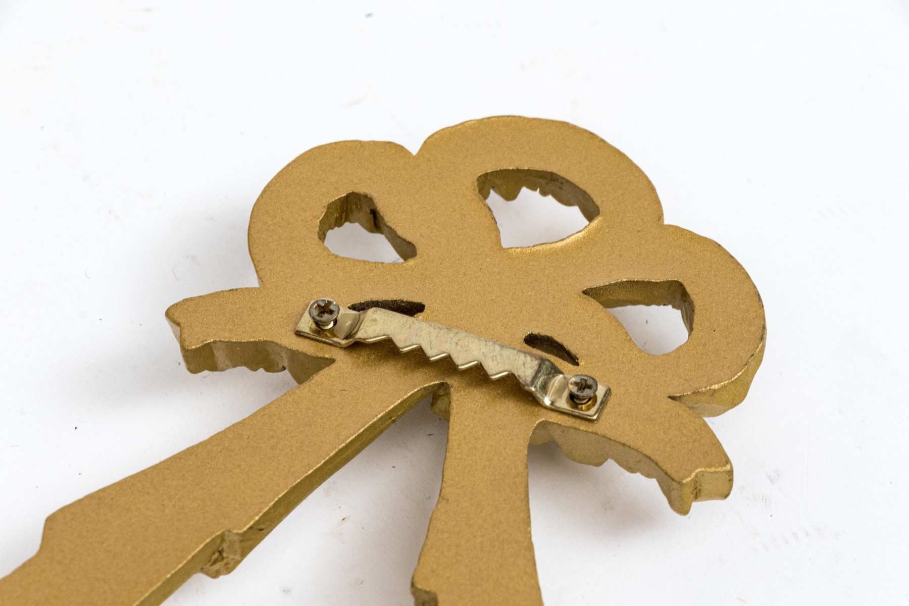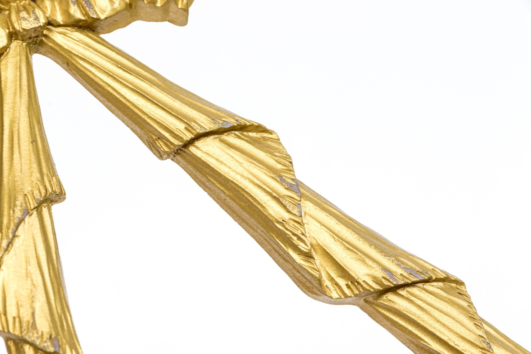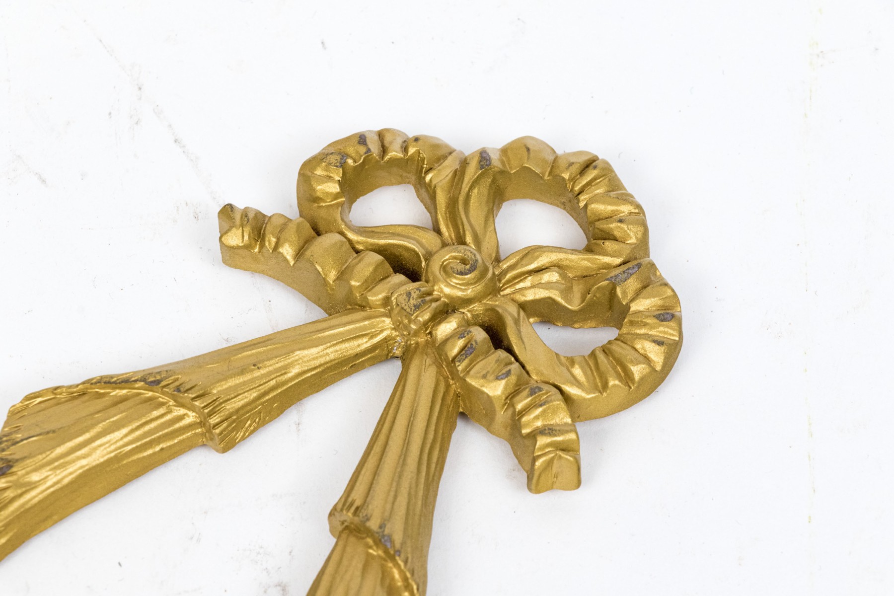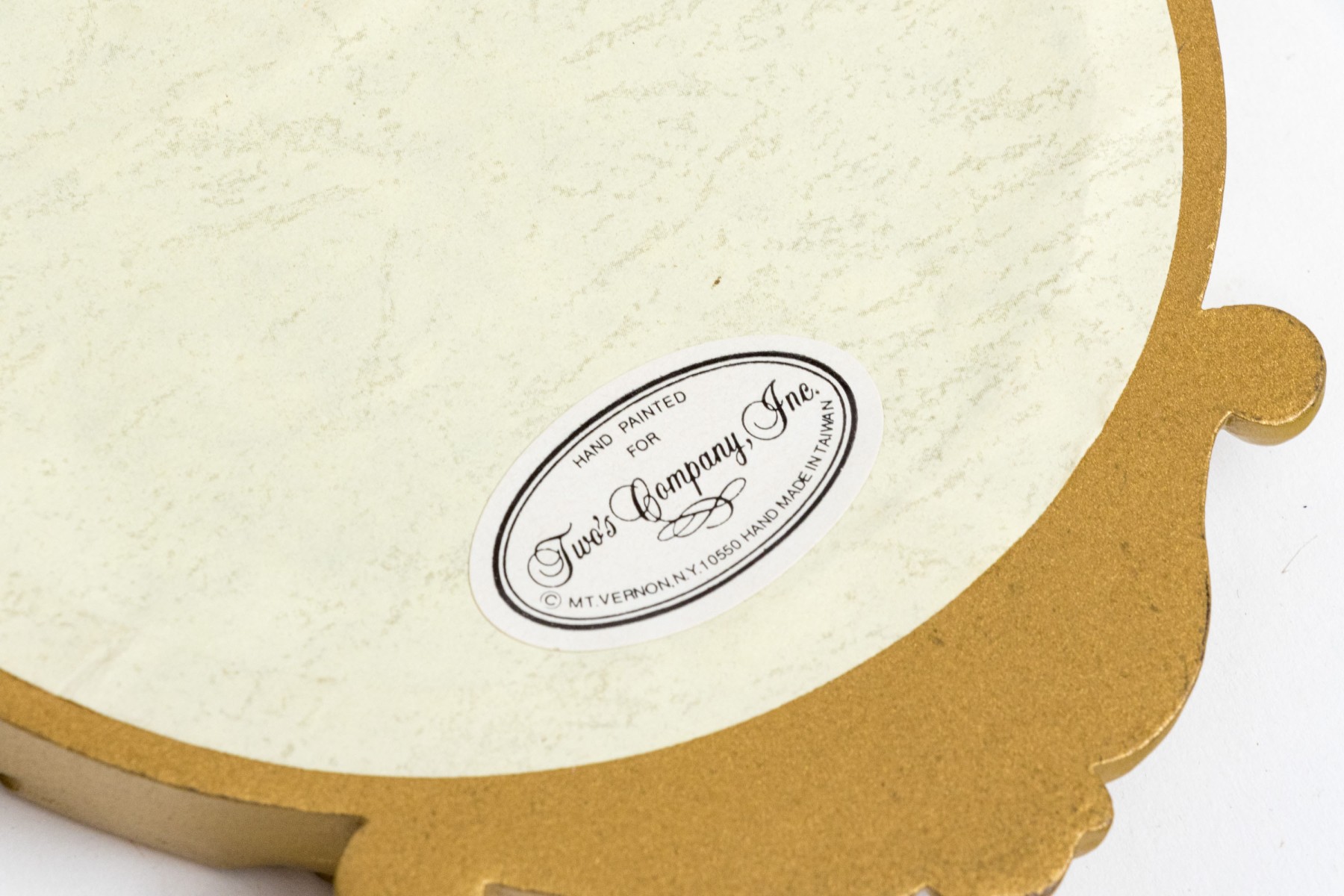 From Twos Company. A small round mirror with a French style ribbon twist surround and suspended by a bow topped folded faux fabric sides. And with a leafy terminal.