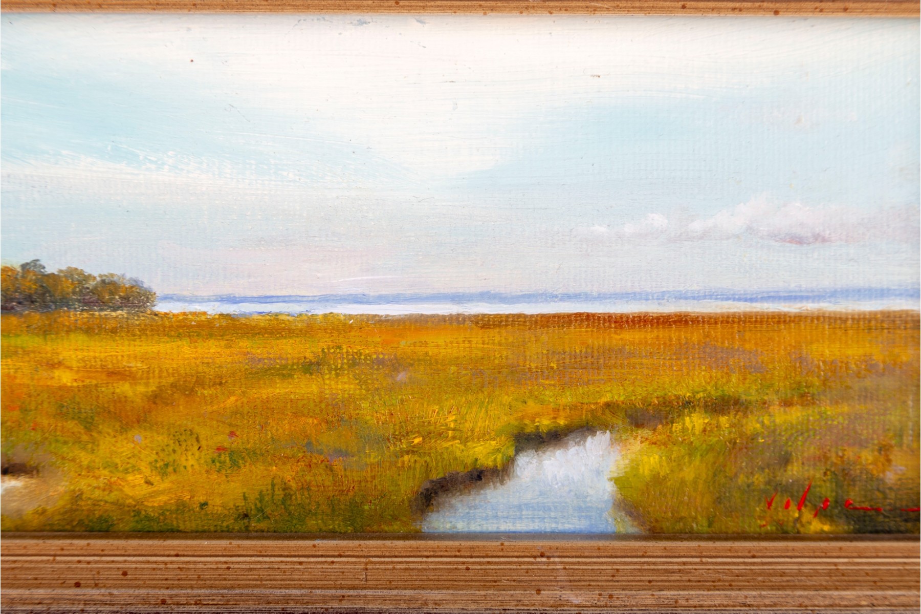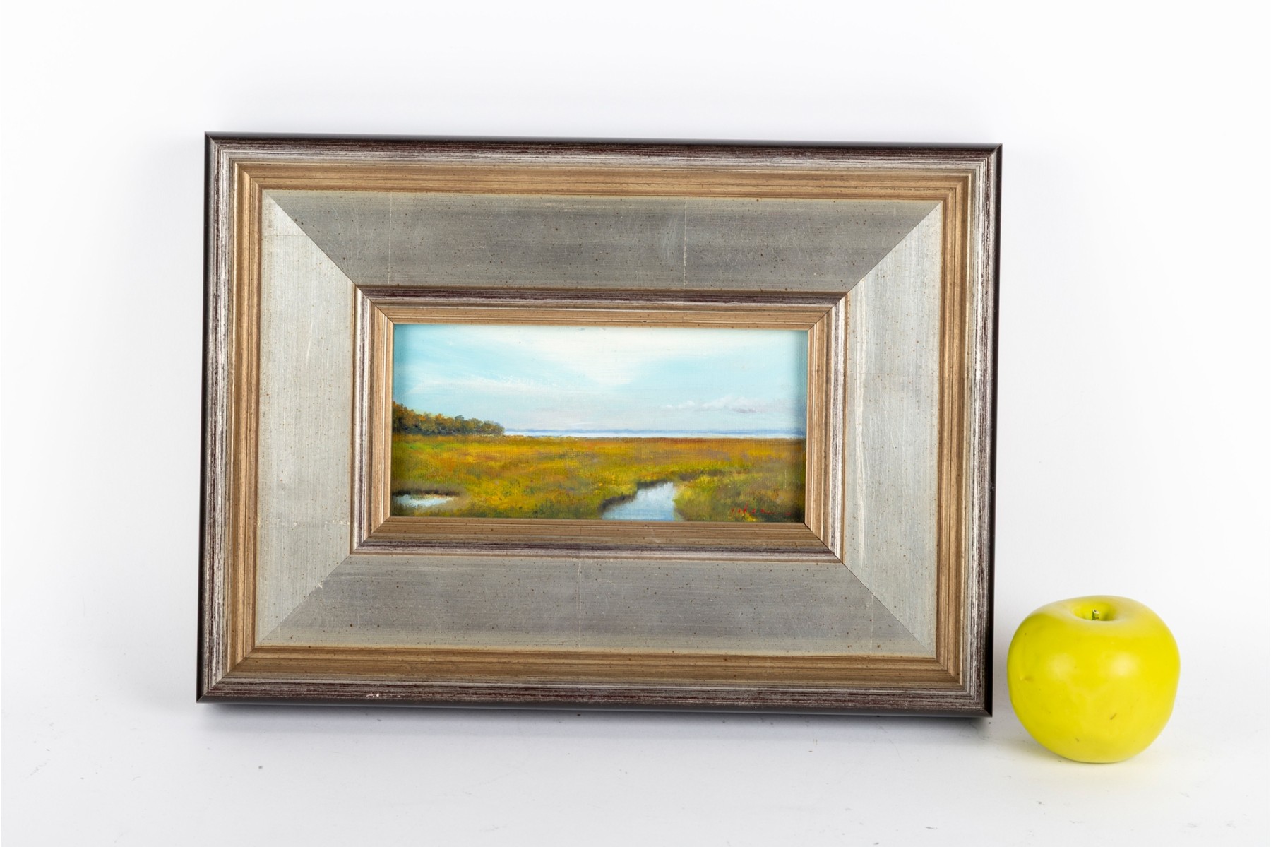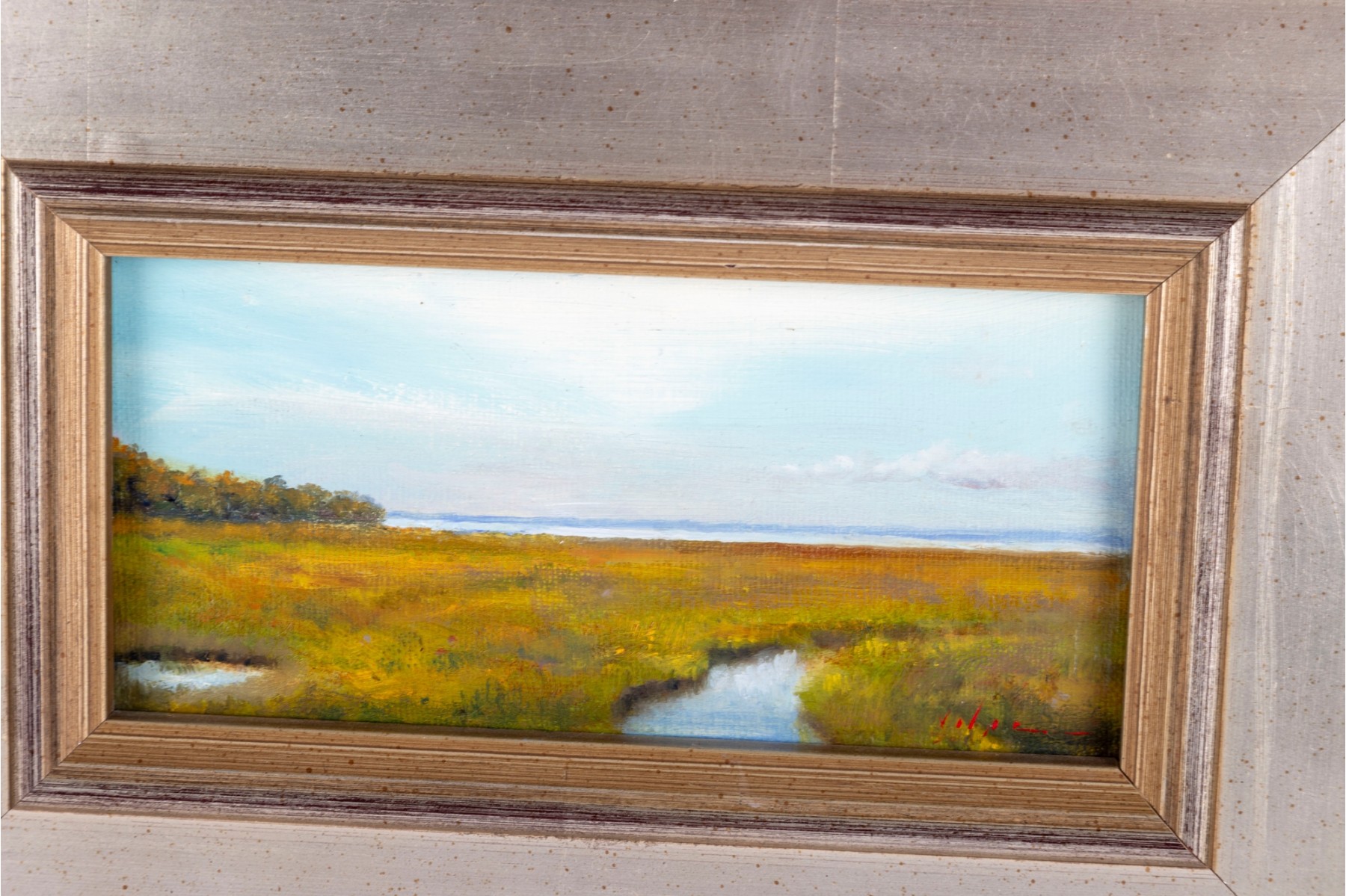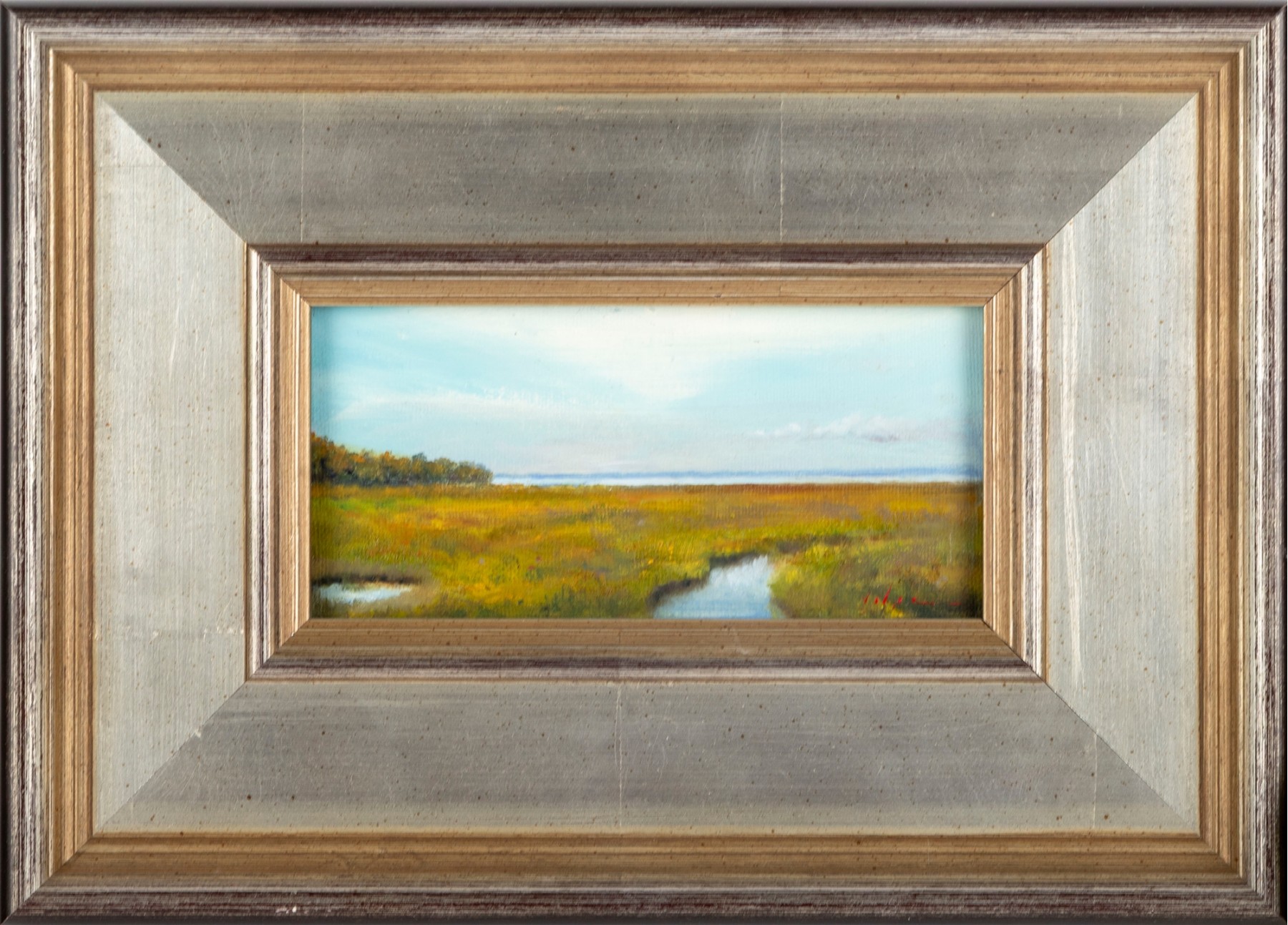 Compact oil on board artwork capturing a tranquil marshland scene. Indistinctly signed by the artist at the bottom right,and presented openly within a stylized wood frame.