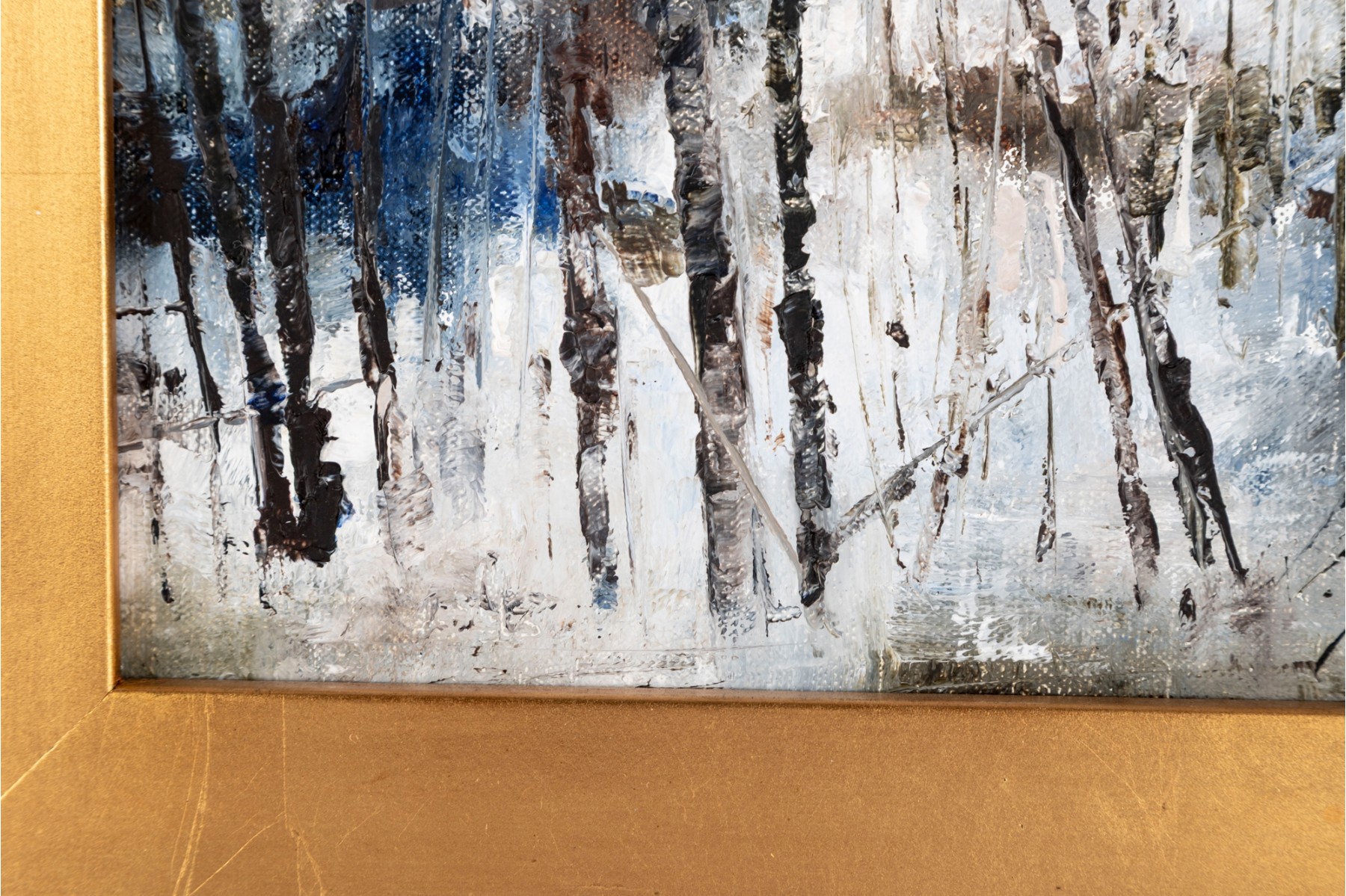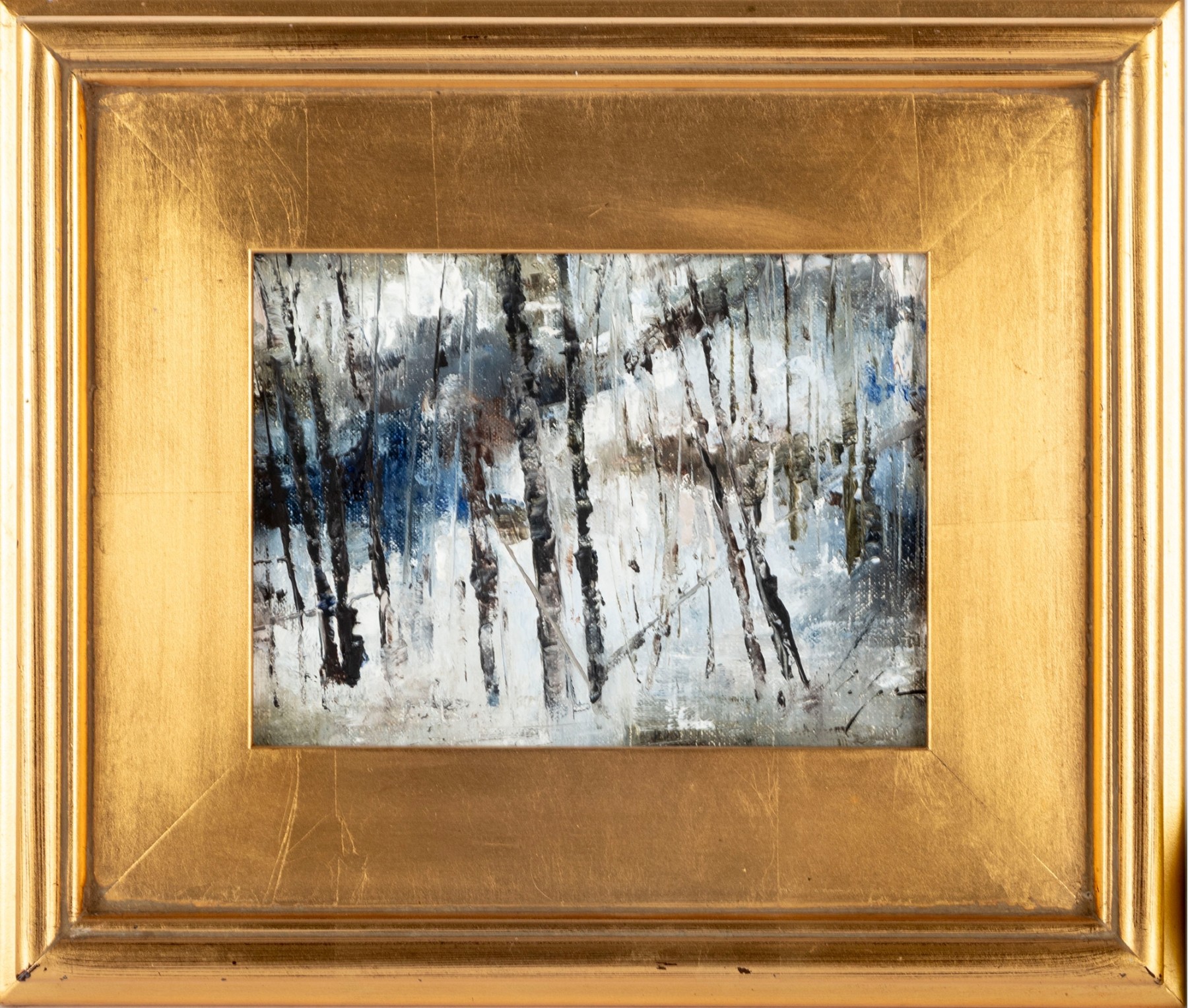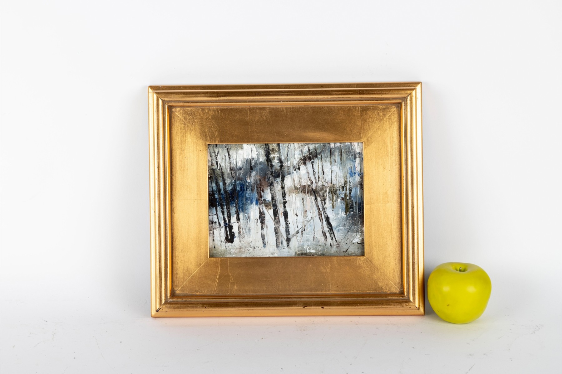 Compact oil on board artwork portraying a semi-abstract view of snow-covered woodlands. Expressive brushstrokes and a muted palette evoke a quiet, wintry atmosphere. The artwork is presented openly within a a gold-tone frame.