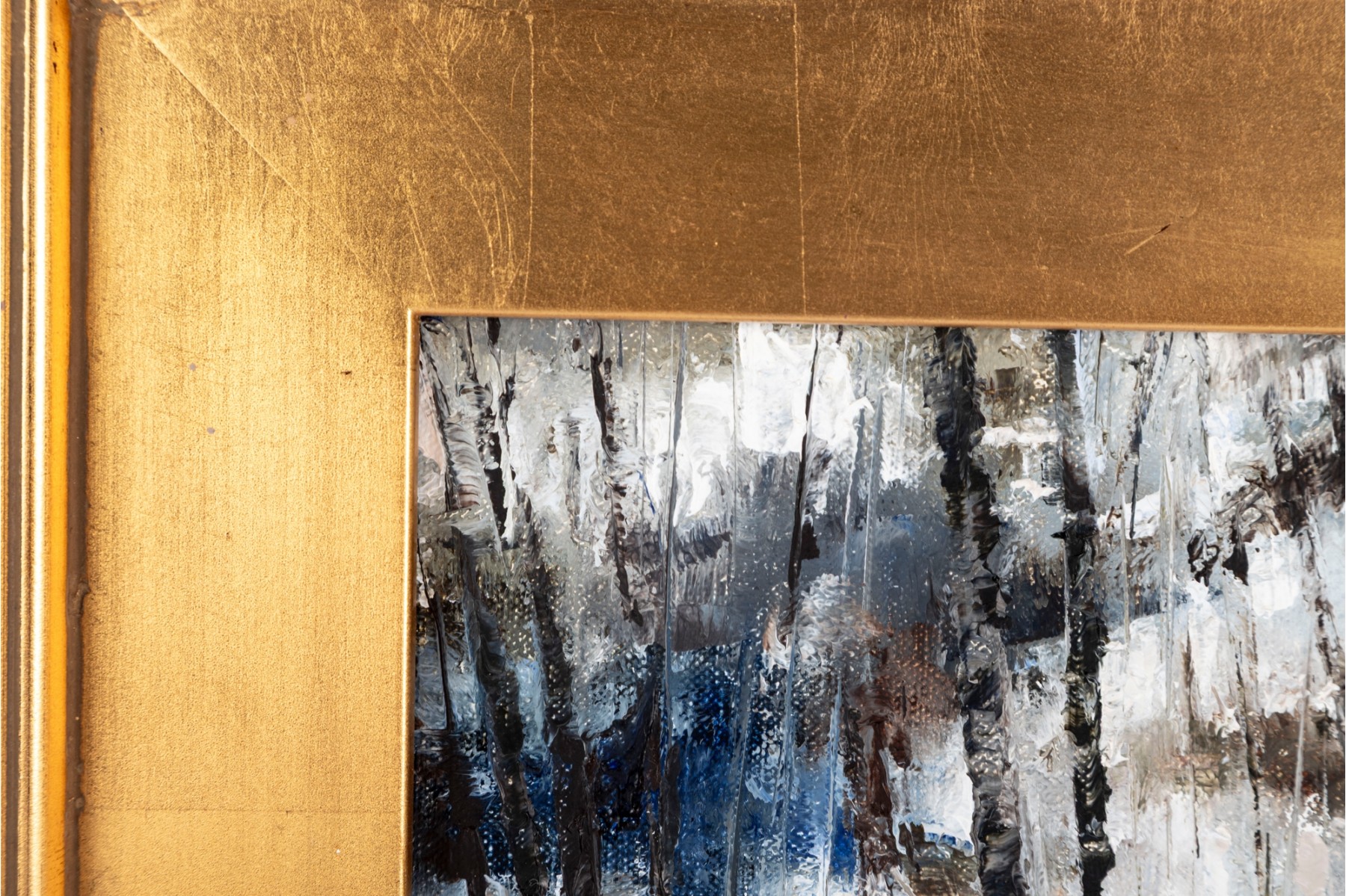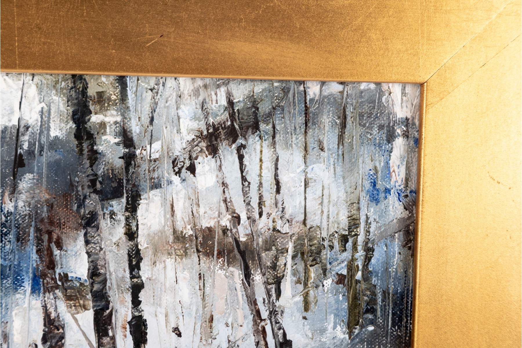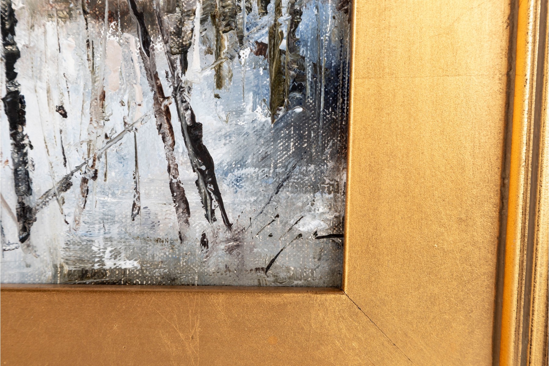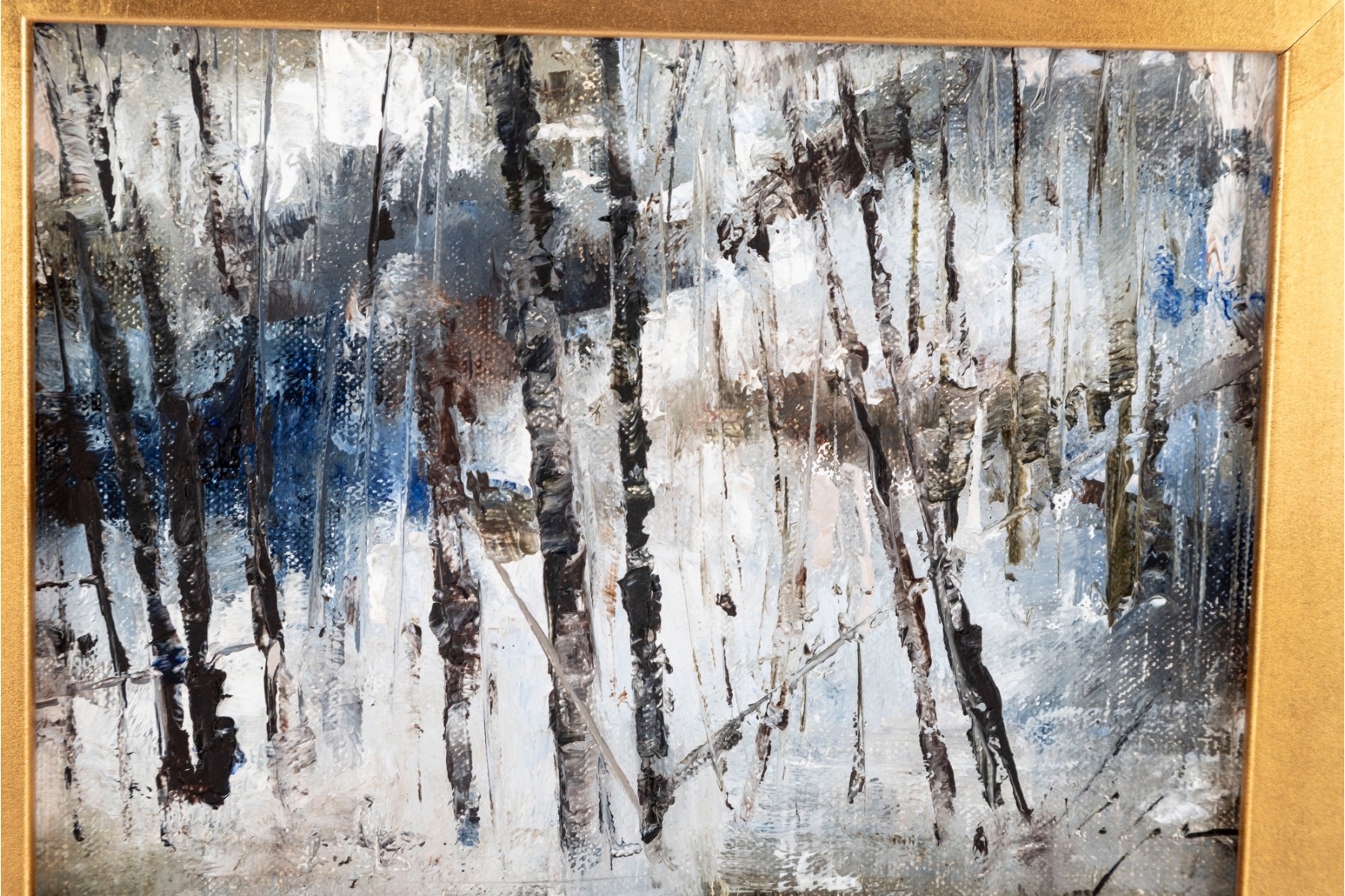 Compact oil on board artwork portraying a semi-abstract view of snow-covered woodlands. Expressive brushstrokes and a muted palette evoke a quiet, wintry atmosphere. The artwork is presented openly within a a gold-tone frame.