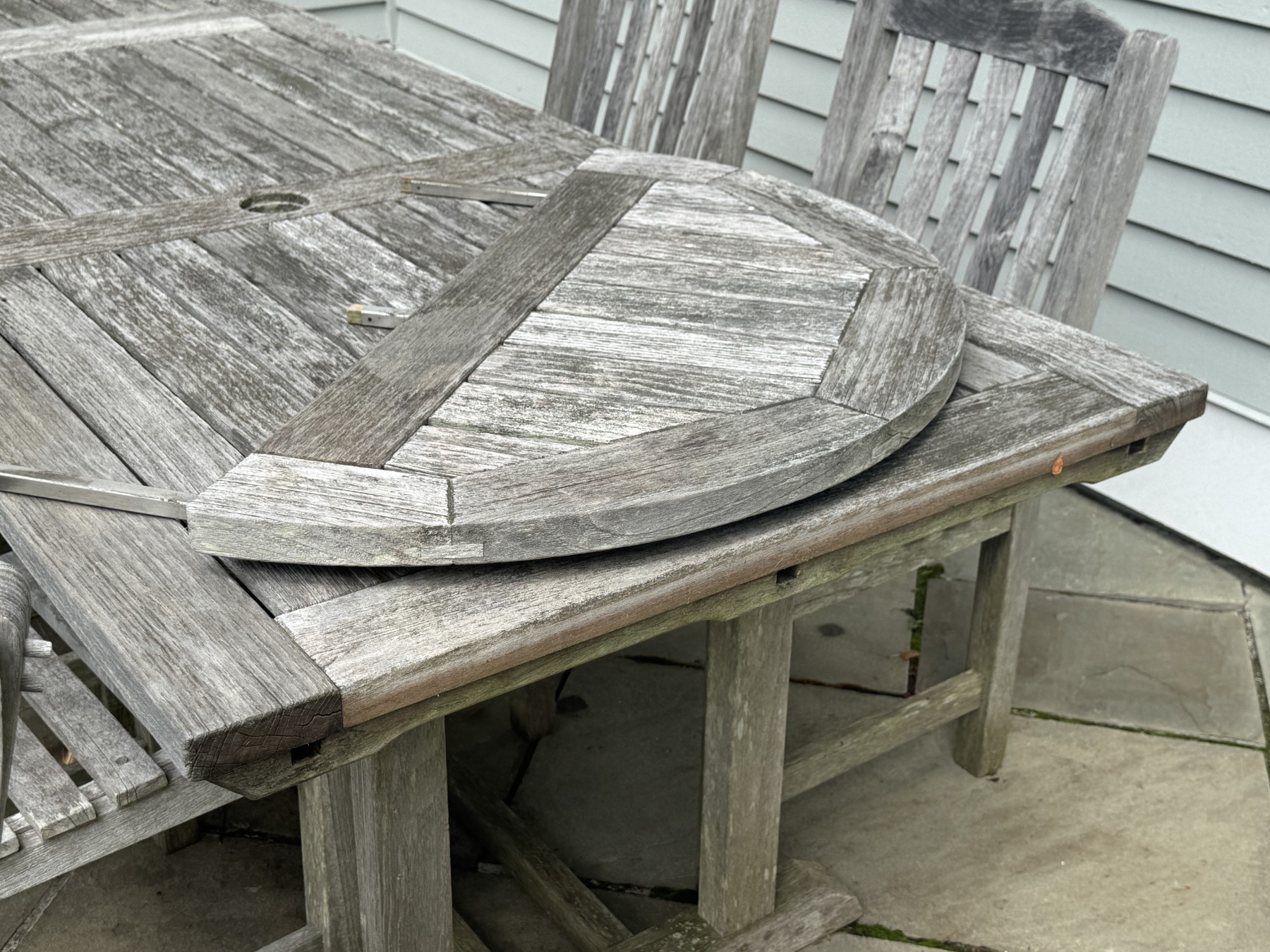 A high quality Smith and Hawken teak outdoor dining table in rectangular form with a planked top and banded edges over a trestle base. Includes two demilune extension leaves attaching to the ends with poles that slide into slots. Accompanied by six dining chairs including two armchairs and four side chairs.
