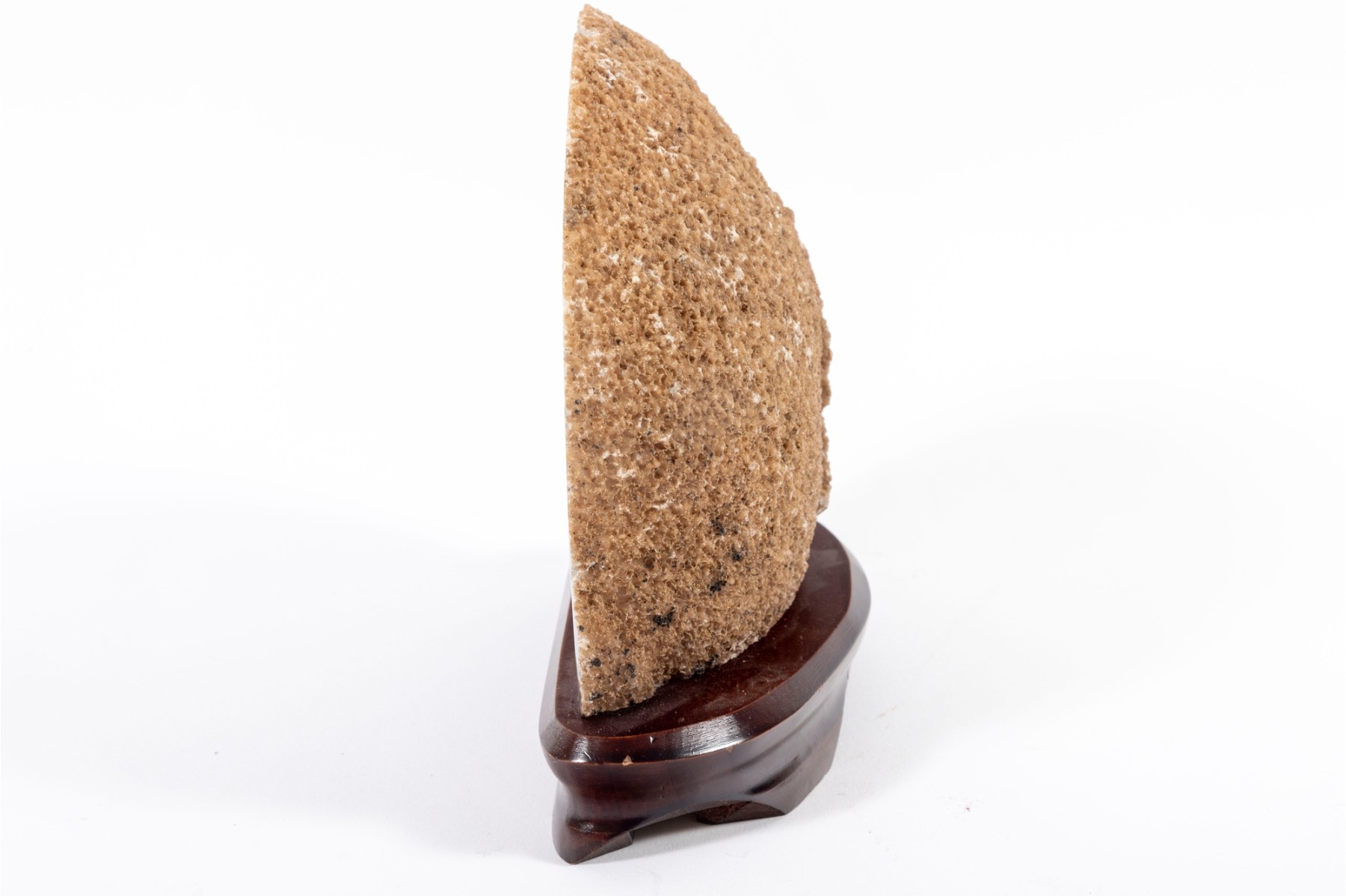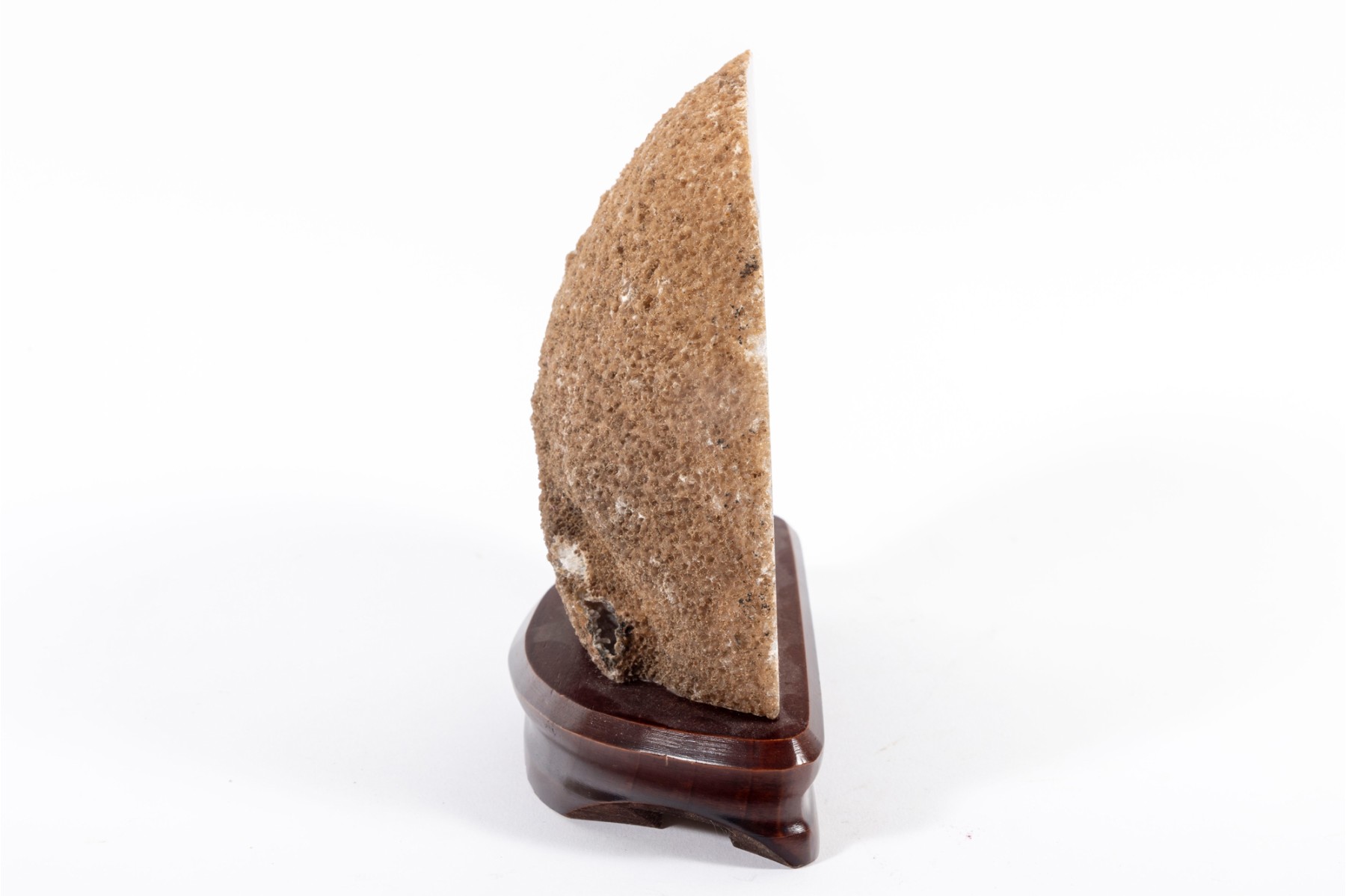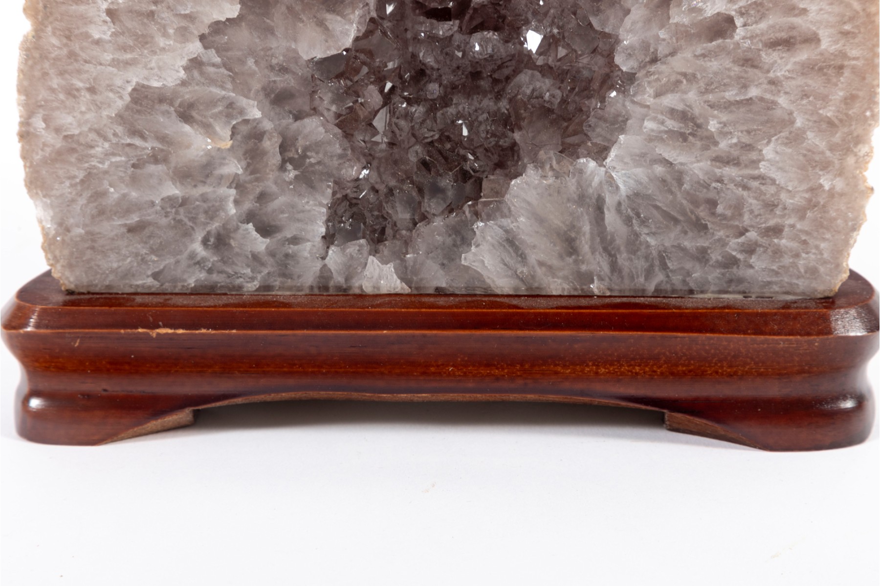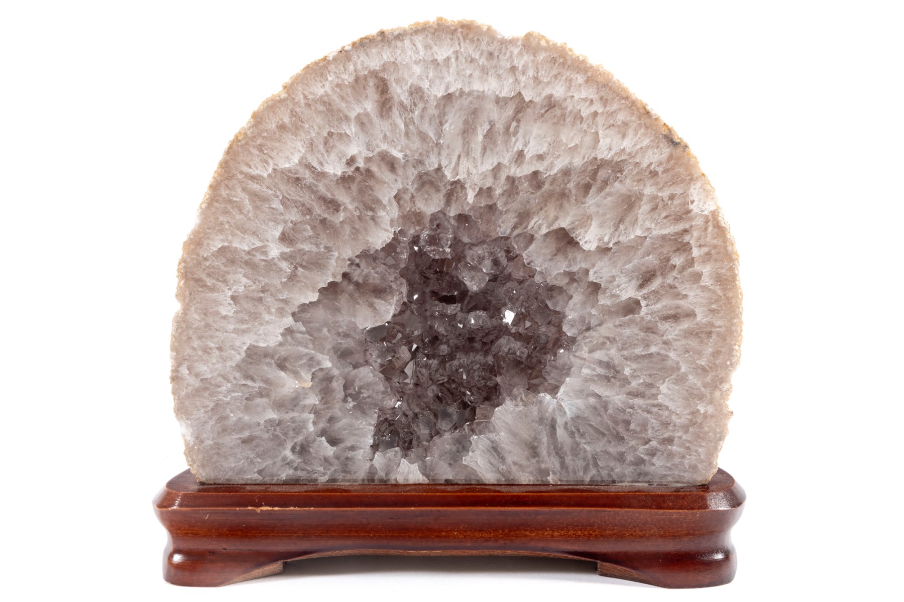 A beautiful polished geode slice exposing an exemplary pocket of smokey quartz crystals. The exterior is left natural to accentuate the mineral, and is mounted to a wooden display stand.
